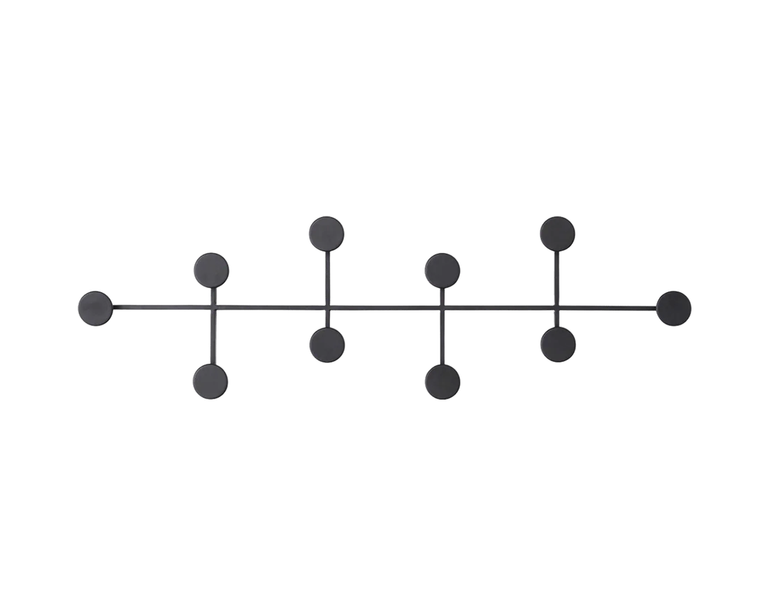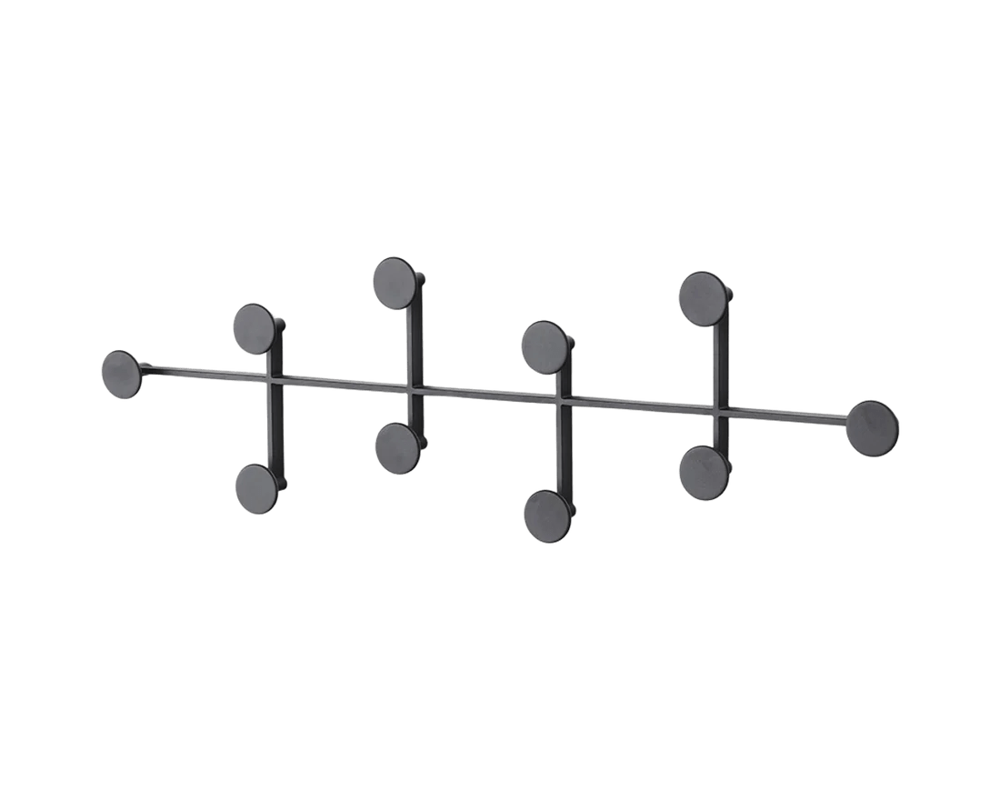 What makes the Afteroom genuinely useful beyond just looking good is how those circular dots provide enough surface area to hold items securely without clothes sliding off like they do on single hooks. The spacing between dots is generous enough that coats don't bunch together awkwardly, and the powder-coated finish is durable enough to handle daily use without showing wear from bags and keys. The ability to mount it vertically opens up options for narrow walls beside doorways or in tight entryways where horizontal racks wouldn't fit. The minimalist design means it doesn't compete visually with other decor - it just quietly does its job while adding that geometric interest that makes walls feel more considered. Available in powder-coated metal finishes that work whether you're going for black to disappear against dark walls or lighter tones that create subtle contrast.