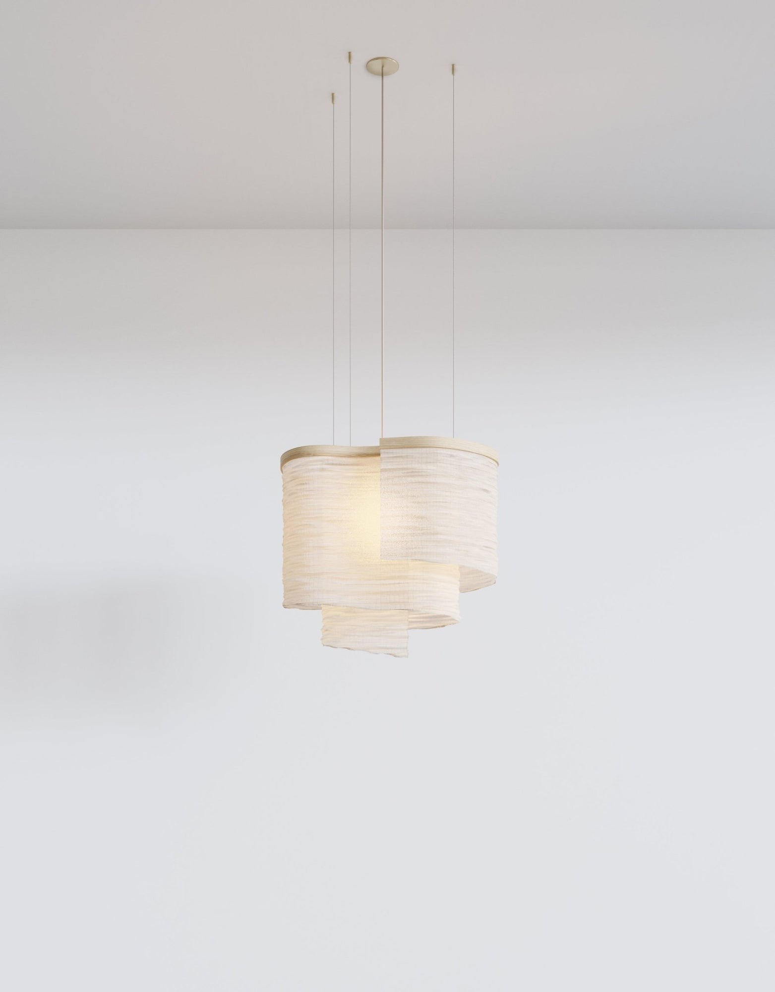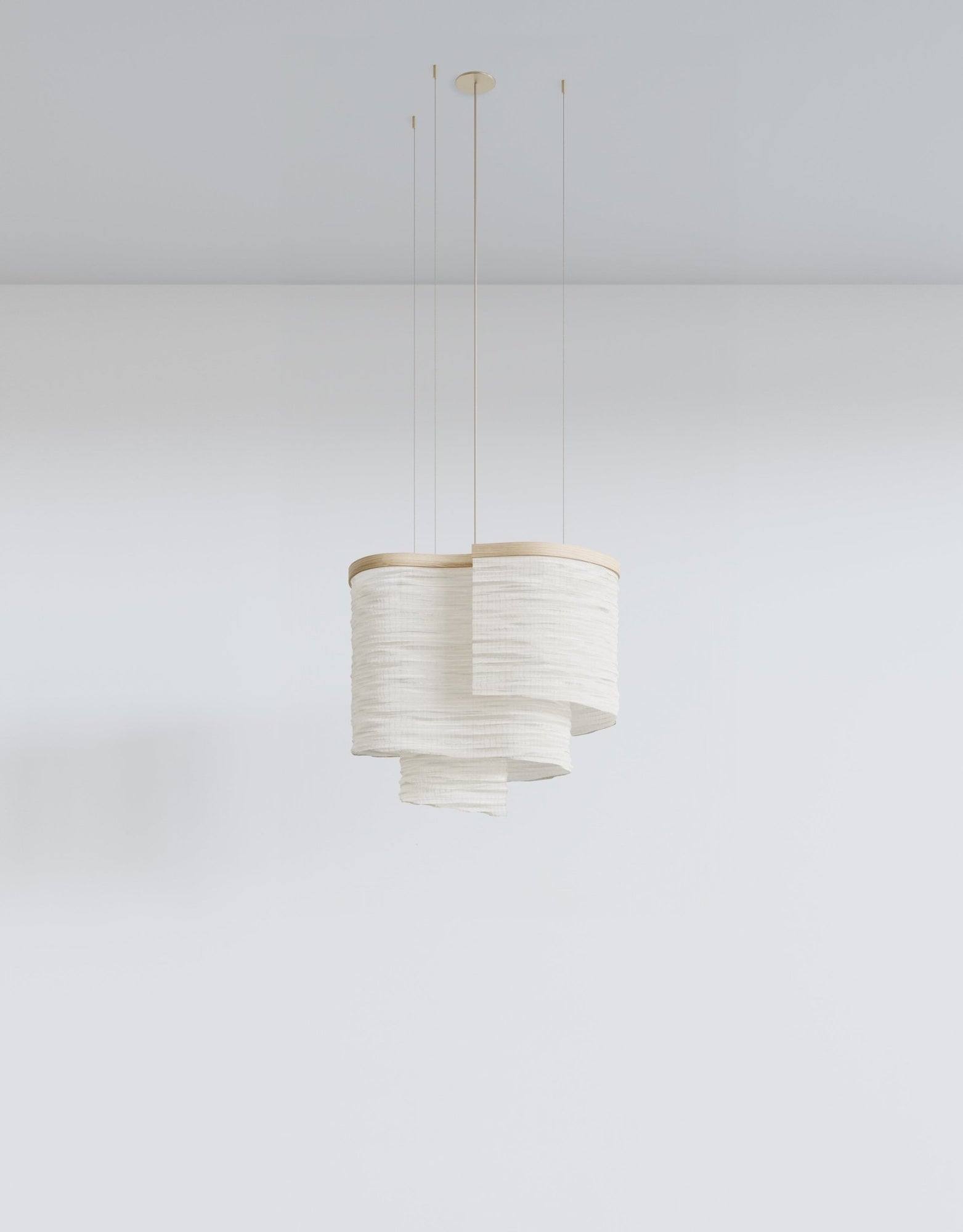 The L&G Altostratus 02 showed up when Ladies and Gentlemen Studio decided pendant lights didn't need to be glass globes or metal shades on repeat. They built this sculptural fixture around a natural ash wood frame wrapped with textile - creating this soft, cloud-like form that floats overhead instead of hanging there like traditional pendants. The name comes from altostratus clouds, those mid-level gray sheets that diffuse sunlight, which pretty much sums up what the fixture does with light. The textile shade softens and disperses the glow instead of directing it harshly downward, giving you that warm ambient lighting that makes rooms feel comfortable rather than just bright. Brass hardware and bronze suspension cables add subtle metal accents without dominating the overall look, and the khaki cord blends into most ceiling colors better than stark white or black cables do.