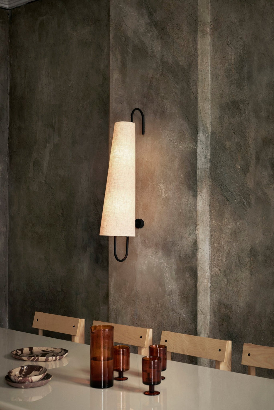 The Ancora Wall Lamp derives its name from the Italian word for ‘anchor’, drawing inspiration from its distinctive shape. The warm and textured textile lampshade beautifully contrasts its powder-coated iron frame, resulting in a poetic and vintage-inspired expression. This design effortlessly balances lightness and materiality, creating an enchanting ambiance in any space.