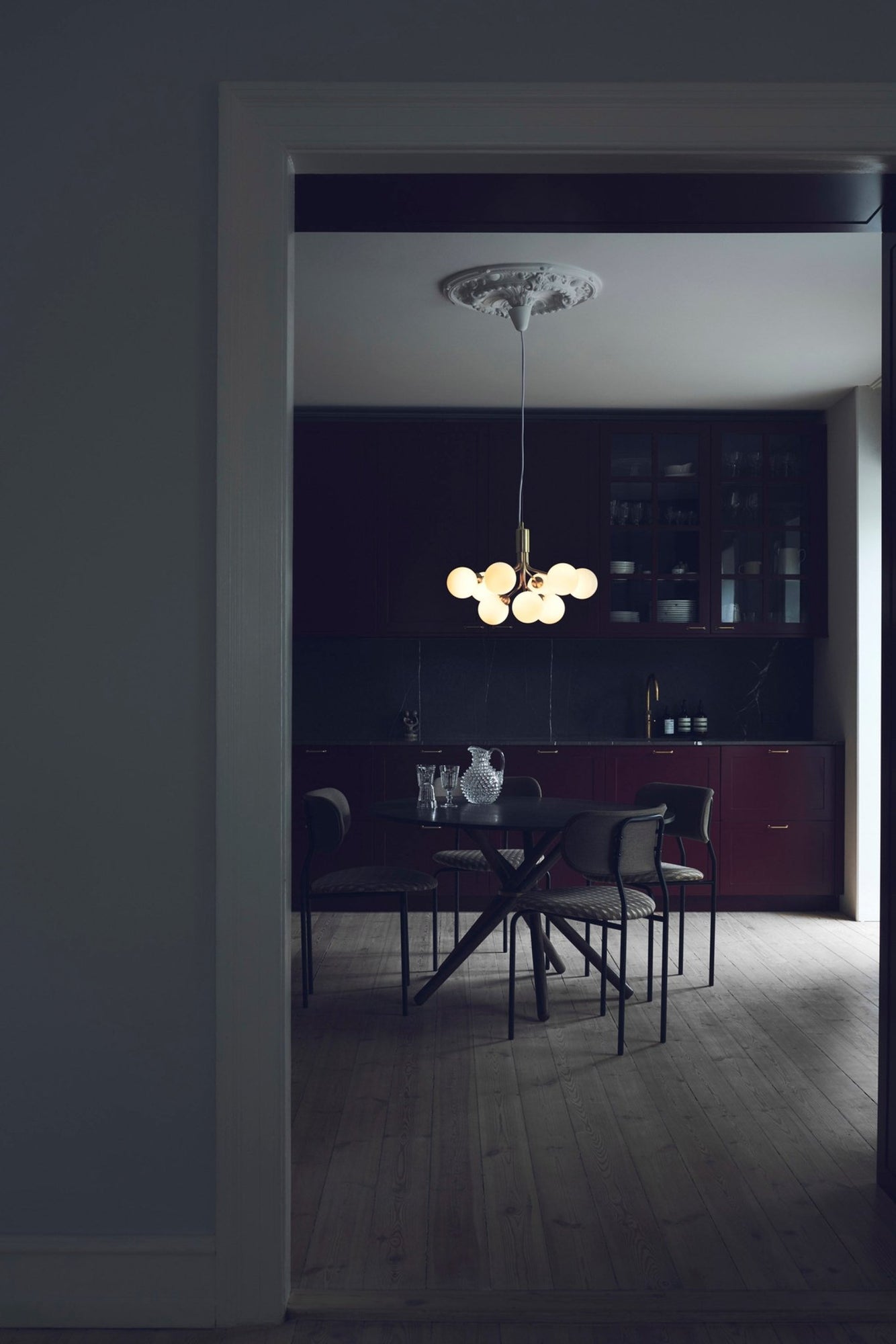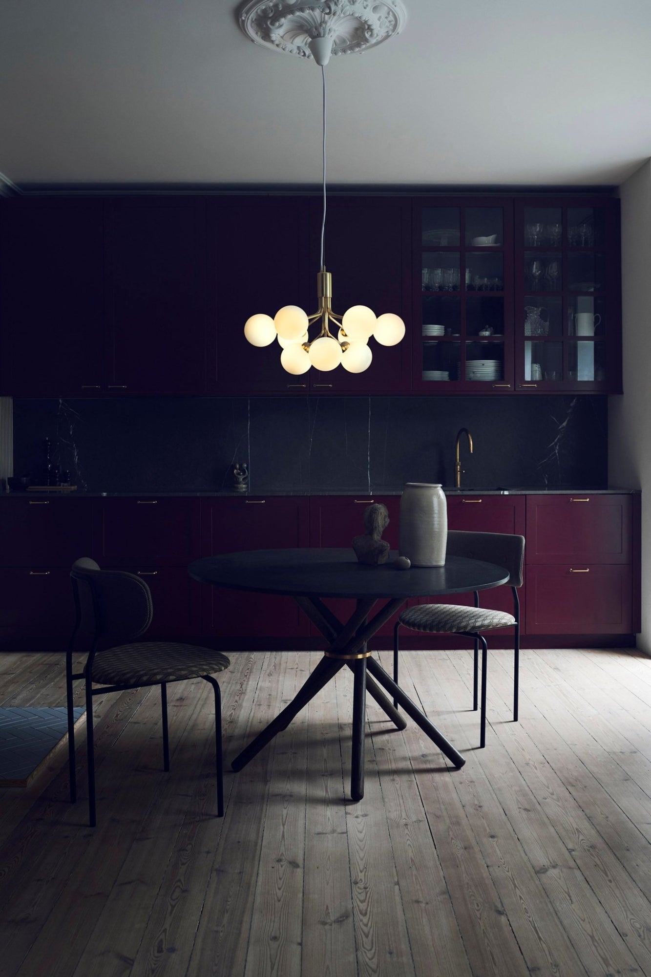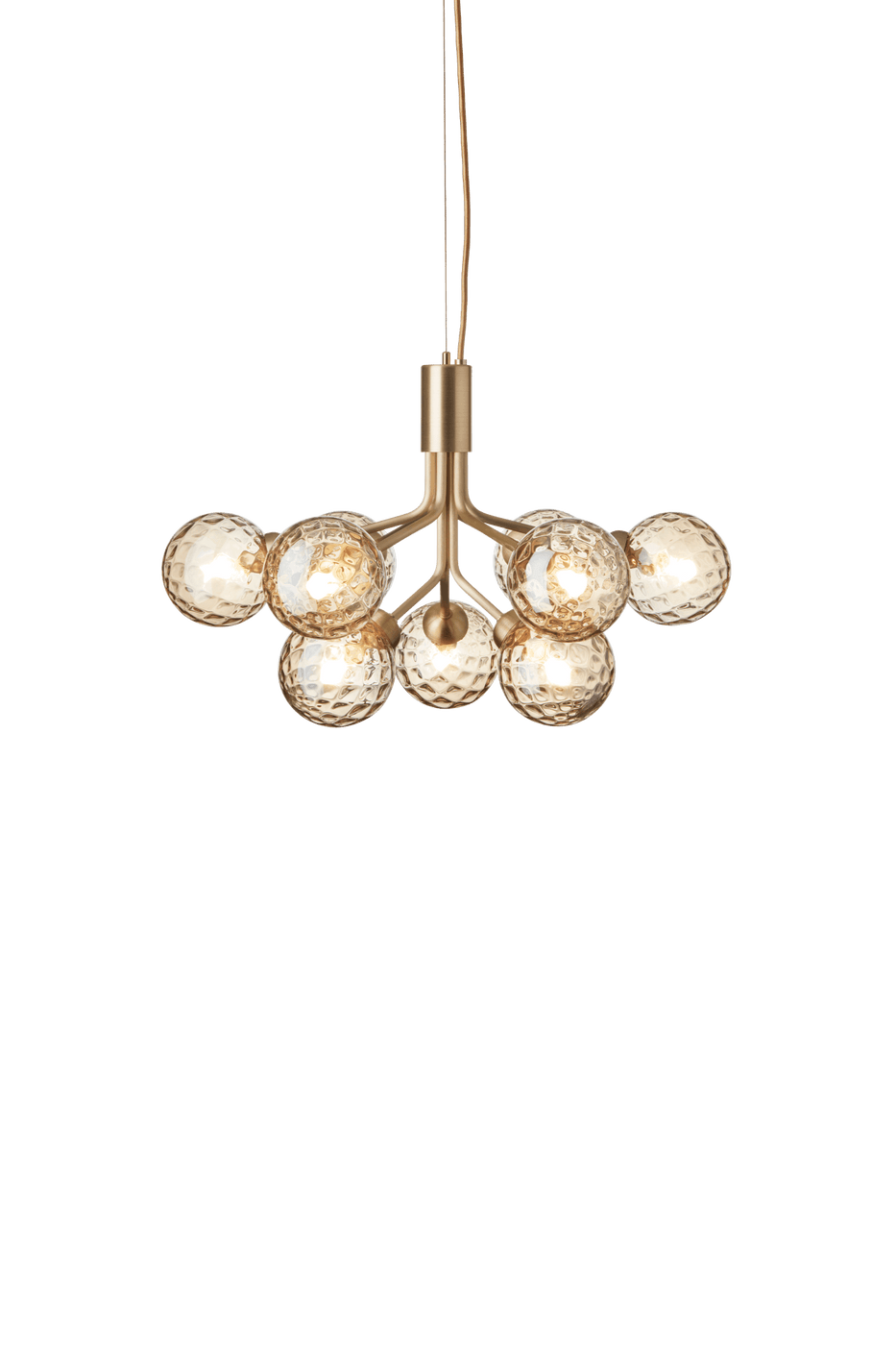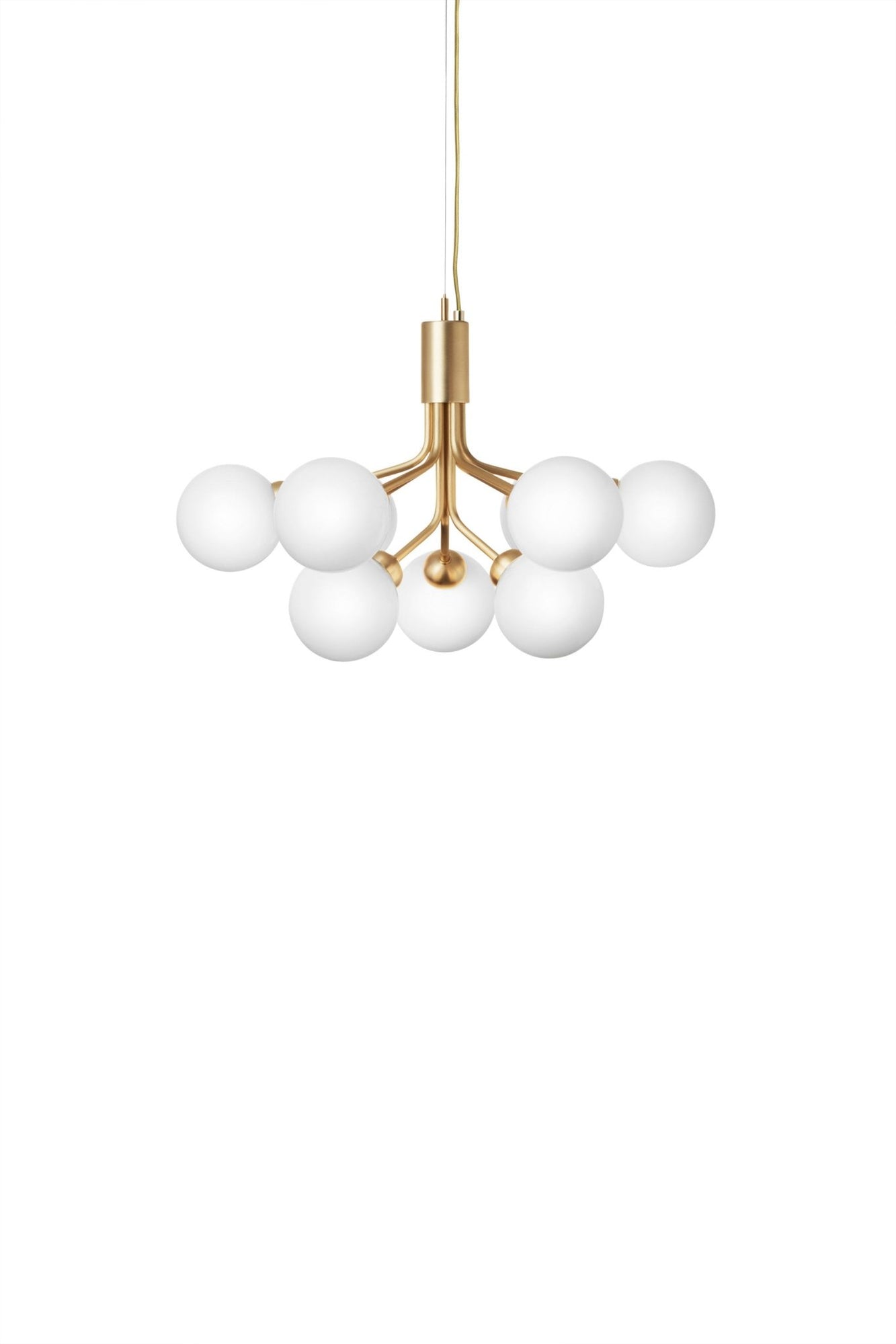 The Nuura Apiales 9 Pendant draws inspiration from blooming flower stems. Its eighteen mouth-blown glass globes extend from a central structure in graceful tiers, creating a sculptural and airy effect. Available in brushed brass or satin black, it makes a stunning statement. Whether hung above a round coffee table or used as a dining room chandelier, the Apiales 18 Pendant transforms everyday lighting into modern art. Not only is it elegant, but the Nuura Apiales 9 Pendant is also incredibly versatile. It works beautifully in a variety of interiors—pair it with Scandinavian furniture, suspend it above a media console, or let it glow beside a modern sofa. Because of its airy silhouette, it doesn’t overwhelm the space. Additionally, it functions well as a luxurious bathroom light fixture, offering soft, ambient light that enhances any setting. Crafted by Danish brand Nuura, the Apiales 18 Pendant reflects a deep respect for light, nature, and human connection. Founded in 2017, Nuura combines modern aesthetics with traditional Scandinavian design. Their lighting collections, inspired by nature and built to last, enrich both private homes and public spaces. Whether styled next to a tea kettle, a wine glass, or placed above a credenza, Nuura pieces create a warm and timeless atmosphere.
