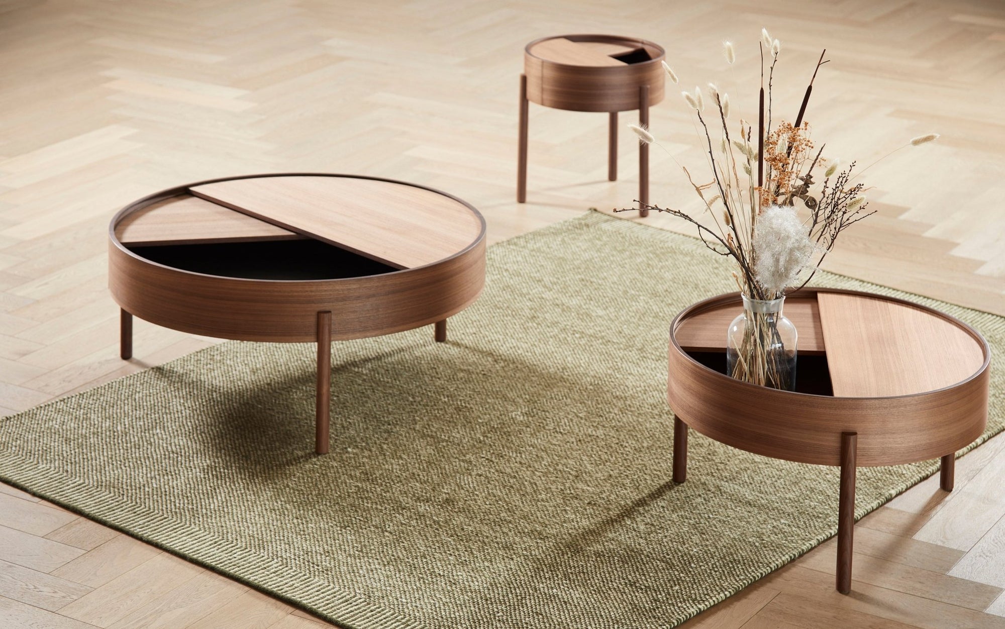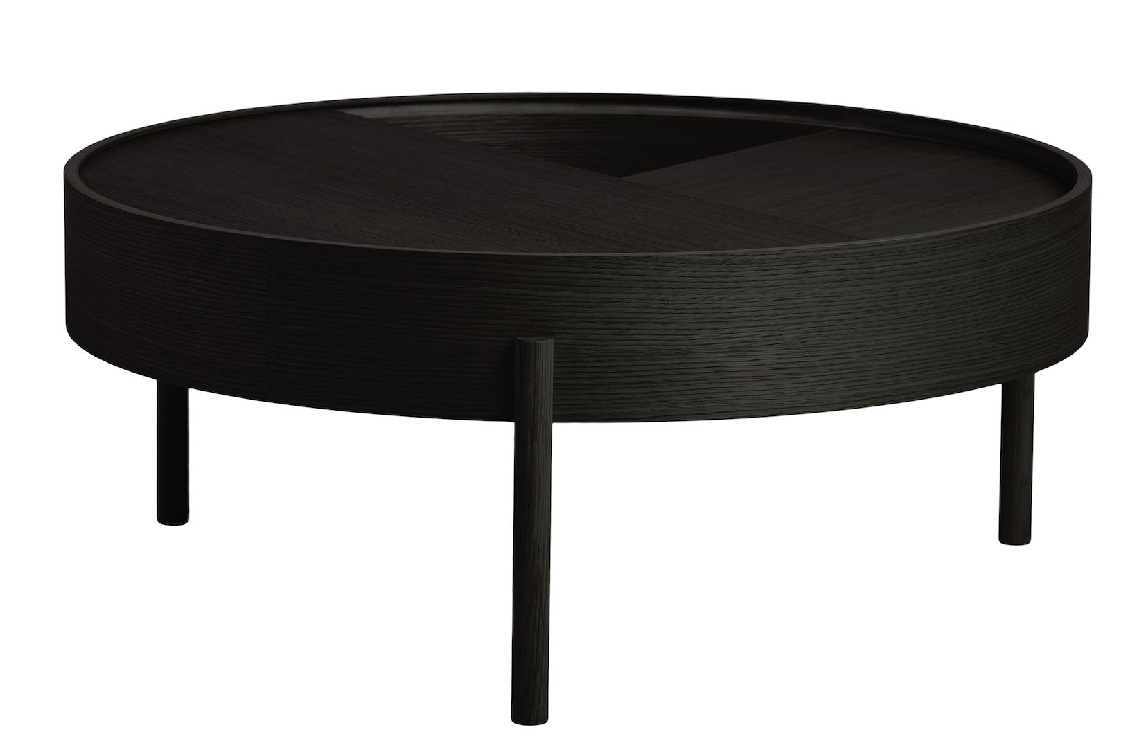 ARC takes its name from the mathematical concept of a smooth curve joining two points in a circle. The designers behind Arc wanted to create a beautiful table series with space to hide your mess. By simply rotating half of the circular lid, the expression of the table is ever changeable. The surface on the inside storage space is covered with a smooth nanolaminate to complement the ash wood while the three-legged construction adds a playful and light touch to the geometric shaped design.