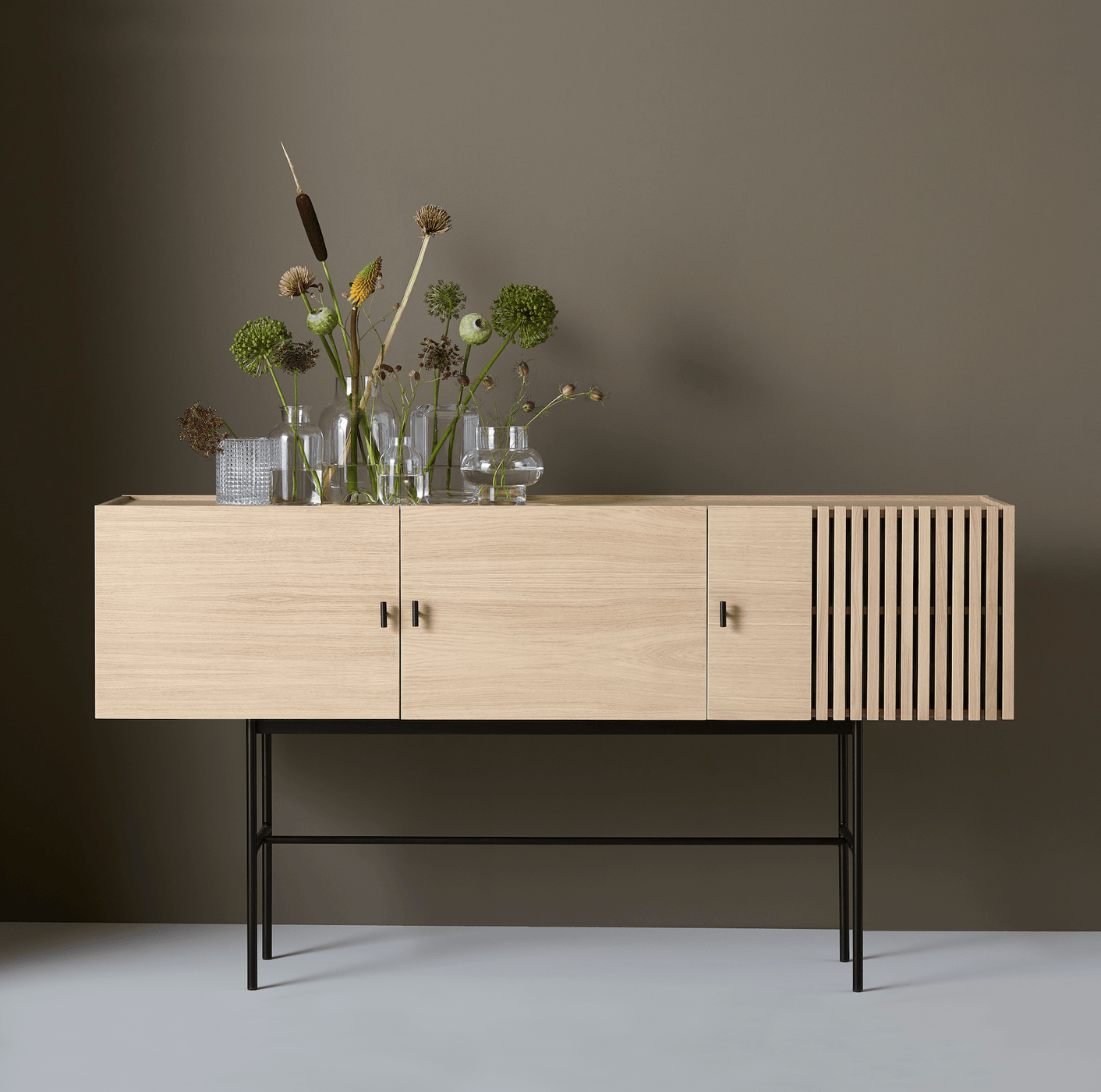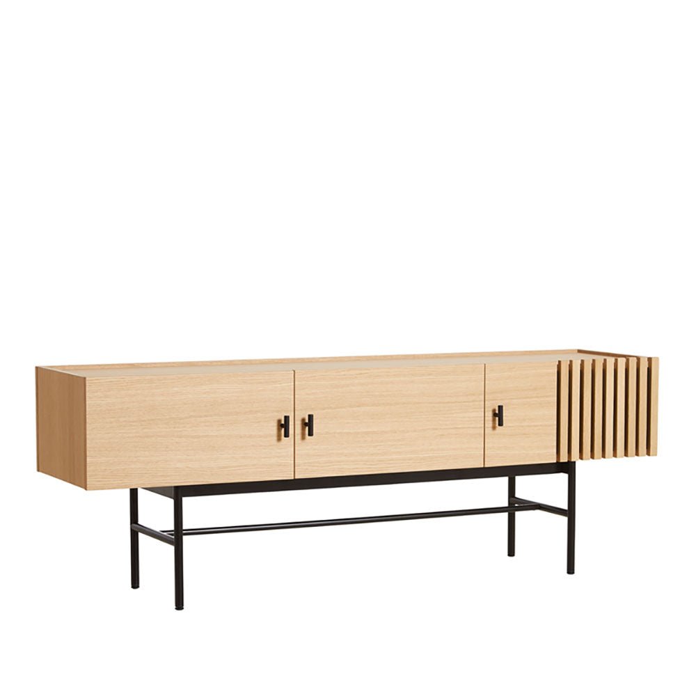 Inspired by the geometric nature of modern architecture, the Array Low Sideboard features a distinctive slatted accent, offsetting the smooth surfaces of the soft-close doors to create an illusion of transparency and a curiosity for what is stored within.