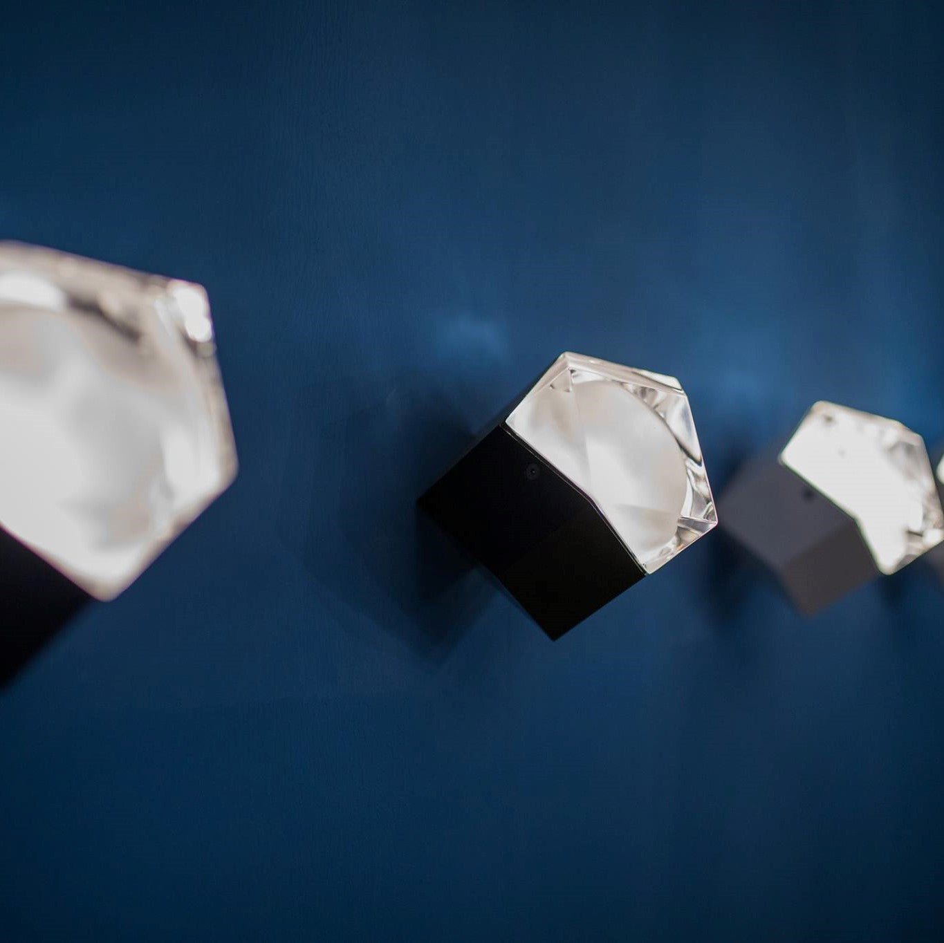 The Oluce Astro Wall Lamp is a striking piece that merges geometric precision with understated elegance. Featuring three transparent and sanded glass surfaces, combined with opaque ones, it resembles a small jewel. This clever design, enhanced by the metal parts in white or black finishes, produces a beautiful "prism" effect when illuminated. This effect transforms the light, creating a unique atmosphere in any room. The Astro Wall Lamp not only adds sophistication but also serves as a functional statement piece in modern interiors.