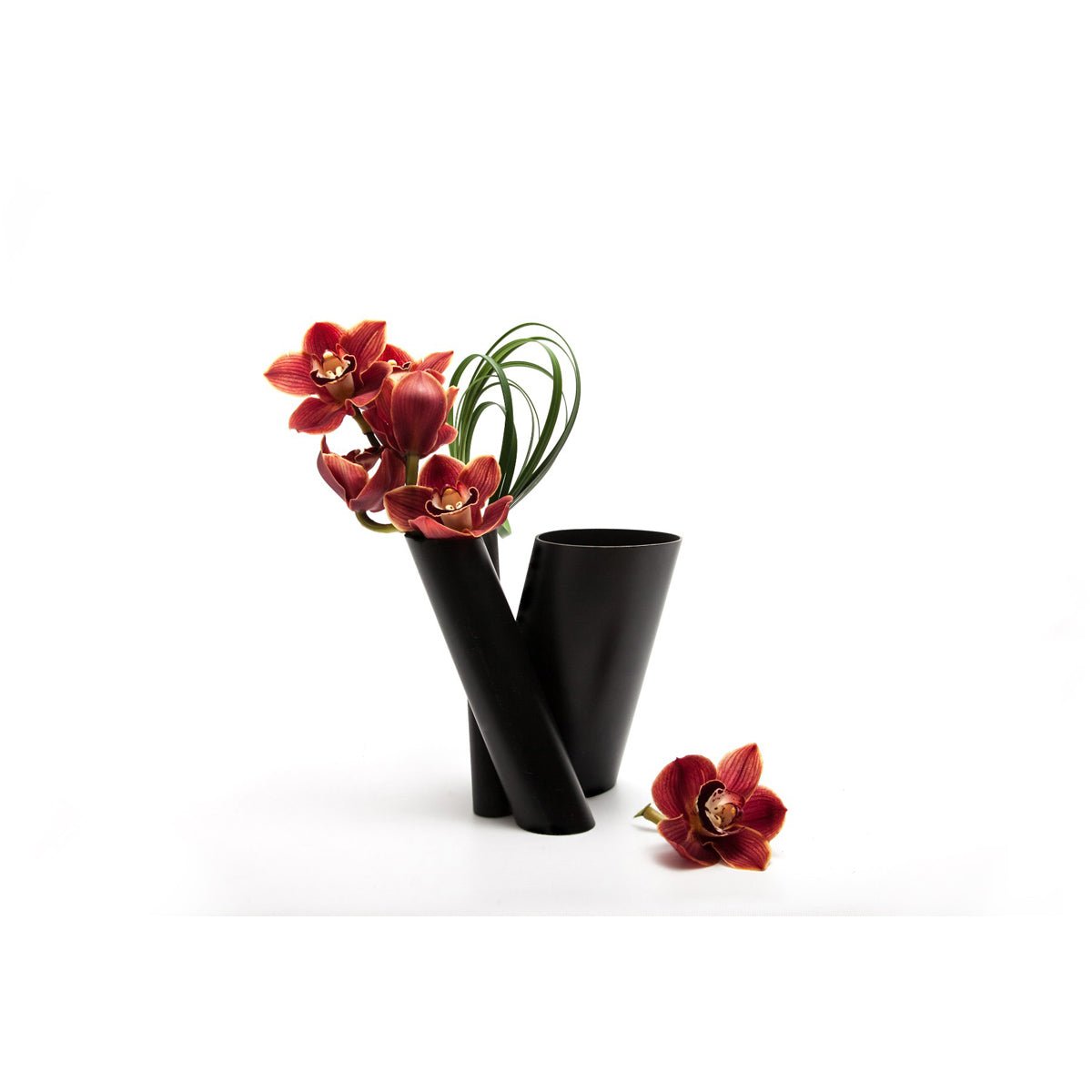Three vases in one, composed of a series of black hand painted steel tubes in various dimensions and cut on the bias, the series of four Bana vases can uniquely accommodate a single stem to full flower arrangements separately or at the same time. Dynamic and constantly changing in appearance when positioned in different ways, these vases can also stand alone as sculptural elements within an environment. The strong architectural forms which create an ever changing perspective and use.
