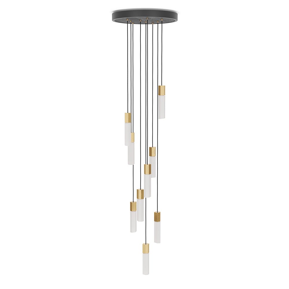 The design of the Tala Basalt Nine Pendant further emphasizes its bold, geometric appeal. The handcrafted brass pendants showcase an organic texture, while the translucent glass bulbs provide a warm, soft light that complements the metallic finish. This balance of raw materials and refined craftsmanship ensures that the Tala Basalt Nine Pendant not only illuminates but also serves as a dramatic centerpiece in any room. Perfect for spaces with high ceilings, this pendant creates an inviting atmosphere while also acting as an artistic statement piece.