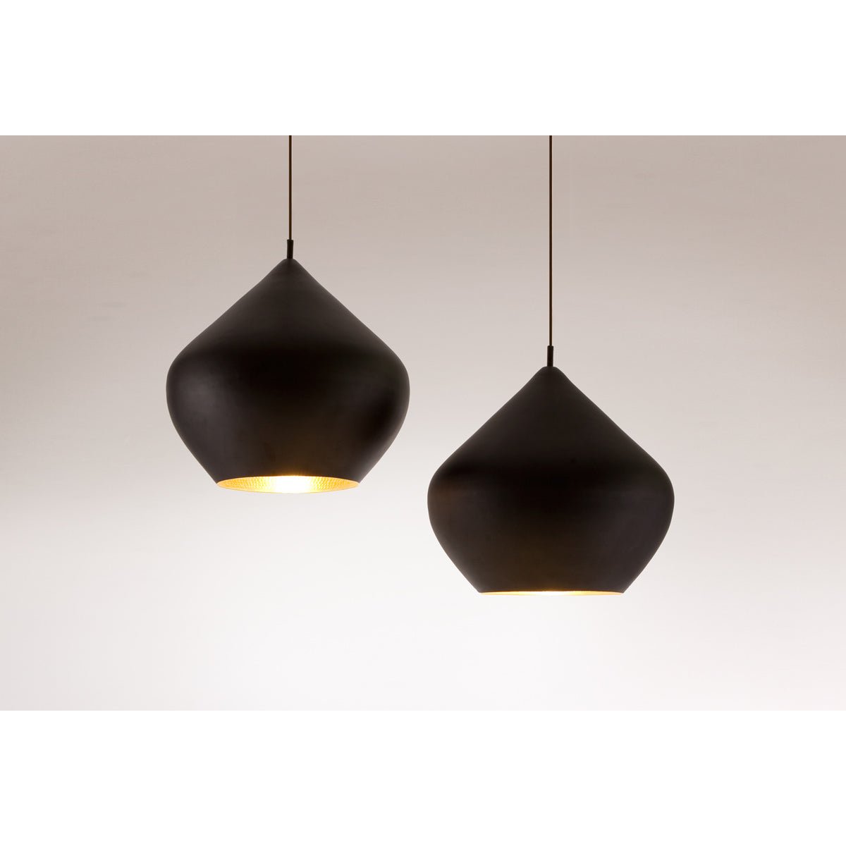 Pulling inspiration from traditional cooking pots and water vessels, Tom Dixon works with skilled artisans in India to create these beautiful fixtures. Brass is first spun and then hand-beaten on the interior in Moradabad, India. The inside is left in its natural color and exterior is painted black.