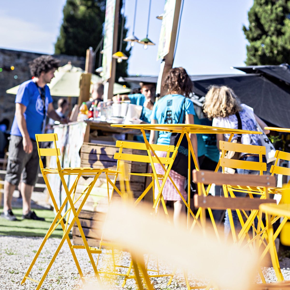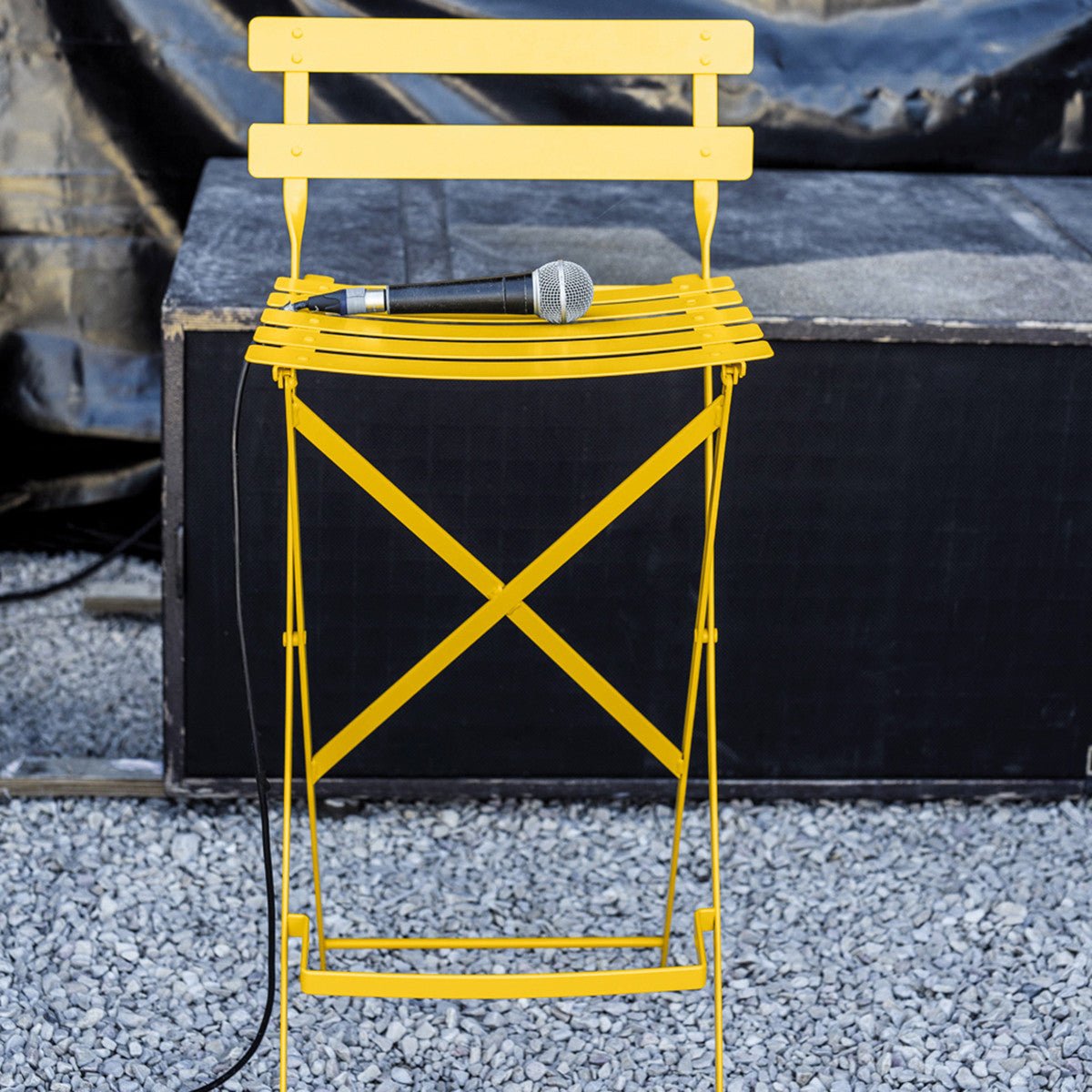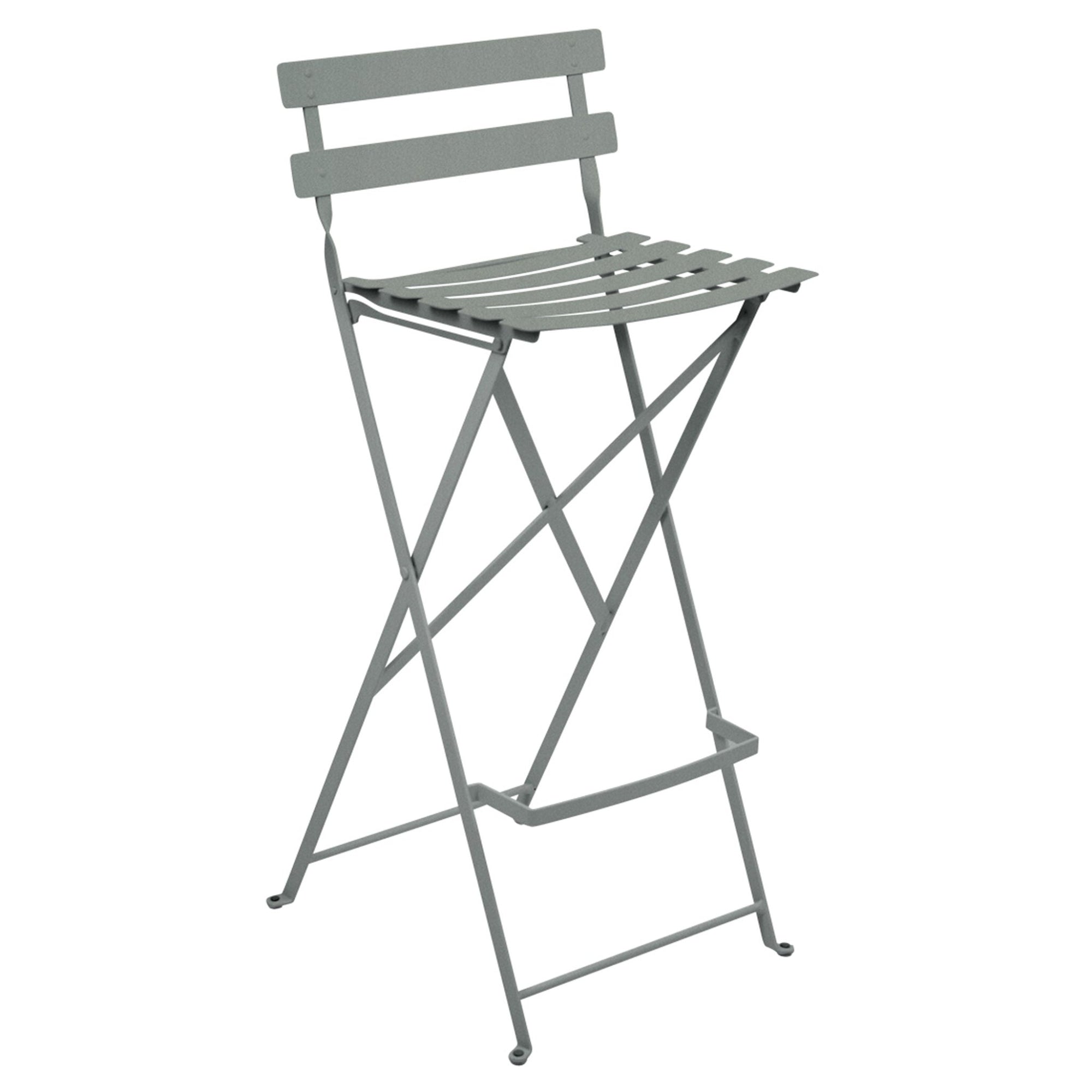 The Bistro High Bar Stool is made of lacquered steel. The high Bistro bar stool folds and includes galvanized steel curved slats and a foot rest. The stool pairs perfectly with the Bistro Folding High Table for outdoor patios.