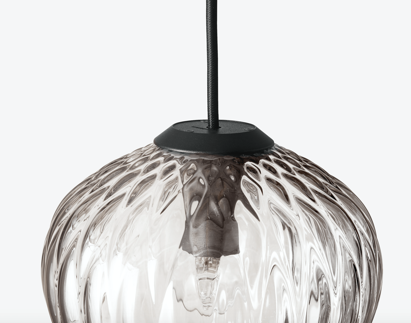 The glass is fixed blown into a mold and handcrafted. The suspension system is made from powder coated cast metal and is fitted with a safety wire.