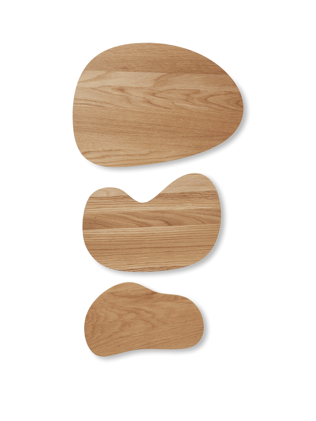 Characterised by their soft curves and sculpted details, the Cairn Cutting Boards add an artistic element to mealtimes. Inspired by cairns, man-made stacks of stones that are often raised for memorial purposes, the organic wooden shapes have been carved from solid, FSC™-certified ash and treated with a carbonised finish and feature delicate, rounded edges for a distinct look. Use them to prepare meals in the kitchen as well as a decorative way of serving up food at the dinner table.
