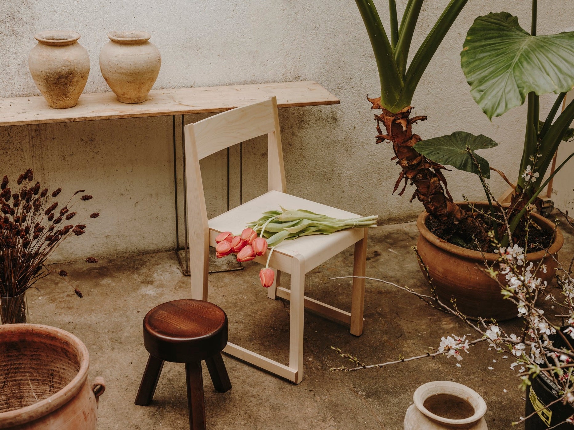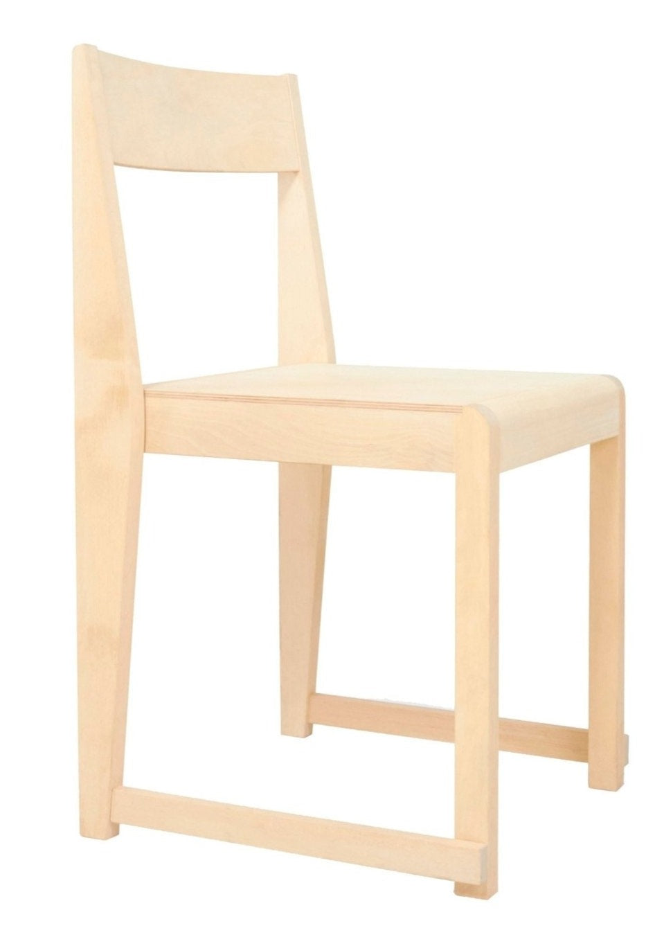 Defined by a geometric silhouette and a series of stark linear planes, Chair 01 is a picture of simplicity. This is a direct consequence of the chair's archetypical sledge construction, which has not only imparted the seat with its distinct aesthetic, but also makes it reliably sturdy. Stackable and easy to store, the chair is crafted from a natural birch that allows it to suit a range of environments.