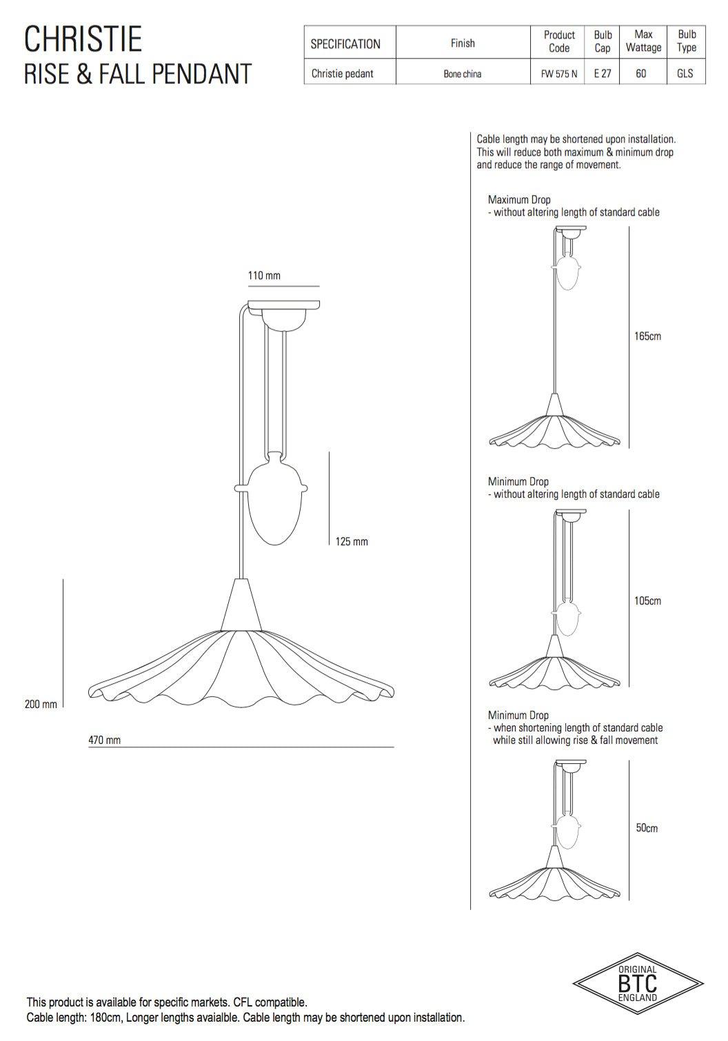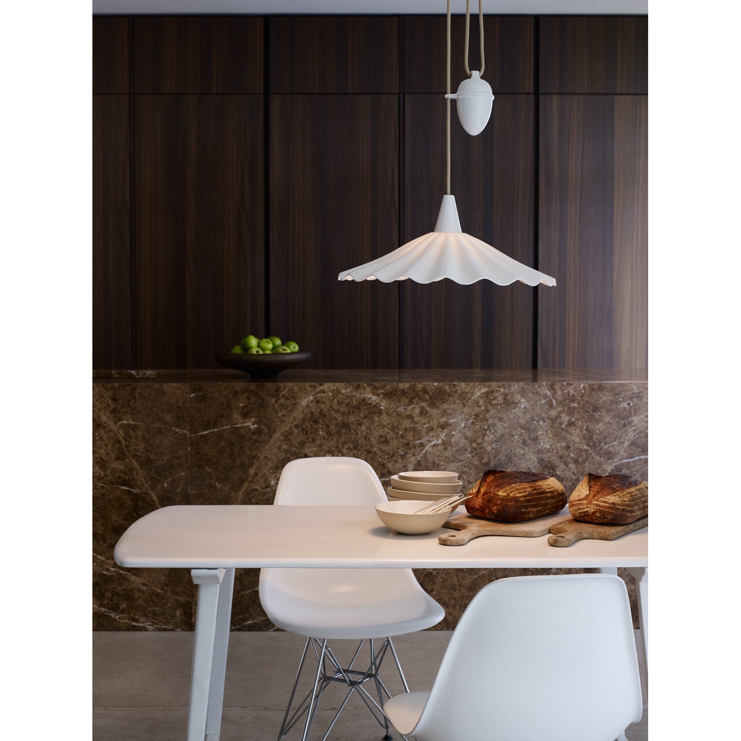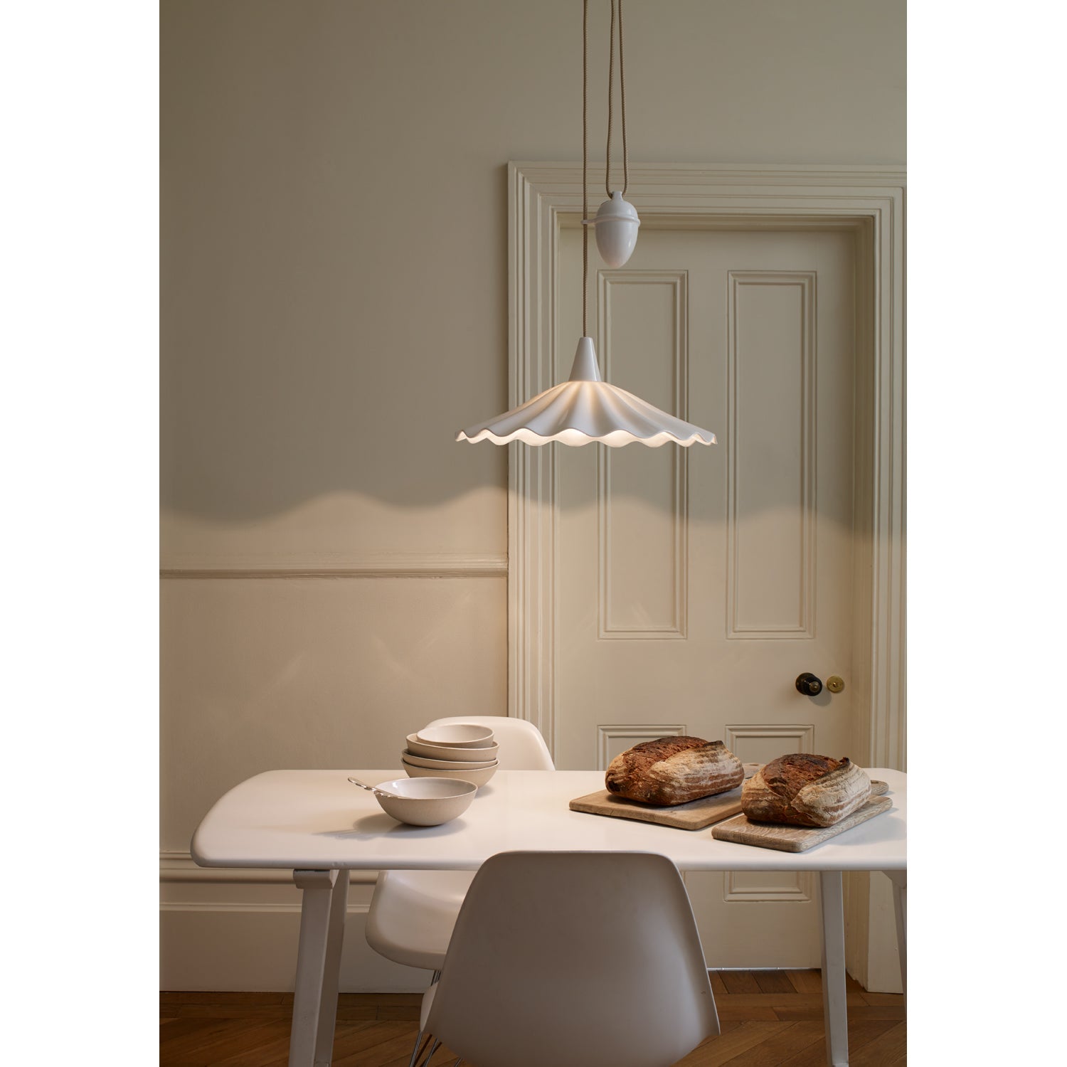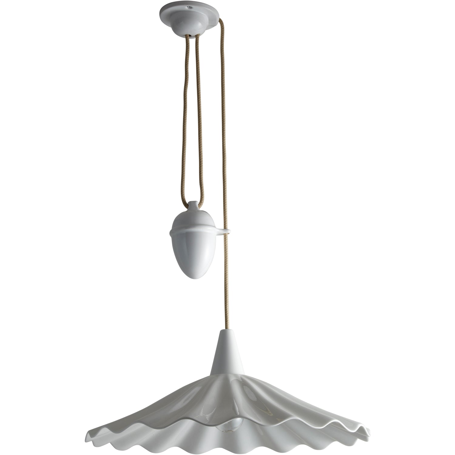 An exquisitely hand crafted bone china pendant light, with a shade that has been inspired by the rolling ocean waves. Bone china has been heated & molded to create this eye-catching Christie light, available either as a Rise & Fall, which has a system adjusting cable lamp height, or Pendant light.