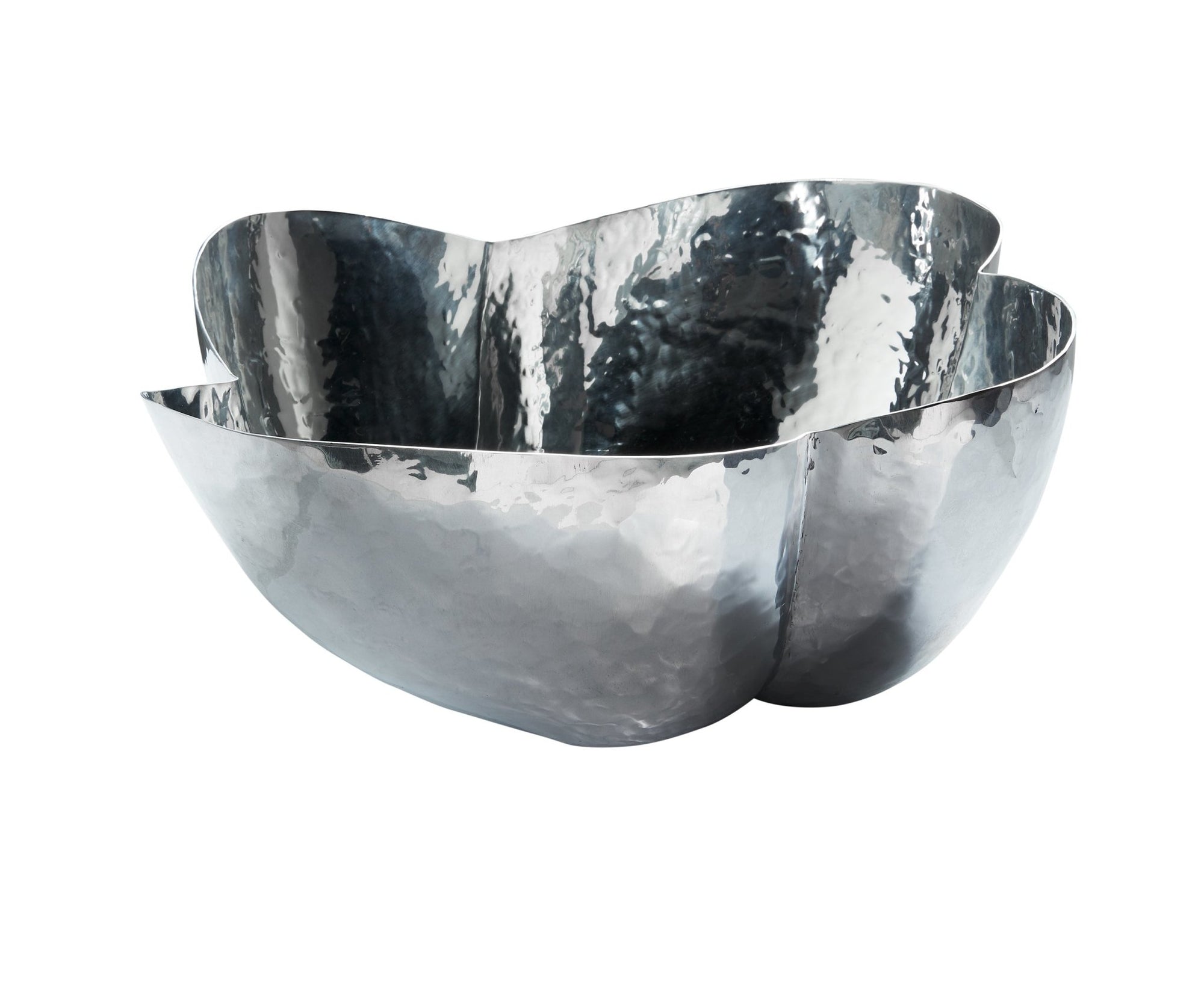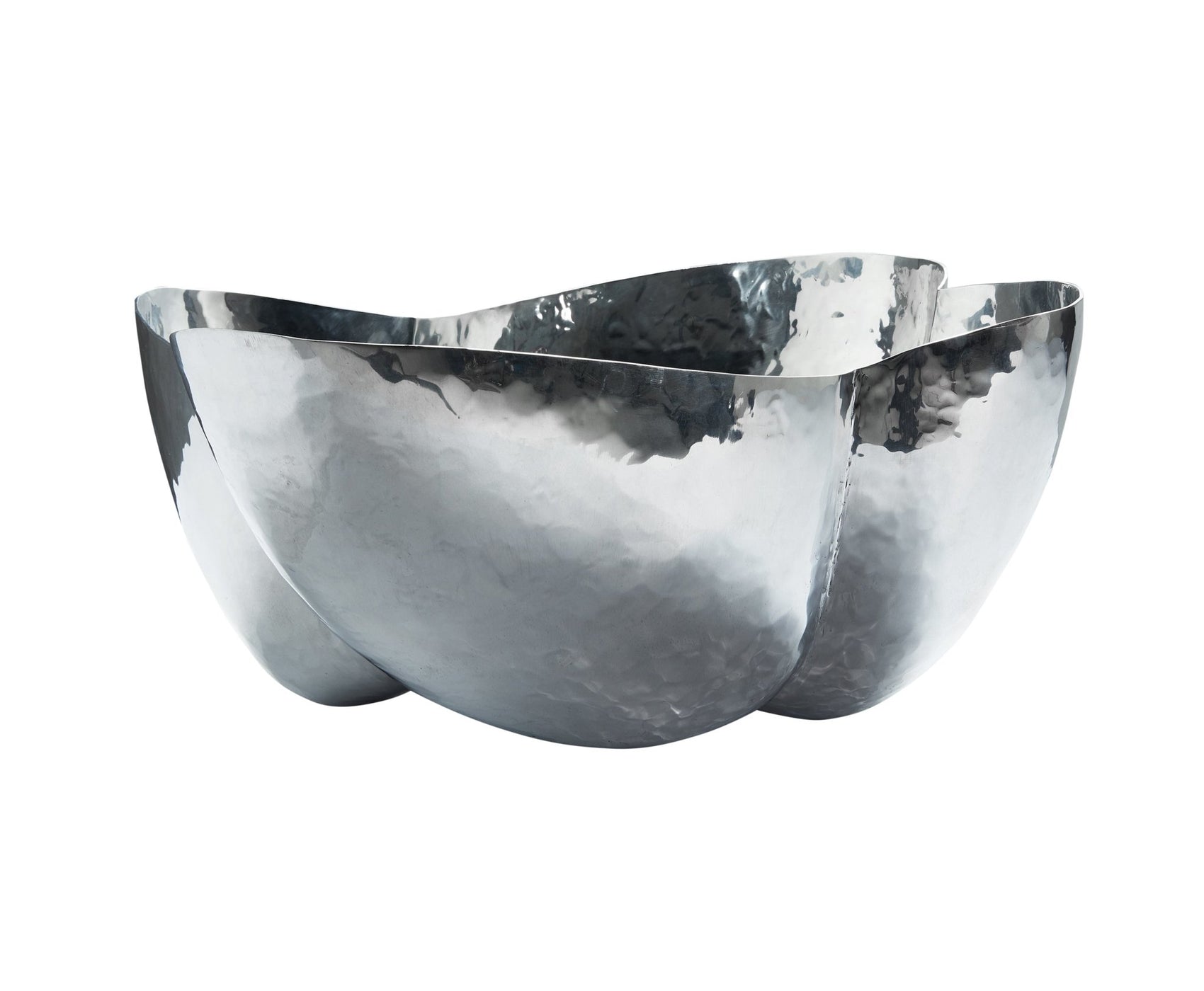 Cloud is a large sculptural bowl made of highly reflective polished aluminum. Handmade in India by skilled artisans, each bowl has unique qualities with every hammer and indentation from stretching and warping the metal being preserved, reflecting the amount of work that’s gone into the design. The silver bowl has a shape reminiscent of seedpods and can be used for a variation of purposes, such as a fruit bowl.