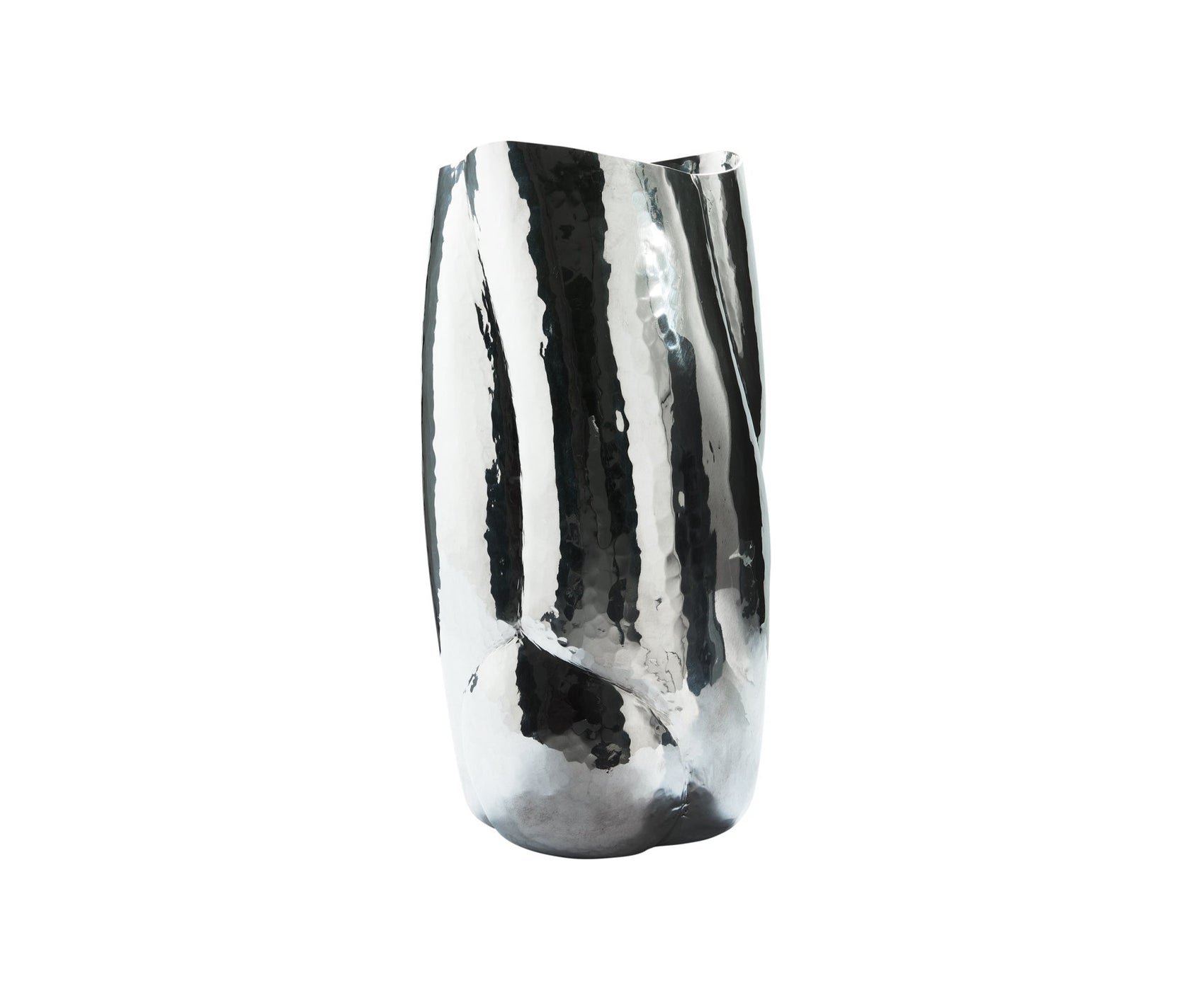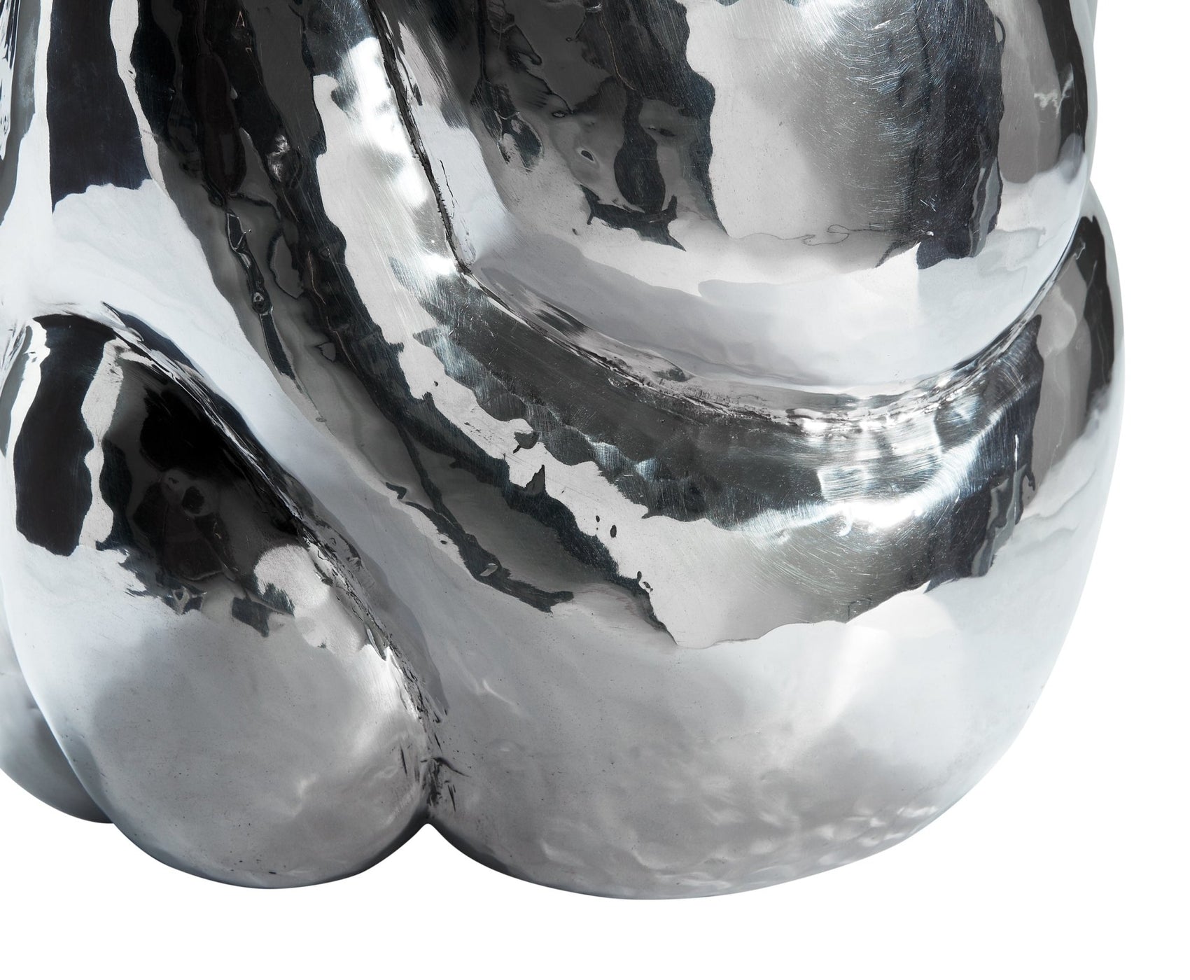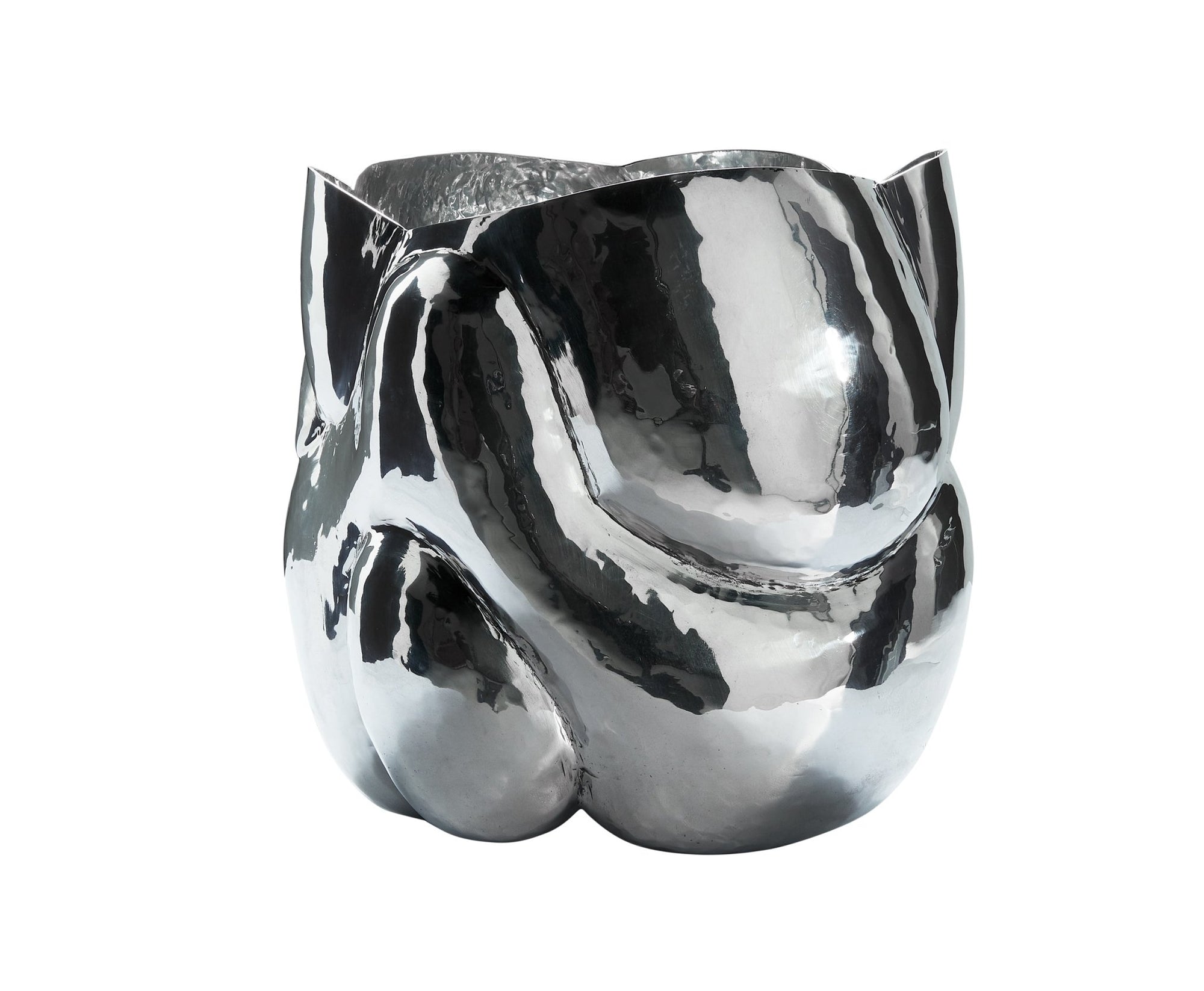 Cloud is a sculptural short vessel made of highly reflective polished aluminium. Handmade in India by skilled artisans, each vessel has unique qualities with every hammer and indentation from stretching and warping the metal being preserved, reflecting the amount of work that has gone into the design. The silver vessel's shape is reminiscent of seedpods and can be used for a variation of purposes, such as a champagne bucket or as a vase.
