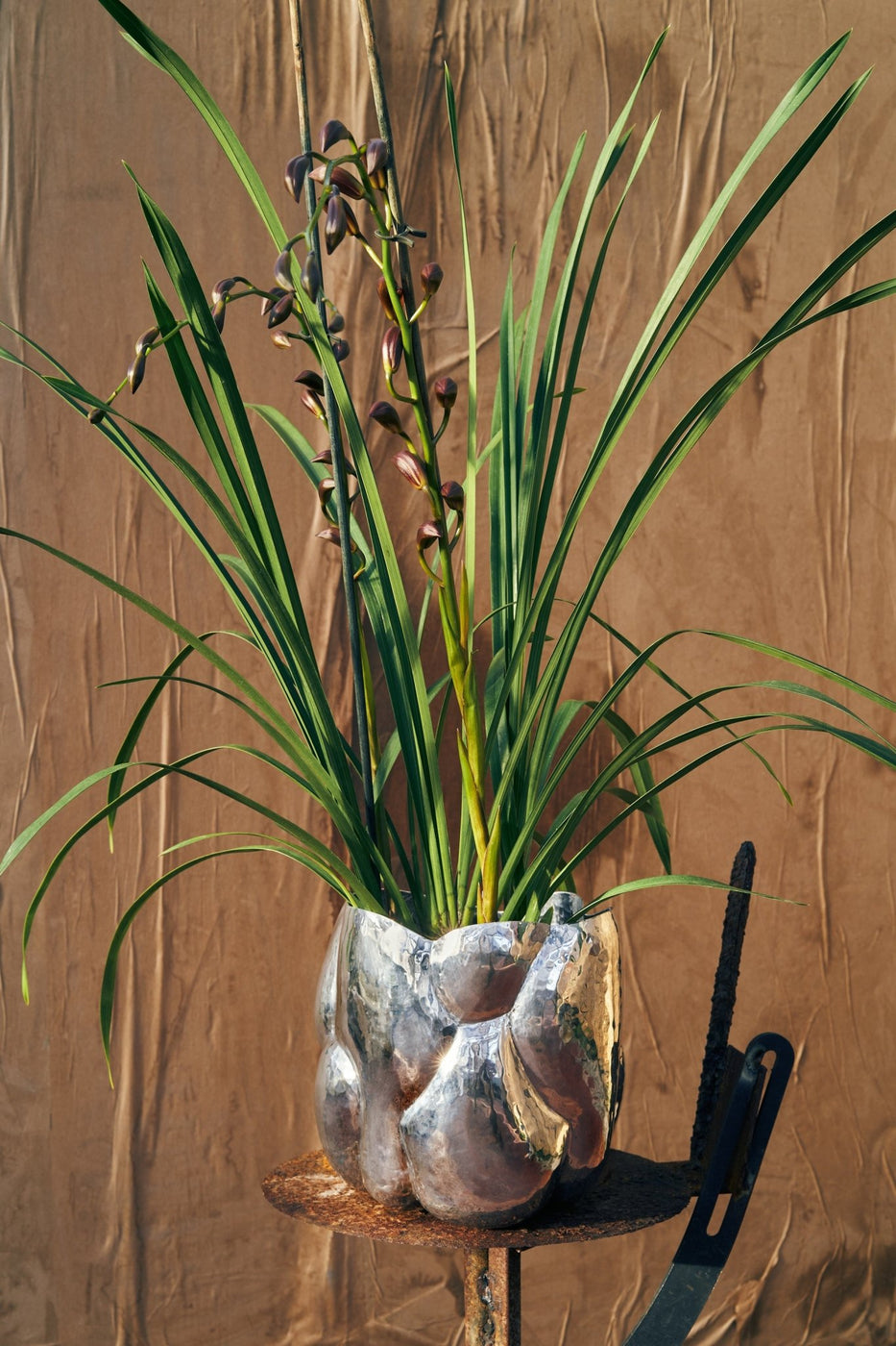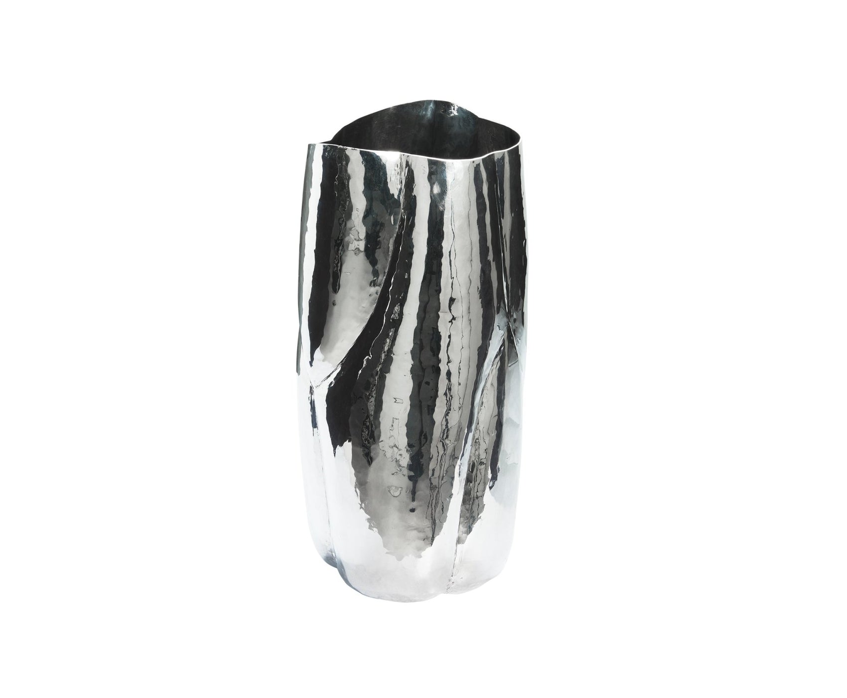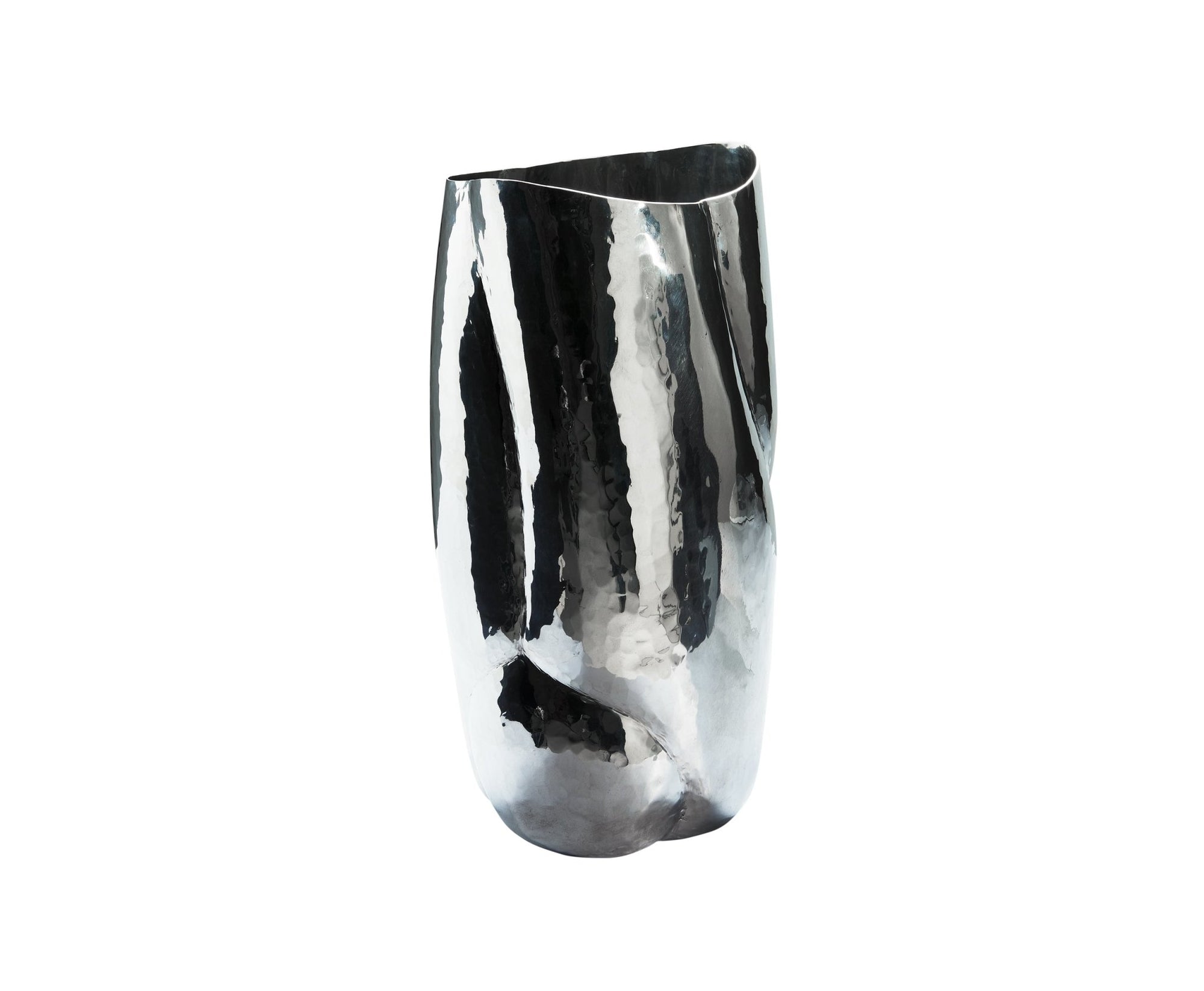 Cloud is a sculptural short vessel made of highly reflective polished aluminium. Handmade in India by skilled artisans, each vessel has unique qualities with every hammer and indentation from stretching and warping the metal being preserved, reflecting the amount of work that has gone into the design. The silver vessel's shape is reminiscent of seedpods and can be used for a variation of purposes, such as a champagne bucket or as a vase.
