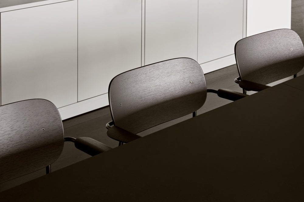 The Audo Copenhagen Co Chair Armrest ensures long-lasting comfort and flexibility. The wide veneer backrest offers ample support and freedom of movement, while the armrests provide added comfort. Designed with Norm Architects' signature human-centered minimalism, this chair complements modern interior styles. Its powder-coated steel frame delivers durability while maintaining an elegant geometric silhouette.
