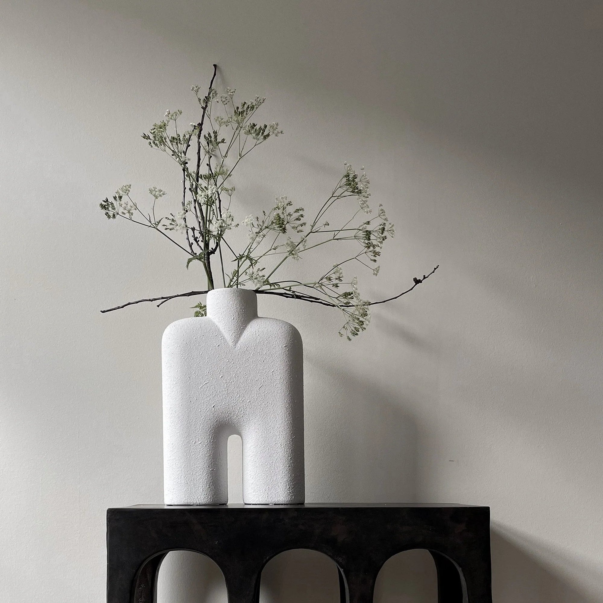 The construction quality becomes evident through regular use, with the smooth finish maintaining its pristine appearance through daily interaction with water, tall stems, and seasonal styling changes. The carefully considered proportions work beautifully for different floral elements - the elongated opening is perfect for dramatic branches, tall grasses, or contemporary ikebana-style arrangements while the substantial base provides excellent stability for top-heavy displays. The curved form creates natural visual flow that draws the eye upward and enhances vertical design compositions. The vase encourages bold botanical statements rather than precious treatment, offering reliable functionality for everything from single dramatic stems to carefully layered tall arrangements while maintaining its sculptural integrity through constant repositioning and creative styling experiments.