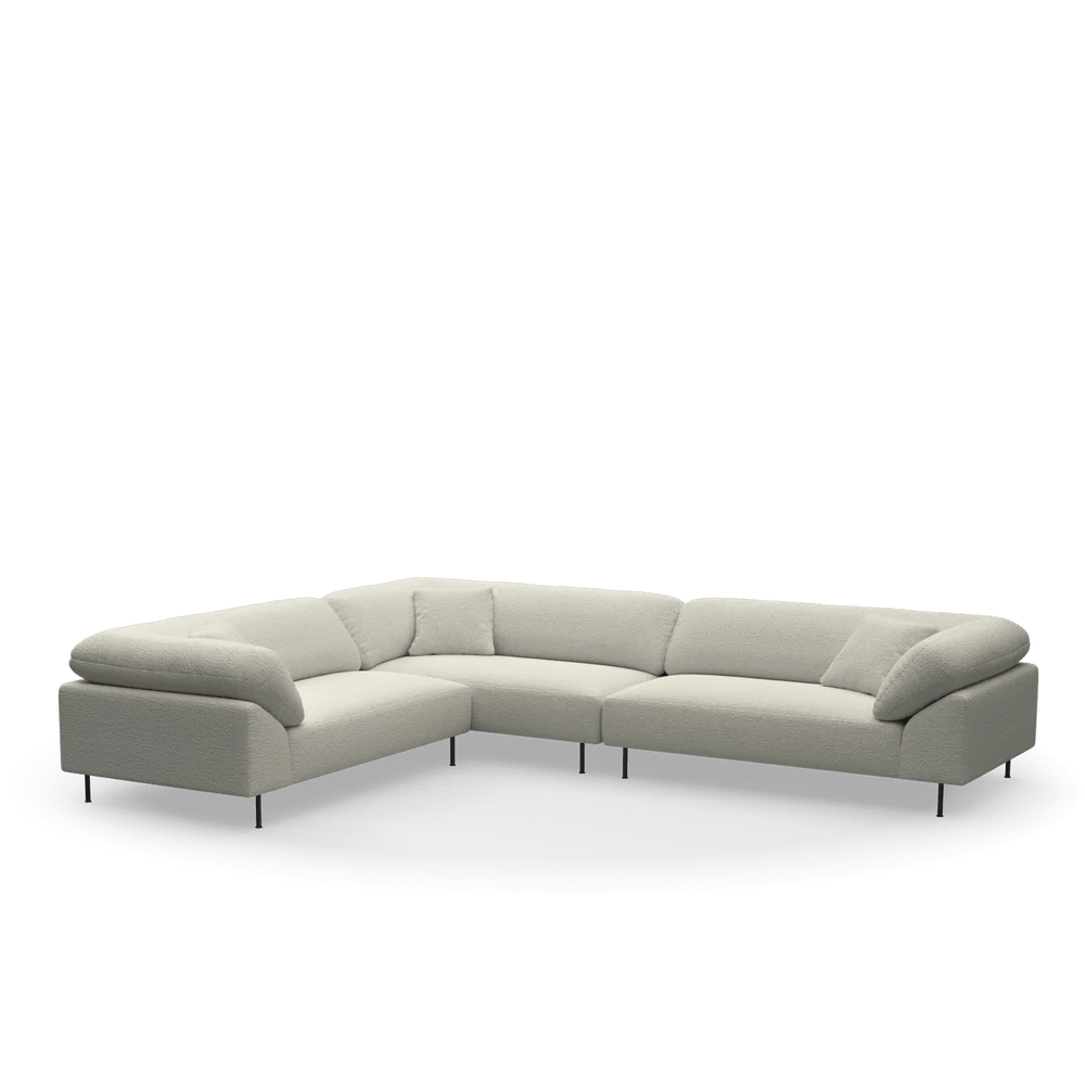 The Woud Collar Sectional 7 takes modular seating and gives it this distinctive personality through those askew-arranged back cushions that somehow make the whole thing feel more inviting than your typical sectional. Designer Meike Harde came up with this concept where the continuous back cushion wraps around like a collar - which is where the name comes from - creating this embracing quality that actually delivers on the promise of feeling like a soft hug when you sink into the memory foam. The off-white Barnum 24 fabric from Nevotex has this substantial feel that suggests it'll hold up to daily use while maintaining that clean, contemporary look. What's particularly smart about the 287cm depth is how it accommodates real lounging rather than just perching - you can actually stretch out or curl up depending on your mood.