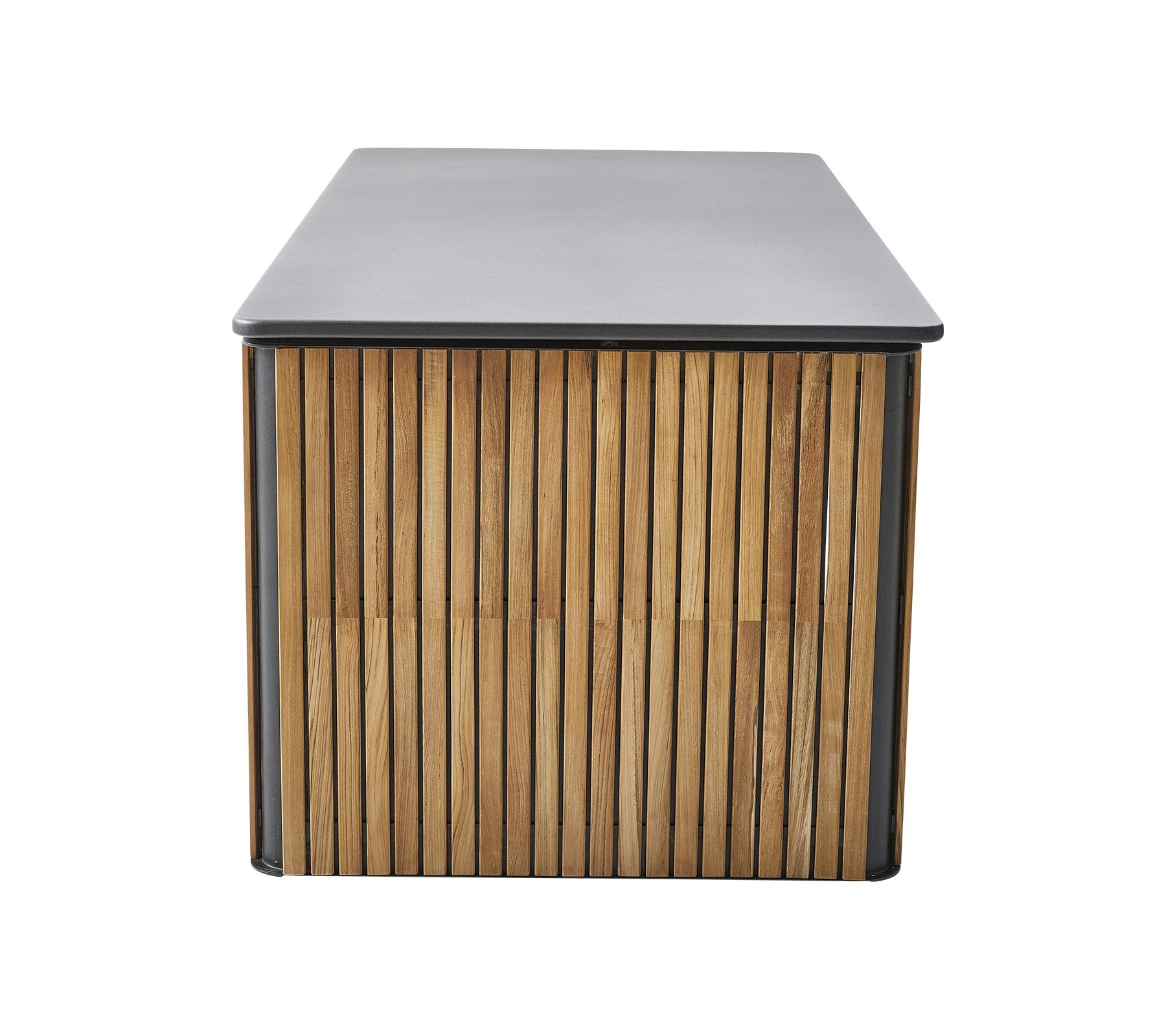 Combine is a functional and spacious box in black powder coated aluminium and slats in certified teak. The combine box is a perfect storage solution for your outdoor environment, for storing your cushions, when the weather changes. The warm certified teak and the streamlined powder coated aluminium gives a unique look that fits in most spaces. Cane-line teak is approved and cultivated according to SVLK certification system. The powder coated aluminium ensures a resistant surface to knocks and scratches. The Combine cushion box is despite its size, rather light in the material, and with a lid with soft-closing for your comfort.