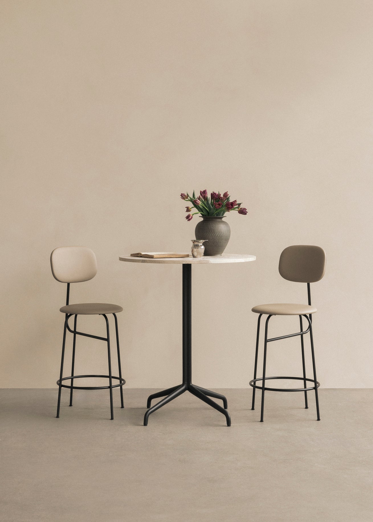 Like the original, the stool is deconstructed and stripped of unnecessary components, but now boasts the additional feature of a wider backrest and a luxurious upholstering of both seat and backrest. The result is a blissfully simple chair that embodies both minimalism and style, bound to steal the show in any room.