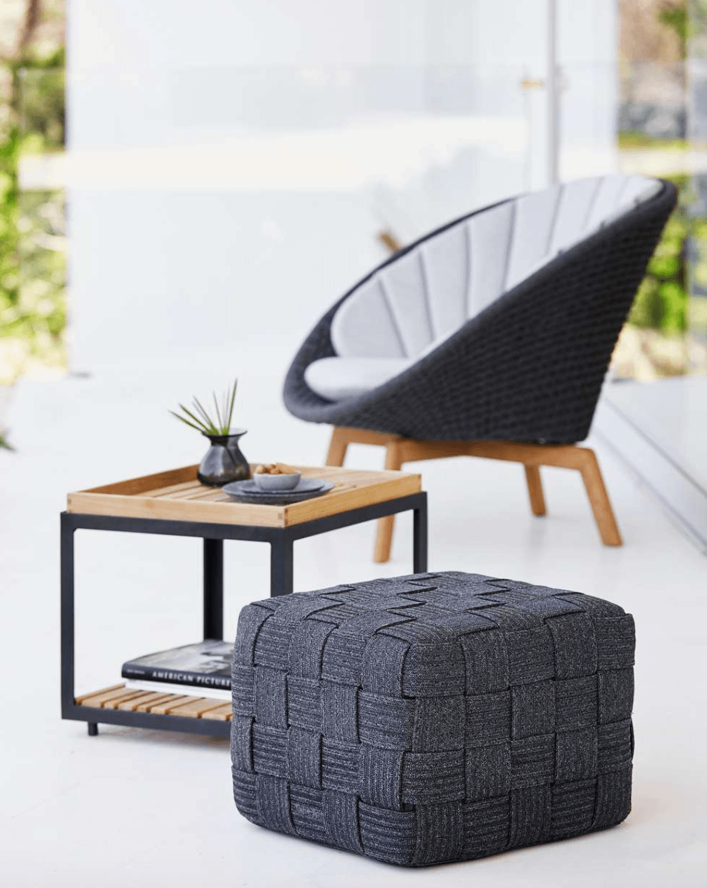 Cube is an outdoor footstool from Cane-line, designed by the innovative Cane-line design team. The footstool is made in the very durable outdoor material Cane-line Soft Rope, with a core in the unique QuickDry foam, which employs a special technology that increases the level of comfort and user-friendliness, as the material is dry again just an hour after heavy rain. Cube got its name from the distinctive shape, and the countless squares or cubes included in the design. The Cane-line Soft Rope that covers the Cube, is handwoven in a beautiful pattern, providing texture and elegance to the footstool. Cube can both be used outside on the terrace as well as indoor in your living room. The Cube footstool is the ideal furniture piece that – with its pleasant structure and singular appearance – can enrich and complete your outdoor environment. The dark grey color of the footstool matches both our warm furniture in teak wood and woven materials, or with our neat minimalist furniture in aluminum and ceramic. It is recommended to bring your Cube footstool inside during the autumn and winter season to prolong the lifetime of the product – and easily move it outside with you, when the first spring-sun arrives.
