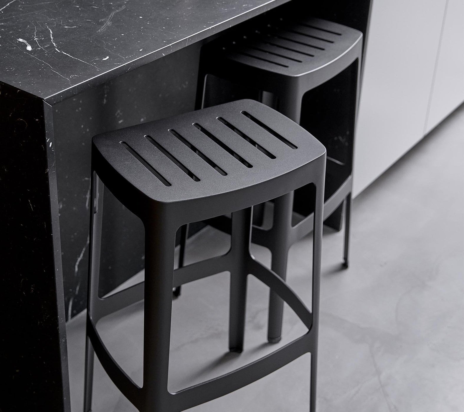 The Cut high bar chair is designed to fit the Cut high table, the Cut bar chair brings a very contemporary look in durable and lightweight materials. Cut bar chair is stackable and comes with a 750 mm seating height. Cut bar chair fits in and stands out when being mixed with various interior or exterior styles - from a modern city rooftop to a cosy terrace or dining setting in the garden or at the beach. Designed by Hee Welling and Gudmundur Ludvik.