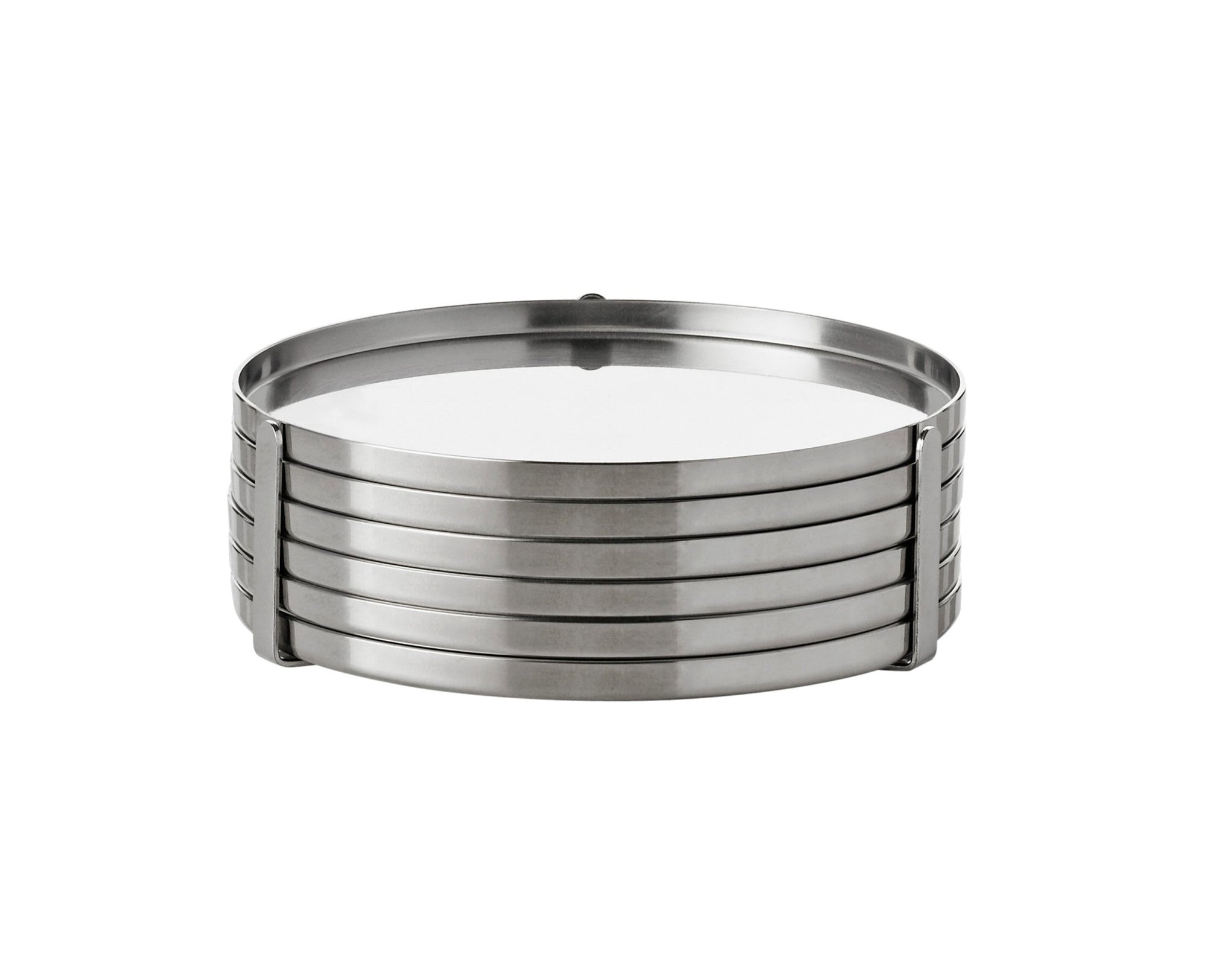 The AJ Coasters - Set of 6 from Stelton blend modern Danish design with exceptional functionality. Crafted from stainless steel, these coasters offer a minimalist aesthetic while keeping your furniture safe. Whether you're serving drinks with wine glasses or a tea kettle, this set ensures protection in style.