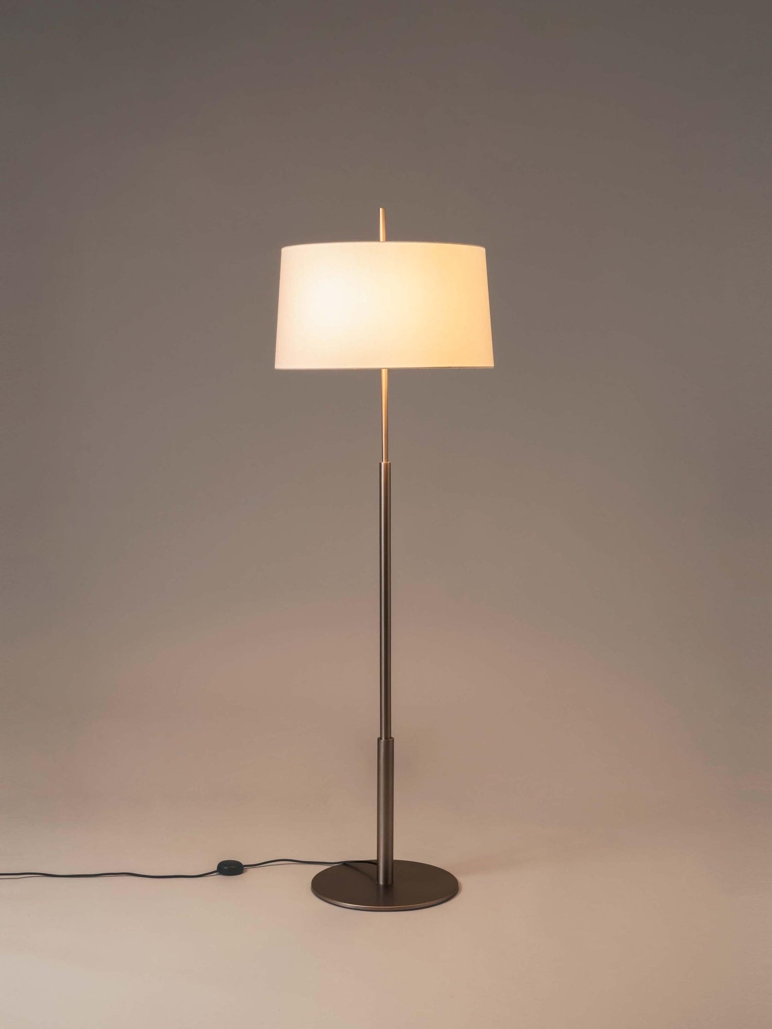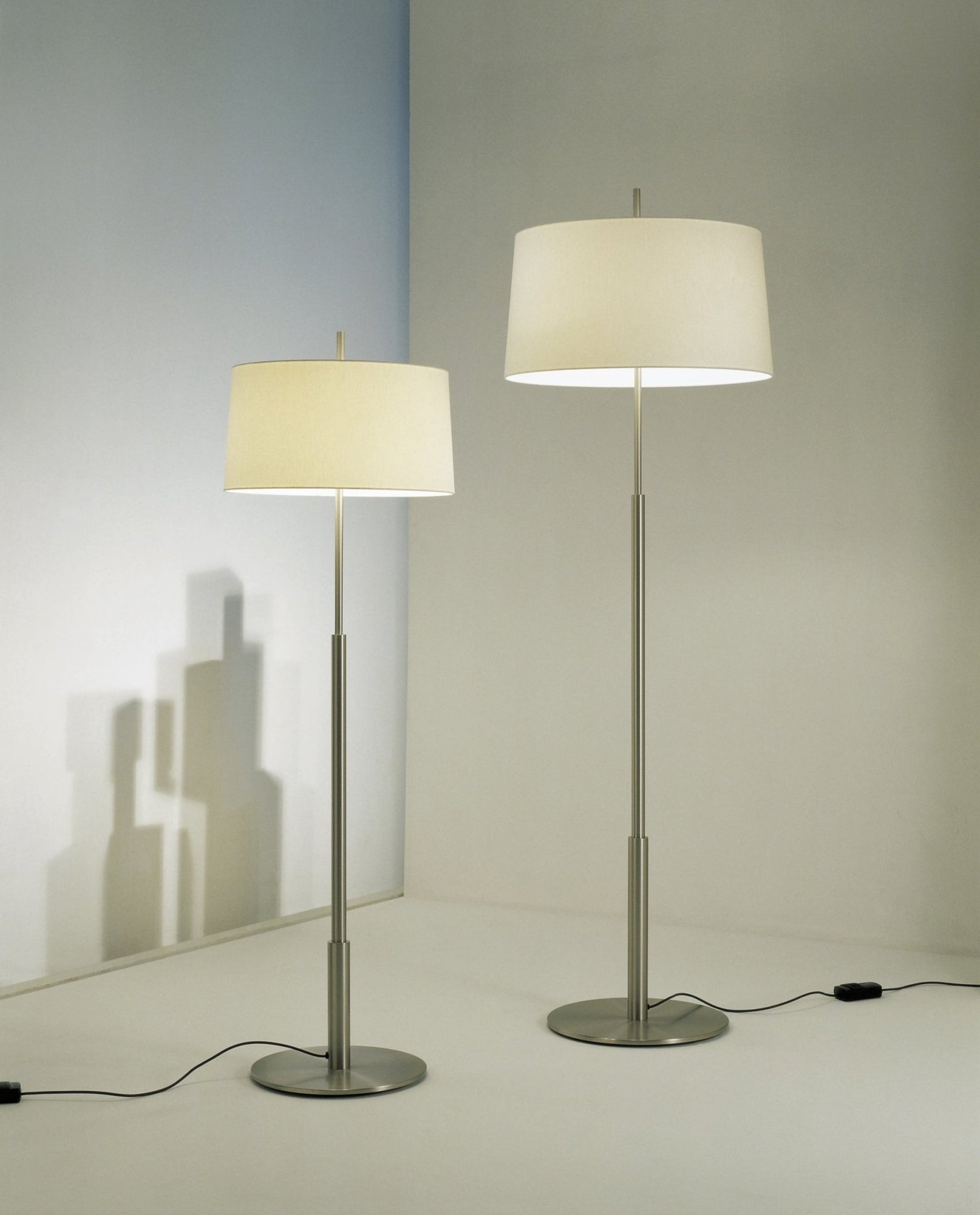 The Santa & Cole Diana Mayor Floor Lamp has a sleek, slender design that blends modern aesthetics with practical functionality. Its central metallic shaft narrows as it rises, supporting a beautiful linen shade. This shade evenly distributes soft, ambient light from two bulbs, ensuring there are no shadows. As a result, the Diana Mayor Floor Lamp is ideal for living rooms, bedrooms, and offices, combining form and function.