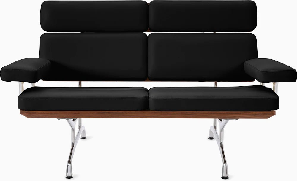 One of the last pieces of furniture from the Eames office, the Eames® Sofa (1967) was designed be a low-profile piece of furniture that would fit in the tightest of living spaces. This modern two-seat leather sofa features a solid wood back and frame panels finished with gunstock oil. Polished aluminum legs and arm supports complement cushions expertly upholstered in luxurious black leather. A rarity among sofas, this authentic Eames® couch by Herman Miller® has been in production since 1984.