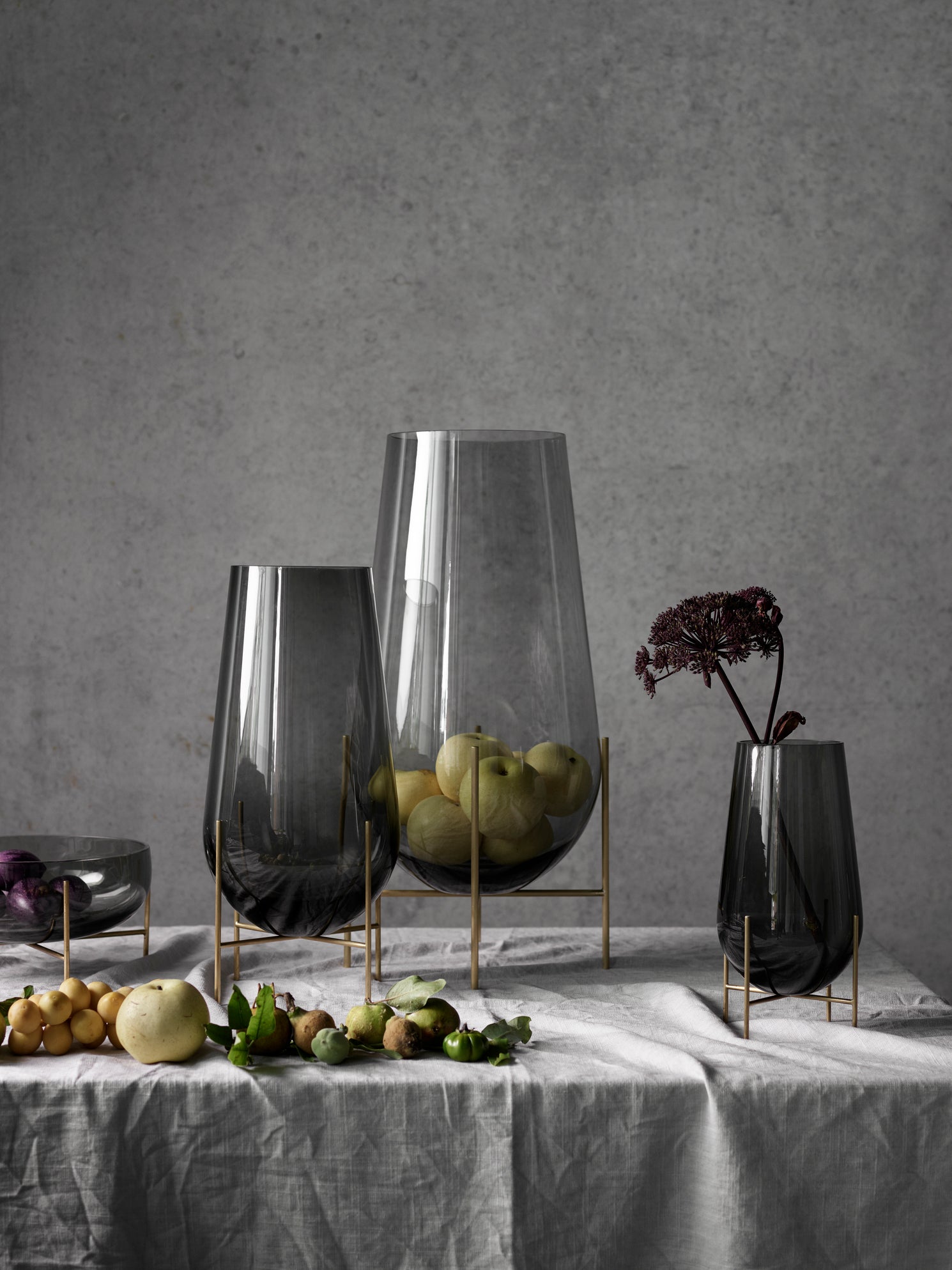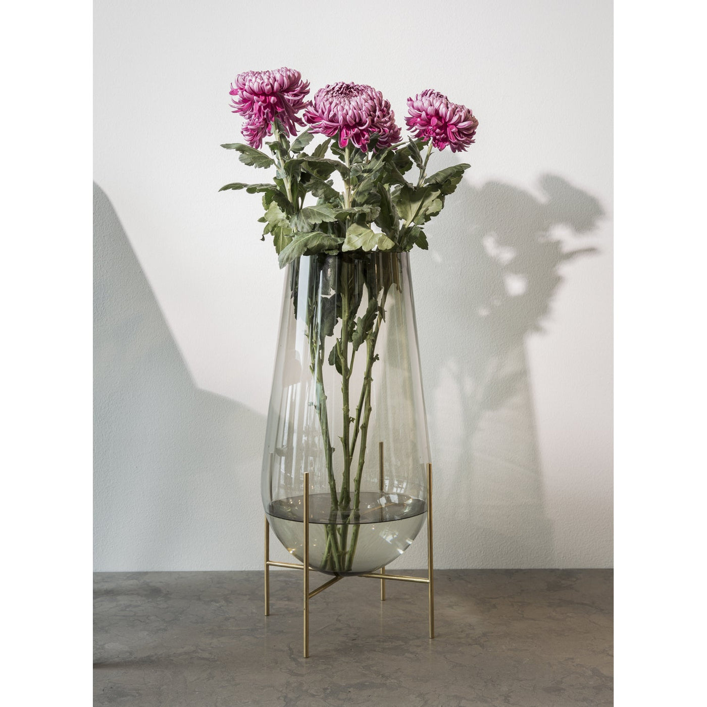 Designed with both artistry and practicality in mind, the Audo Copenhagen Echasse Vase comes in three sizes: small, medium, and large. Each size offers the same impressive design, with solid brass legs ensuring stability and balance. The colored glass body adds a modern touch while complementing its minimalist shape. The Echasse Vase is perfect for showcasing flowers or standing as a statement piece on its own.