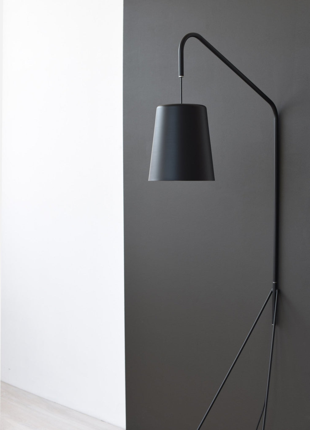 Designed to rest against a wall or in a corner, the Eileen Floor Lamp is a balance of simple lines and architectural genius. The triangular base features a non-slip, rubberized bottom edge and supports the aluminum neck and shade that hang delicately over any work surface or reading chair, pivoting to direct the light where it’s needed most.