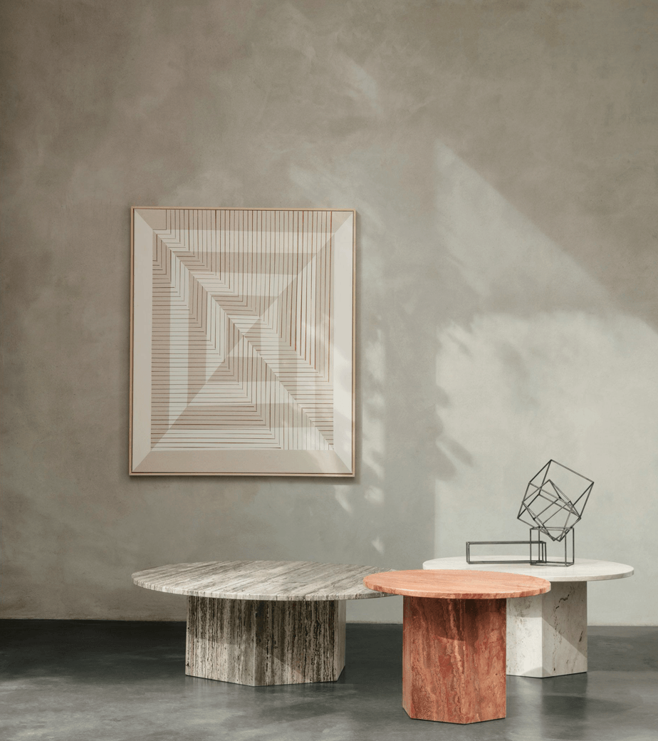 The Epic collections pulls its inspiration from the ancient Greek and Roman empires. Standing tall on a hexagonal or octagonal base, the Gubi Epic Coffee Table utilizes the unique and varying patina of its travertine limestone to create an experience with every usage.
