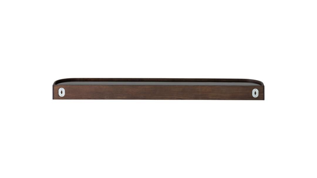 The multifunctional, space-saving Epoch Shelf with Rack is, as its name suggests, both a shelf and a hanging rail in one design. Shaped from steam bent oak veneer in a natural or dark stained finish, concealed within the design are 11 wooden pegs for hanging clothes, bags and accessories in a hallway, bedroom or bathroom. The top features a recessed ledge for storing or displaying items. Hang alone or in rows of multiples.