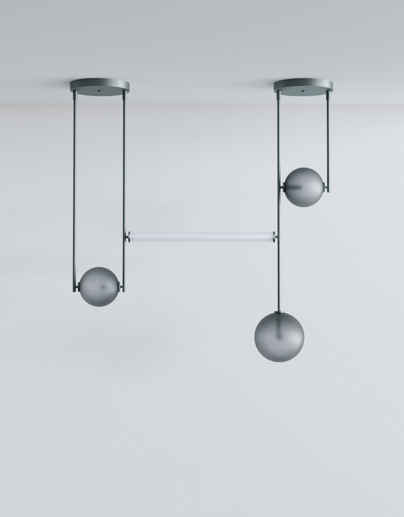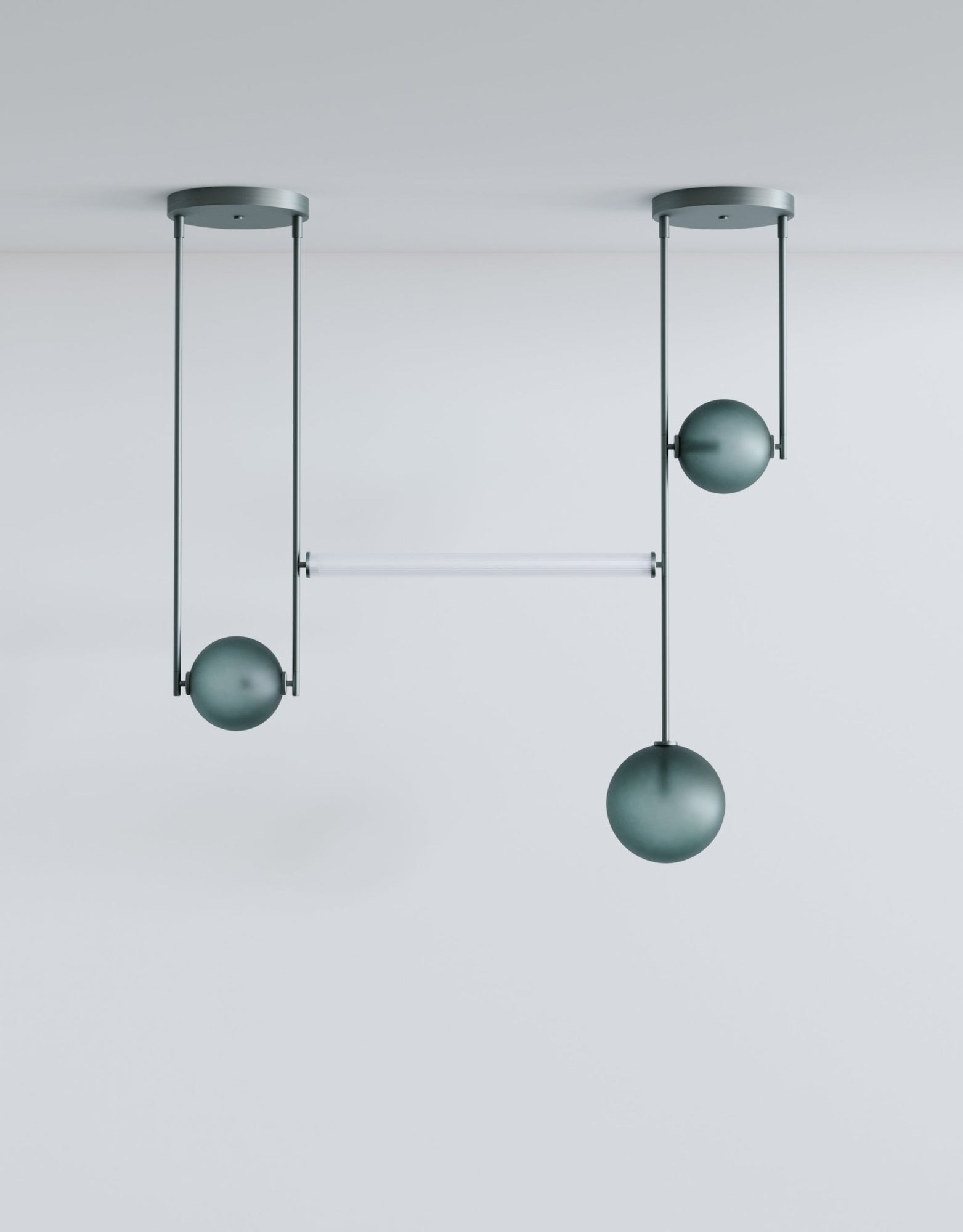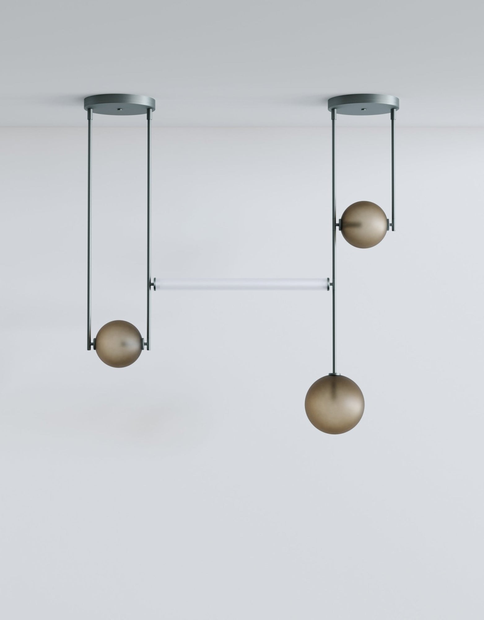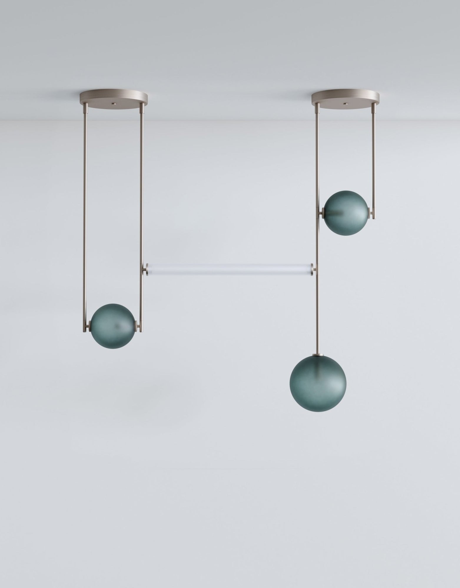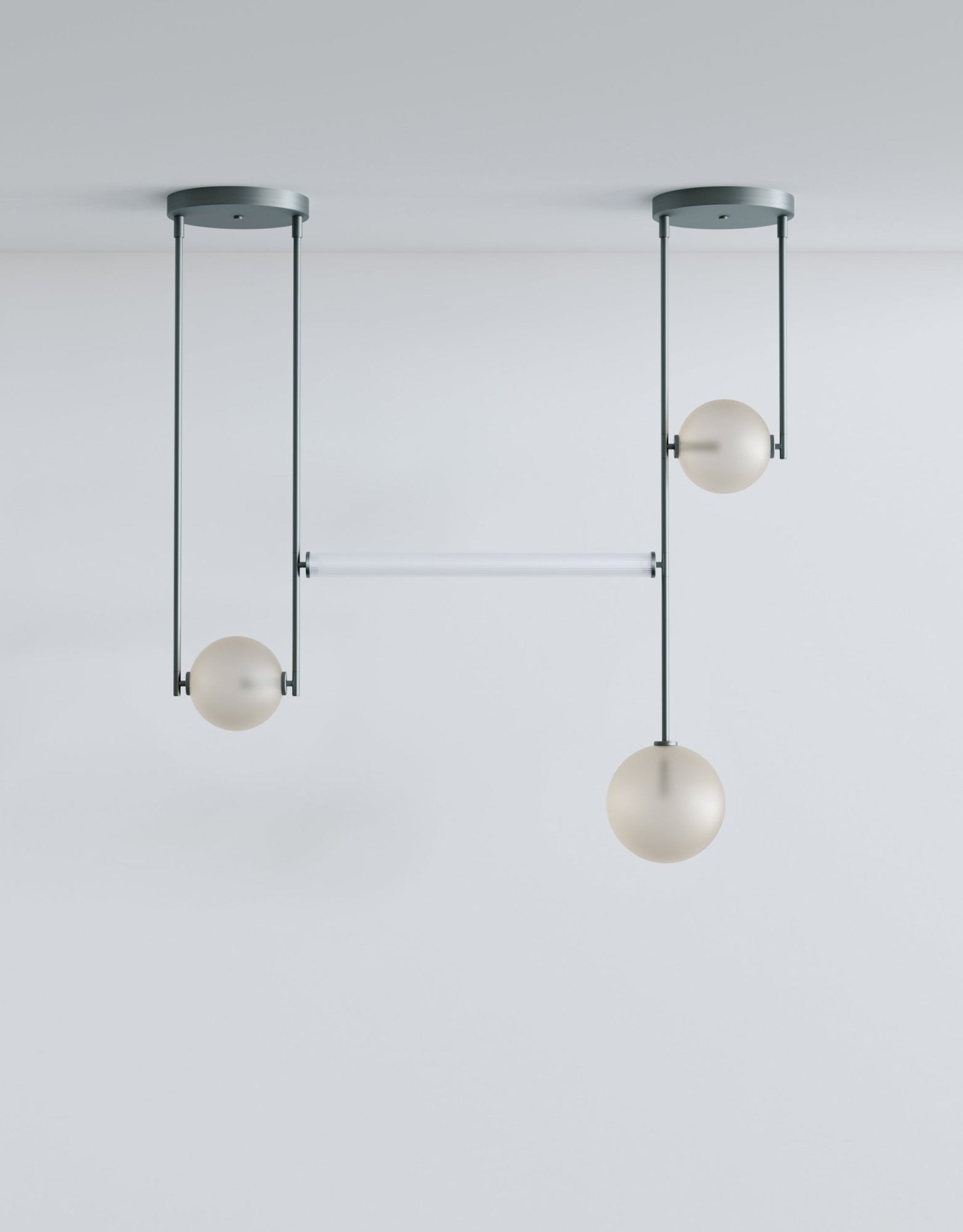 The L&G Equalizer 4 Piece Linear takes the original Equalizer concept and stretches it into a horizontal configuration that works over dining tables, kitchen islands, or long countertops. Instead of individual pendants, you get four glass globes suspended along anodized aluminum tubing that runs horizontally across your space. The setup mounts to two 12-inch round canopies on your ceiling, creating this clean linear installation that doesn't need a massive single junction box in the center. The linear tube connecting everything is frosted scalloped glass - always, not optional - which diffuses light along the whole length instead of just from the end globes. The whole thing gets sized to your specifications during ordering, so you're getting something that fits your actual table or counter length rather than making do with whatever standard size exists.