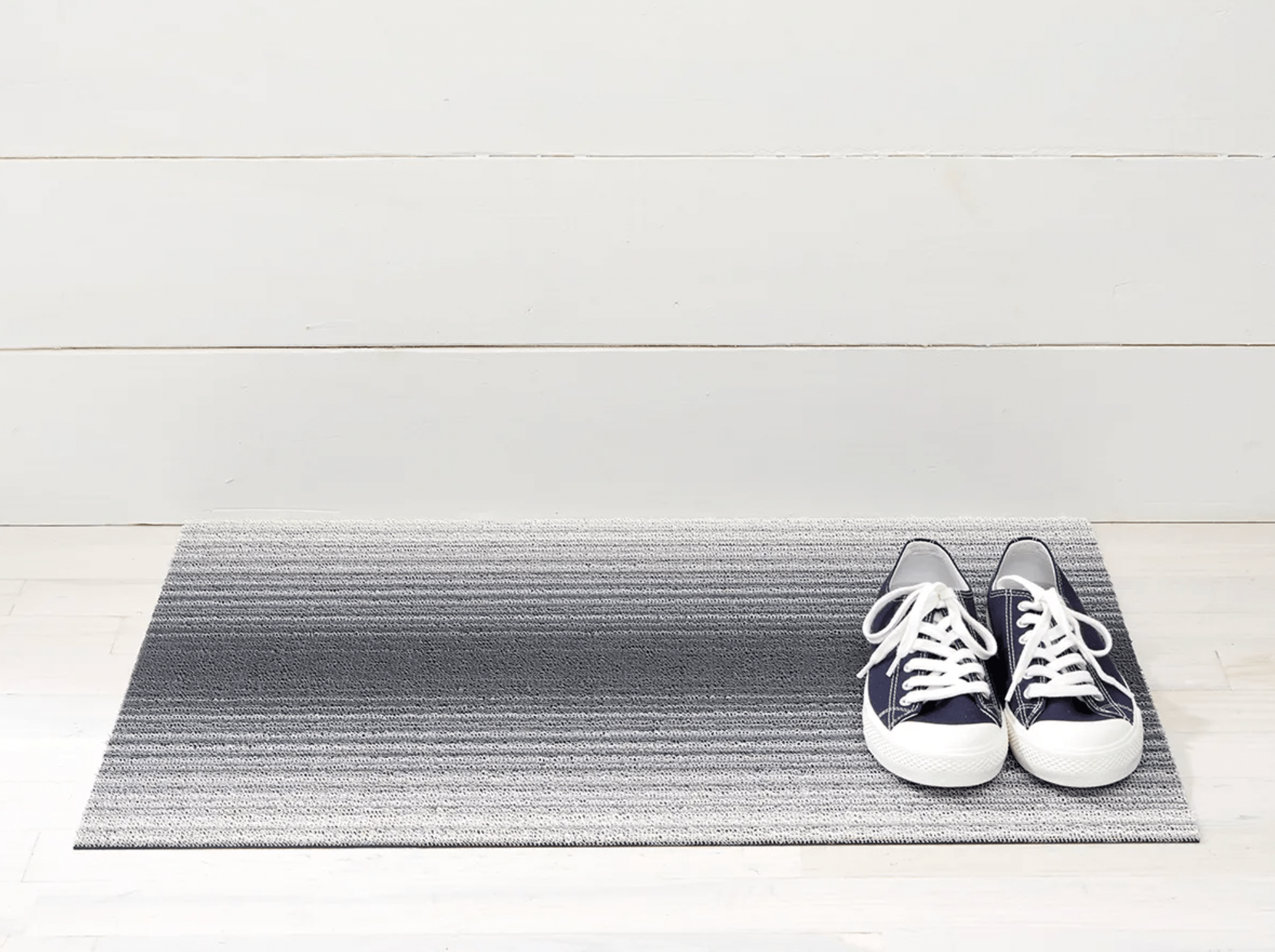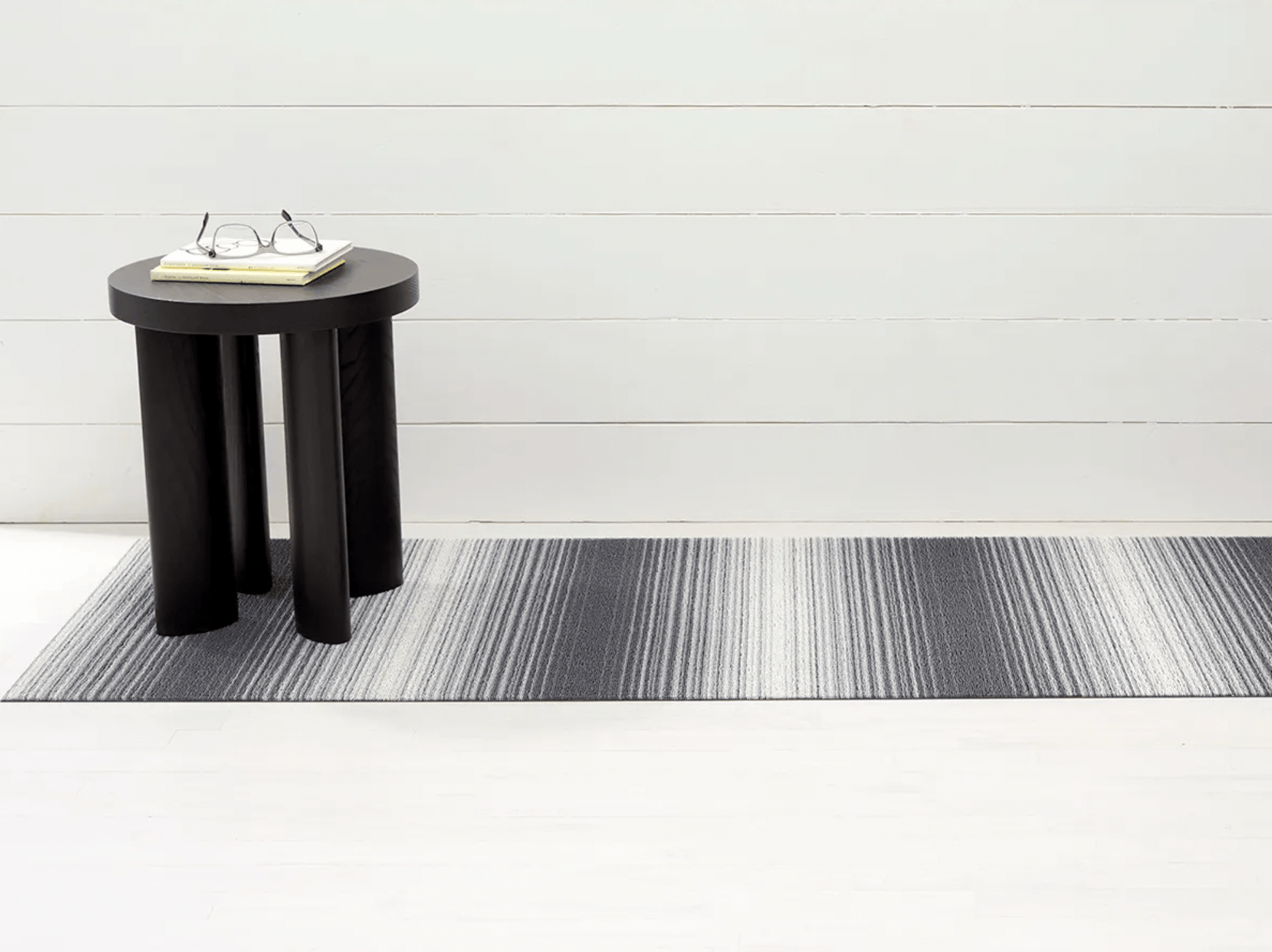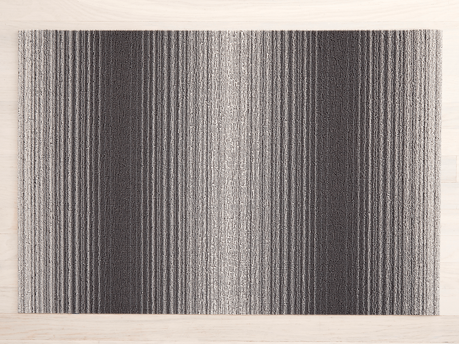 Inspired by the play of light and shadow created by shifting sunbeams, this easy-care floor mat redefines stripes through its dynamic ombré effect. Tufted bi-color yarns form fine lines of varying widths and intensities within a richly textured surface.