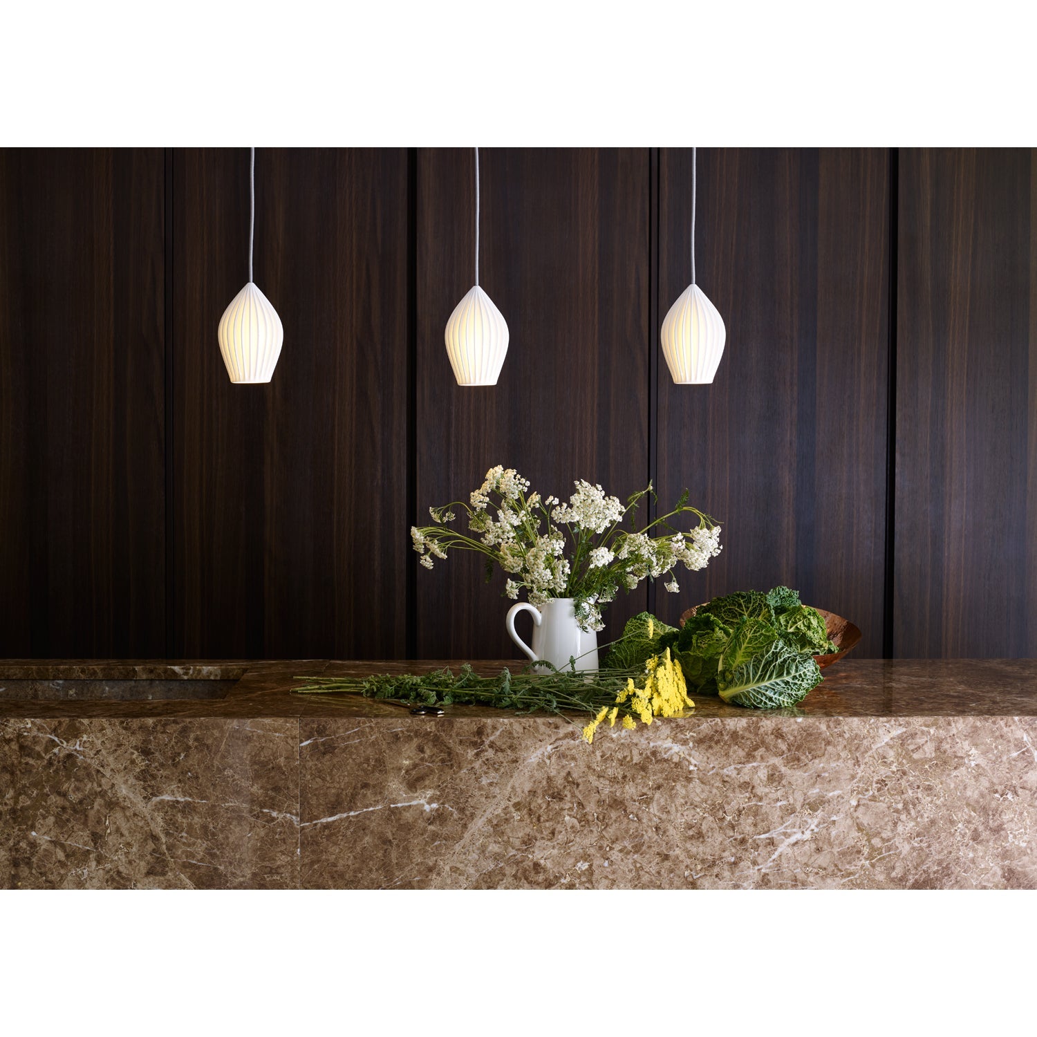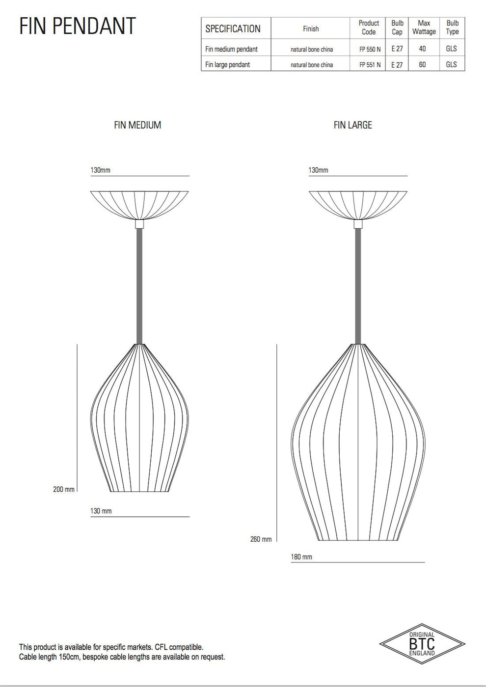 The Fin is an eye-catching Pendant Light, with a bone china shade that has been molded in to beautiful organic shapes, creating dramatic light and shade when lit. Available in two sizes, the lights have a matching bone china ceiling rose and Original BTC's trademark cotton braided cable.