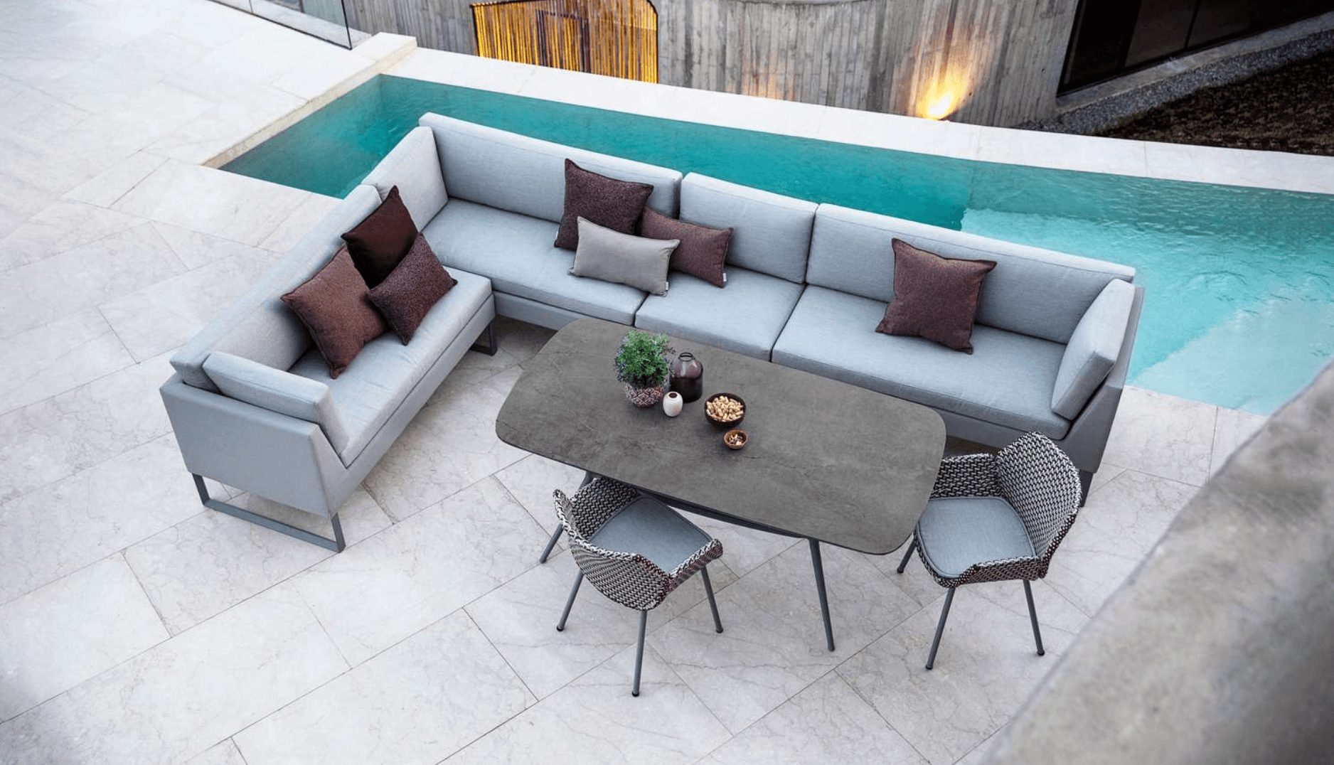 The Flex dining lounge sofa and modules are the ideal sofa for outdoor use where the same space is used for both dining and lounging. With its unique design and function, you can change the way Flex is used in a matter of seconds – from dining to lounge or vice versa. Flex is the essence of “life made comfortable”. Flex is a modular sofa system, which can be built to match any shape or size. You design your own dining lounge by combining the various elements. Flex is designed by the Cane-line design team. The Flex dining lounge sofa is available in grey Cane-line Tex® with Cane-line Natté cushions – the unique all-weather fabric, which can be used outdoors all year round with a minimum of maintenance.