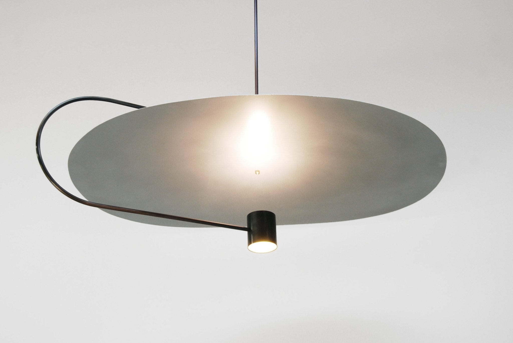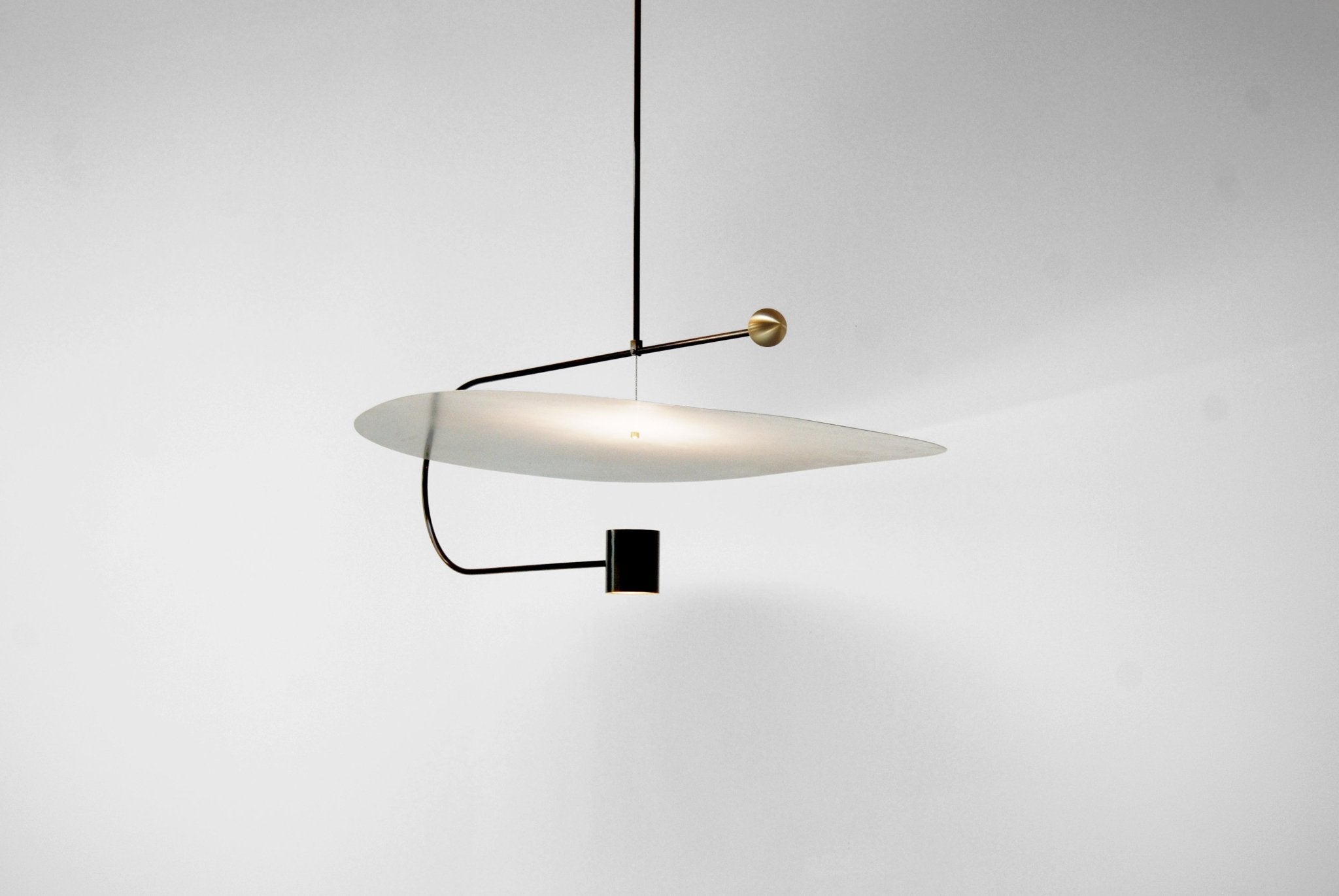 The L&G Float Wide Ceiling Pendant came from Dylan Davis and Jean Lee wanting to create a horizontal light installation that feels like it's floating rather than just hanging. The setup uses a wide matte aluminum shade (39 by 25 inches) suspended horizontally about 14 inches below your ceiling, with a brass sphere detail that breaks up the flat geometry. At 43 inches wide overall, this works over dining tables, in entryways, or as a statement piece in living rooms where you need distributed ambient lighting across width rather than focused downward from one point. The shade hangs from blackened metal hardware with a minimal 4.8-inch round canopy, so most of the visual presence comes from the shade itself rather than mounting components.