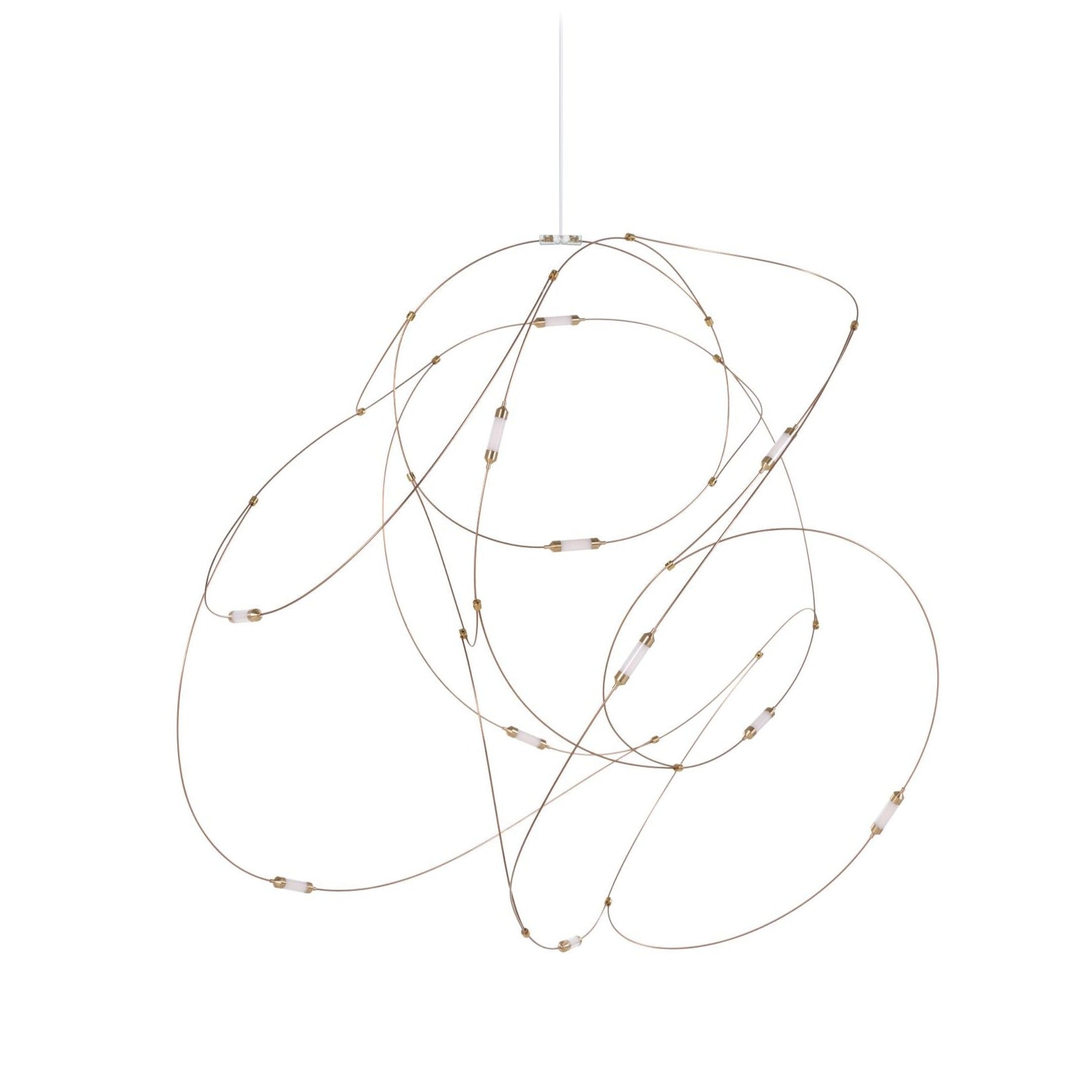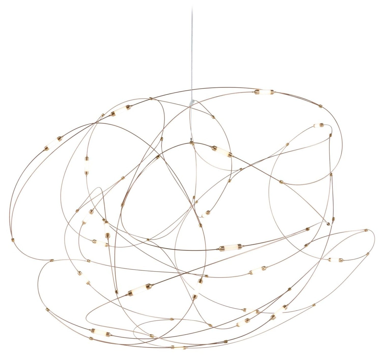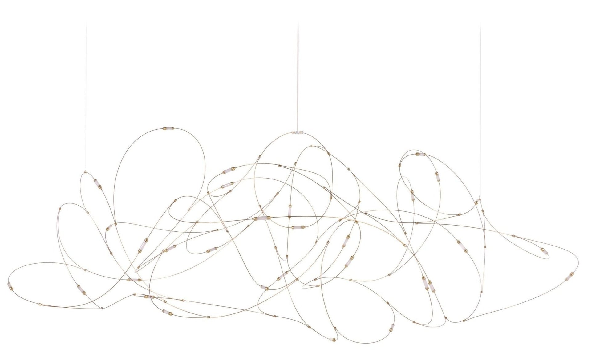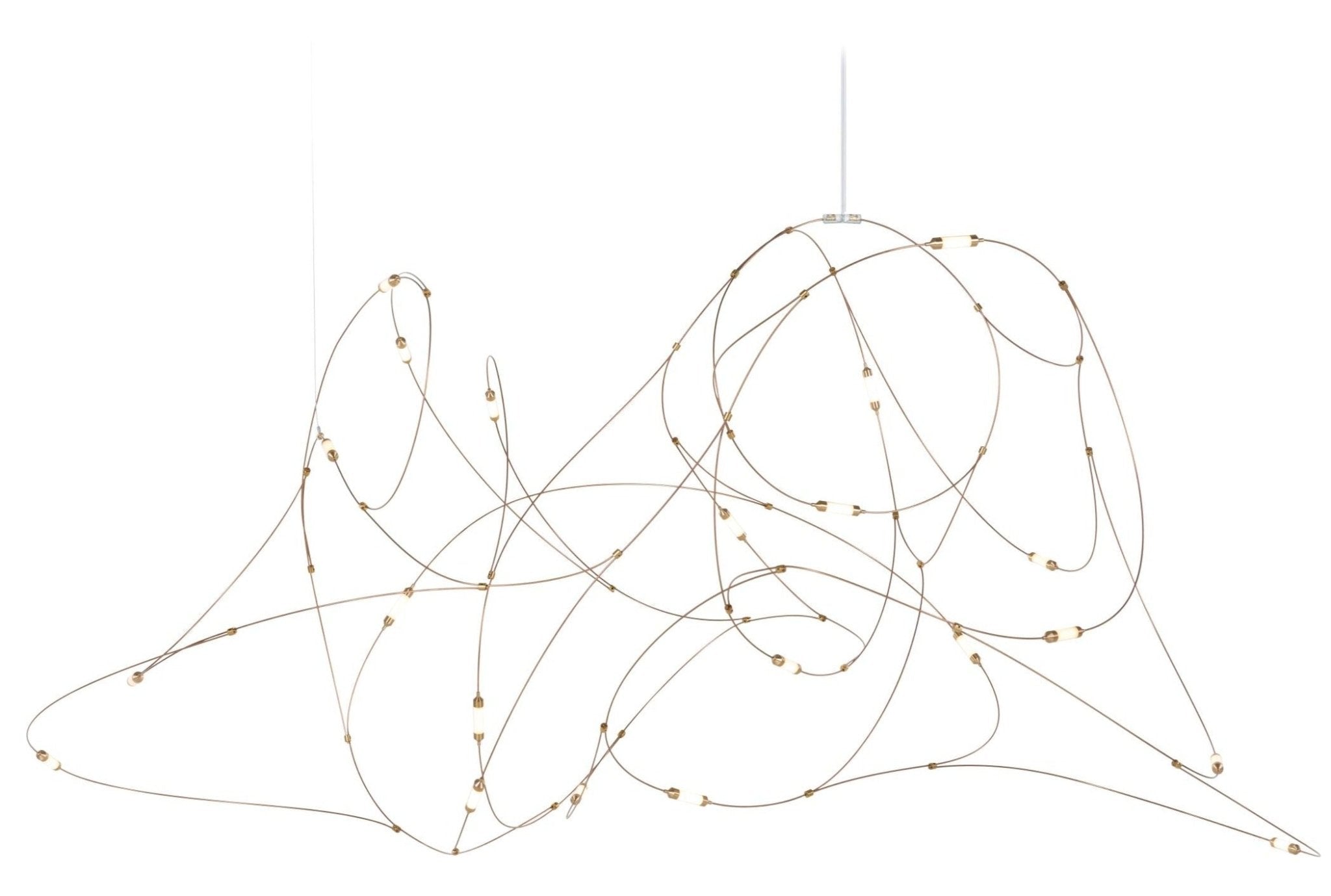 What makes this lamp really work is how it handles that balance between artistic installation and functional lighting that most statement pieces completely miss. The bronze wire construction allows the individual lights to appear suspended in space, creating this three-dimensional light sculpture that changes how you perceive the room from different angles. The brass cups and polycarbonate diffusers soften the LED output into something that feels organic and warm rather than harsh or clinical, while the dimmable functionality means you can adjust from full brightness for tasks down to subtle ambient glow for evening conversations. At dimensions ranging from 31.5 inches wide for the smallest to nearly 71 inches for the largest, it scales to different spaces while maintaining that delicate, almost weightless quality that makes it feel like captured magic rather than heavy fixture.