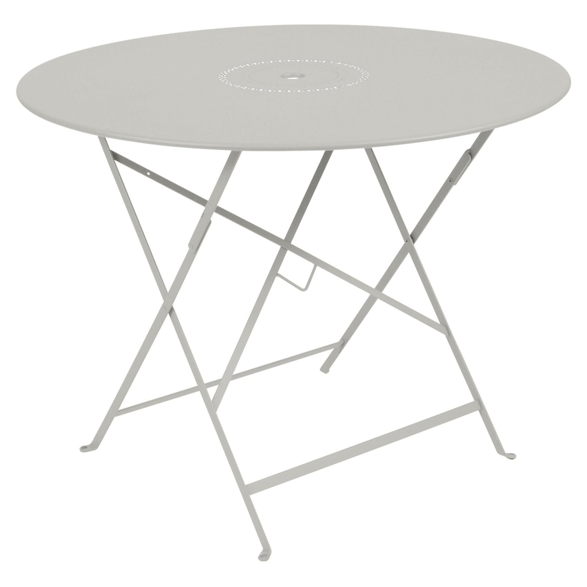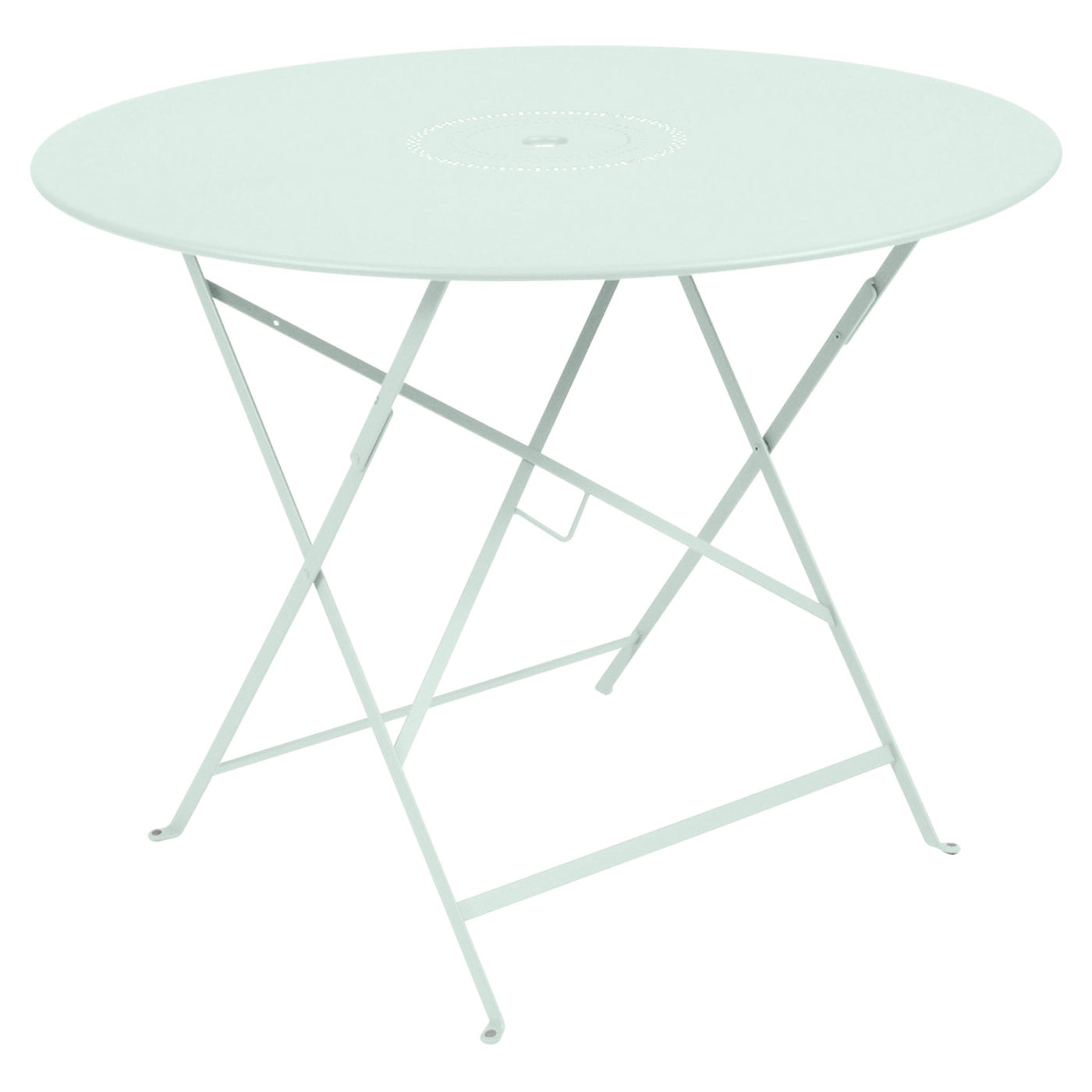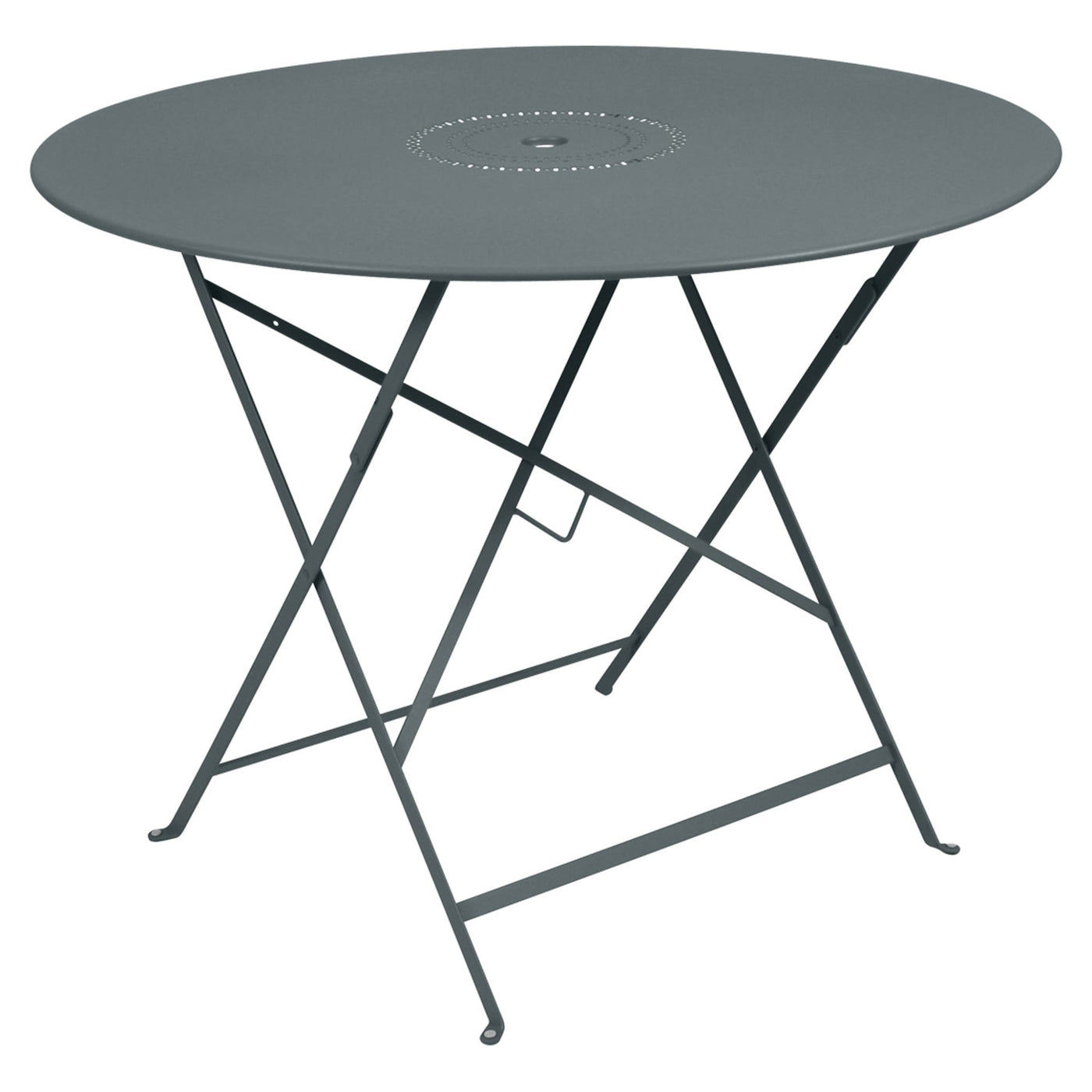 The 38" round folding Bistro table is made of lacquered steel and includes beautiful perforated detail in the table top, as well as a 1.5" umbrella hole. Seats 4 to 5 people.