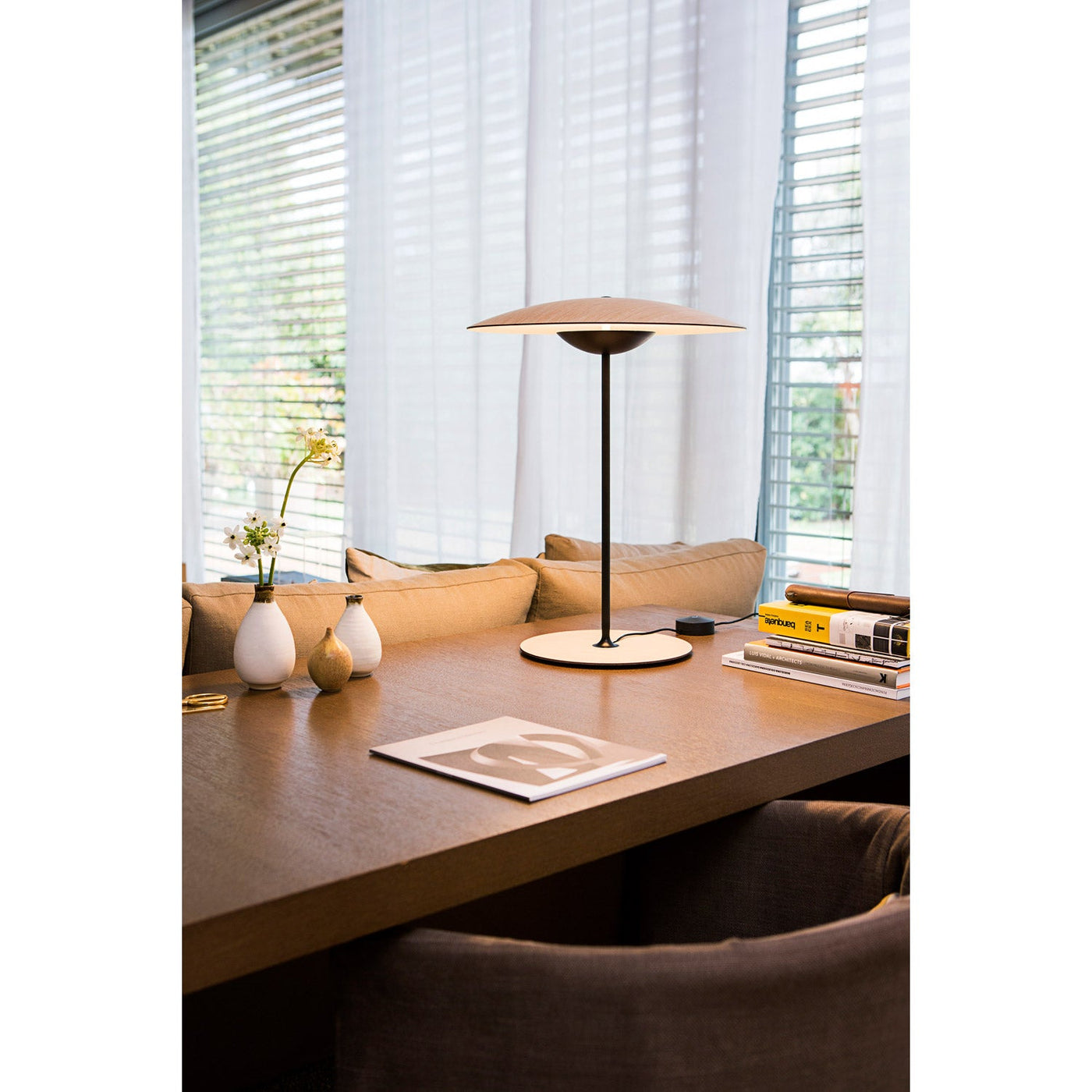The Marset Ginger Table Lamp - Plug and Cord beautifully blends natural materials with modern design. Made from pressed oak or wenge wood, it creates a warm, inviting glow. In addition, the sleek black matte metal stem complements any modern sofa or media console, making it a versatile lighting solution for various spaces.