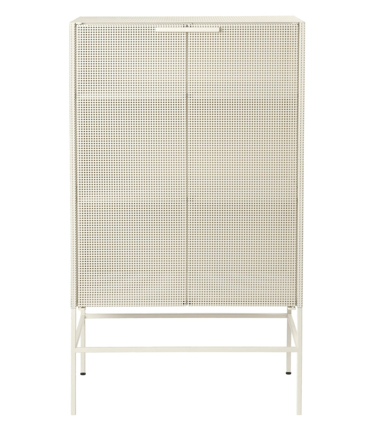 Crafted from semi-transparent plates of perforated steel, edged with a powder-coated beige frame the Grid Cabinet allows a brief view of the objects stored inside. This classic stationery cabinet / cupboard has three perforated steel shelves leaving enough room for a large number of your favorite items. The cabinet doors swing outwards from the center when opened. The doors are kept in place by a magnetic lock. The beige Grid Cabinet is ideally utilized for home organization – letting you display a handful of your most treasured objects in an elegant way. And why not display your wines and glassware in your modern kitchen environment. The Grid Cabinet is a large and solid storage unit ideal storage solution for the contemporary home. The Grid cabinet by Kristina Dam is truly a captivating cabinet piece with an outstanding functionality and striking design.