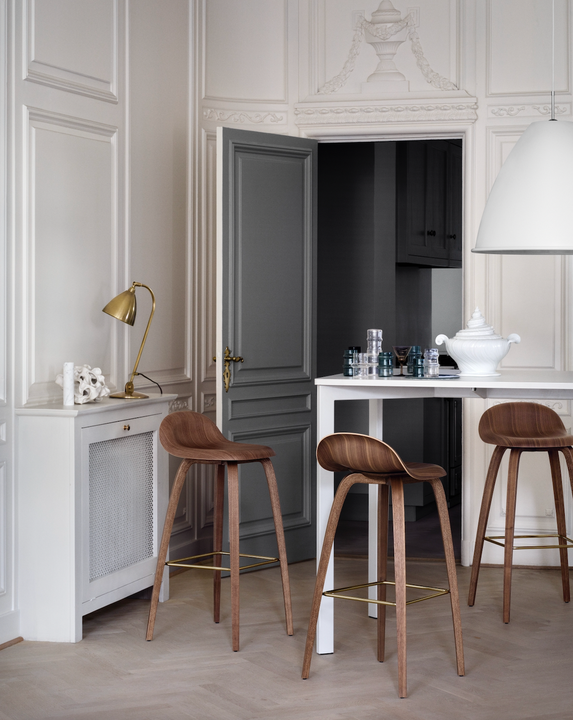 The first to use three-dimensional veneer molding techniques, Gubi revolutionized the classic stool. The 3D collection is a series designed to answer the needs of all bar and dining room seating. As part of that mission, the Gubi 3D Stool introduces the sleek silhouette and timeless versatility of the Gubi chair collection to gathering places around the world. This versatile stool invites the user to stay and get comfortable. Featuring a low backrest, the Gubi stool allows for movement and offers extended comfort with its formed beech, walnut, or oak shell seat. Additionally, the contemporary stool infuses both commercial and domestic bar areas with timeless, organic aesthetics. Equally minimalist and sculptural, the Gubi 3D Stool is available with either a center, sledge, or wood base. Thanks to its approachable form, lightweight construction, and Mid-Century expressions, the award-winning Gubi chair effortlessly pairs with its fellow 3D pieces and other GUBI furnishings.