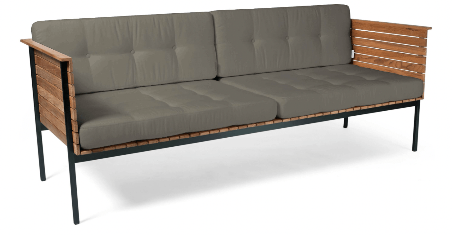 The Skagaarden Haringe Lounge Sofa combines clean geometry with timeless warmth. Its slatted teak seat rests on a powder-coated stainless steel frame, creating a refined contrast in materials. Meanwhile, the plush cushions feature subtle button details and hand-finished stitching. Whether placed beside a lounge chair or beneath ceiling lights, the Haringe Lounge Sofa makes a sophisticated statement indoors or out.