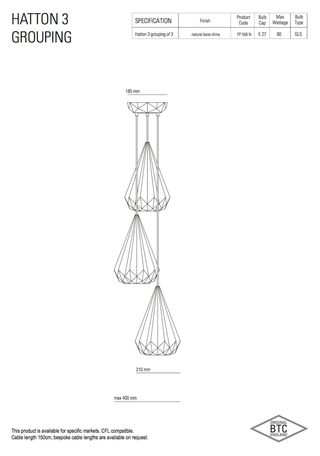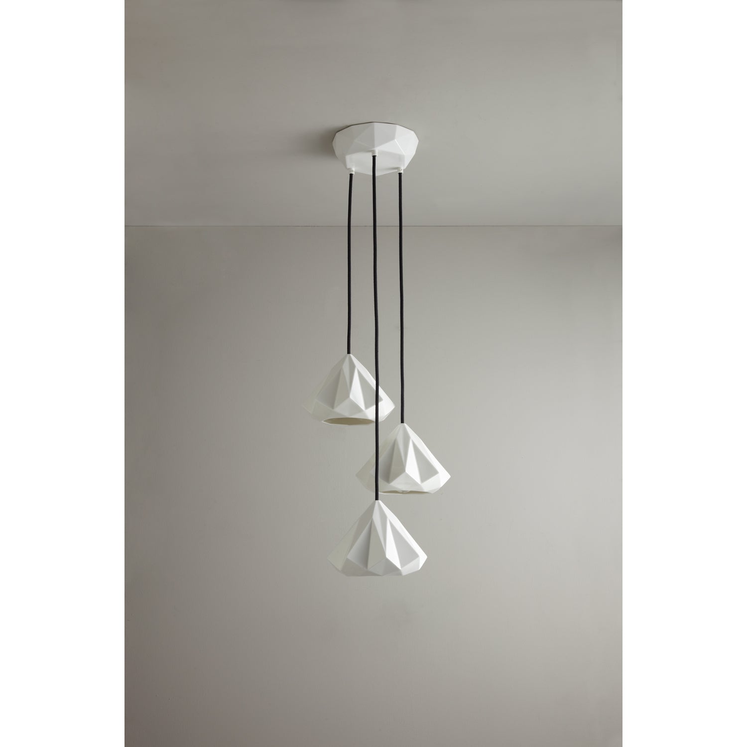 Hatton Pendant Lights have intricately beautiful bone china shades. Using highly skilled & labor intensive processes, bone china has been transformed in to multifaceted, symmetrical, gem-like forms. When switched off the lights have an angular sculptural beauty, and when switched on they provide warm, ambient lighting with dramatic lines and shadows. The lights are available in 5 different shade designs. Each have a complementing faceted bone china ceiling rose, with a contrasting black cotton braided cable, providing a contemporary edge. For a truly iconic statement piece, choose one of the Grouping of Three or Triangular Grouping styles.