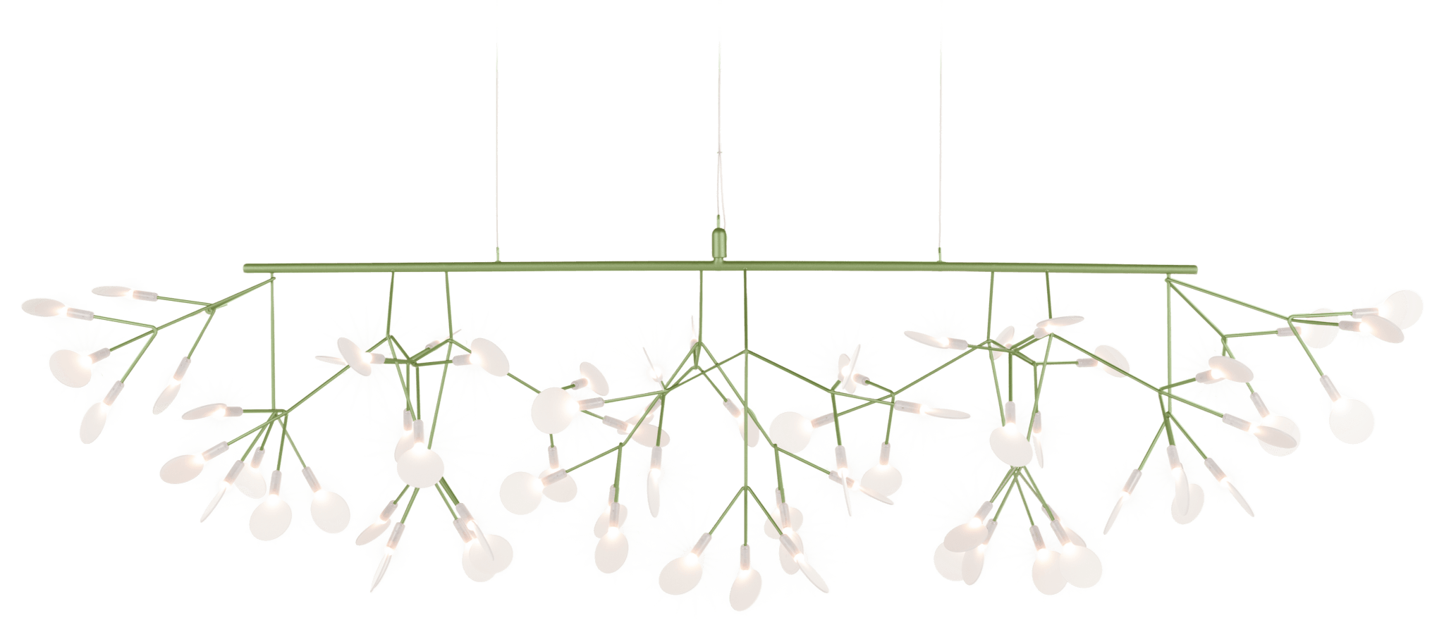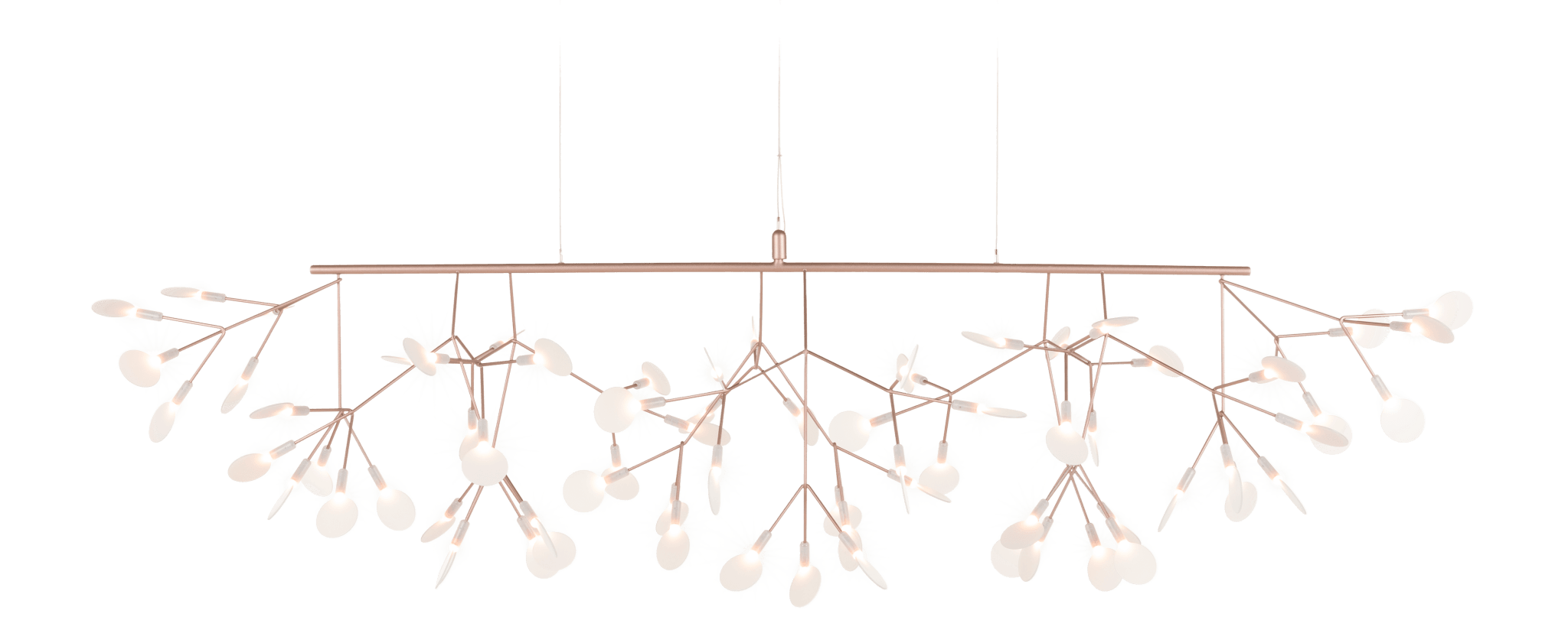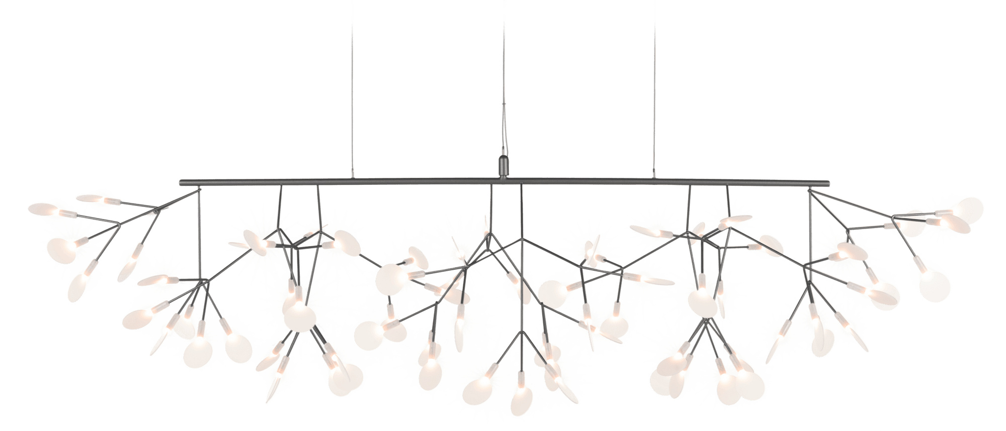 The Moooi Heracleum III Linear by Bertjan Pot brings the organic beauty of the Heracleum plant into a format that's purpose-built for rectangular spaces like dining tables and kitchen islands. The long, sleek frame extends horizontally with delicate branches sweeping upward on both sides, creating this graceful canopy of light that feels perfectly proportioned for intimate gatherings. Each white polycarbonate lens glows like a botanical specimen, powered by the innovative Electrosandwich® technology that eliminates visible wiring and keeps the entire structure looking clean and delicate. The upward-sweeping design means the light flows naturally across your table surface while the branches themselves become part of the visual appeal rather than just housing for bulbs.