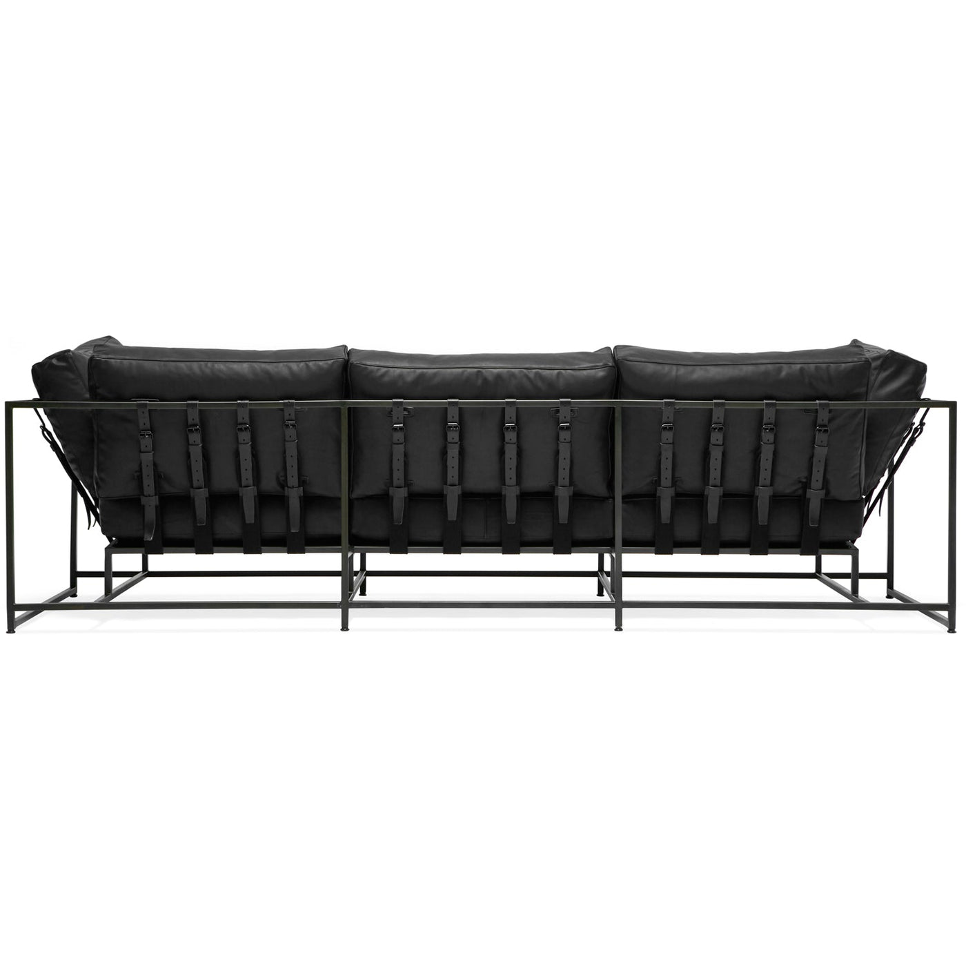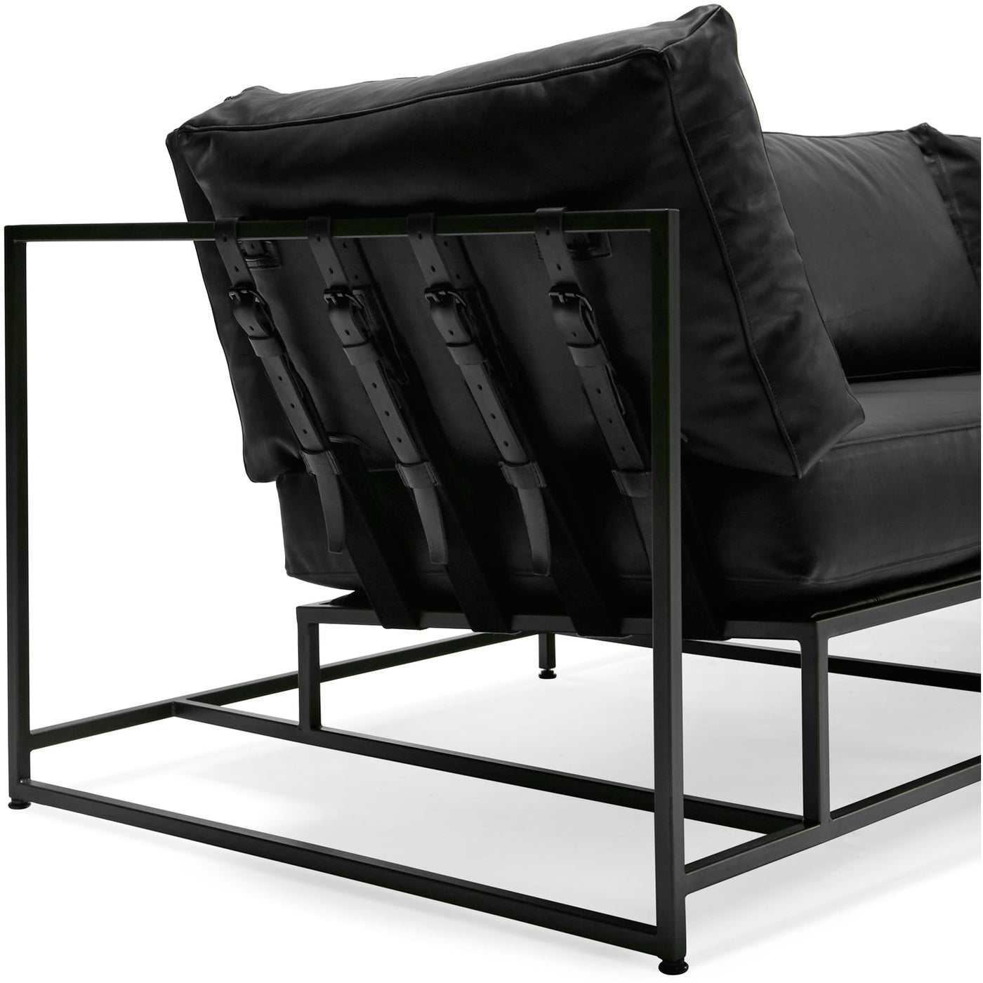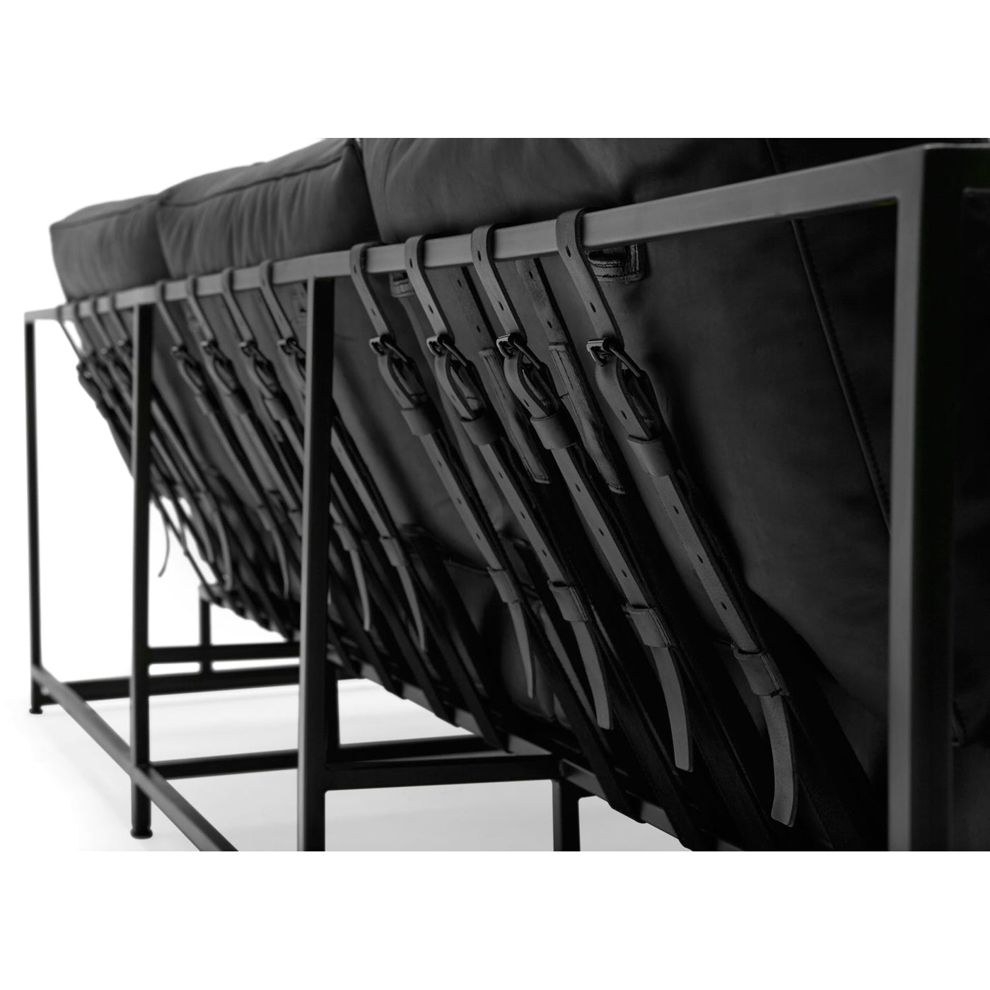The Inheritance Leather Sofa - Black Leather & Blackened Steel by Stephen Kenn combines minimalist style with strong materials. Its blackened steel frame pairs with durable black webbing and leather straps. The sofa’s soft black leather cushions add comfort. Therefore, this modern sofa fits well with lounge chairs, round coffee tables, and Scandinavian design elements. Overall, the Inheritance Leather Sofa - Black Leather & Blackened Steel is a timeless piece for any living room furniture collection.