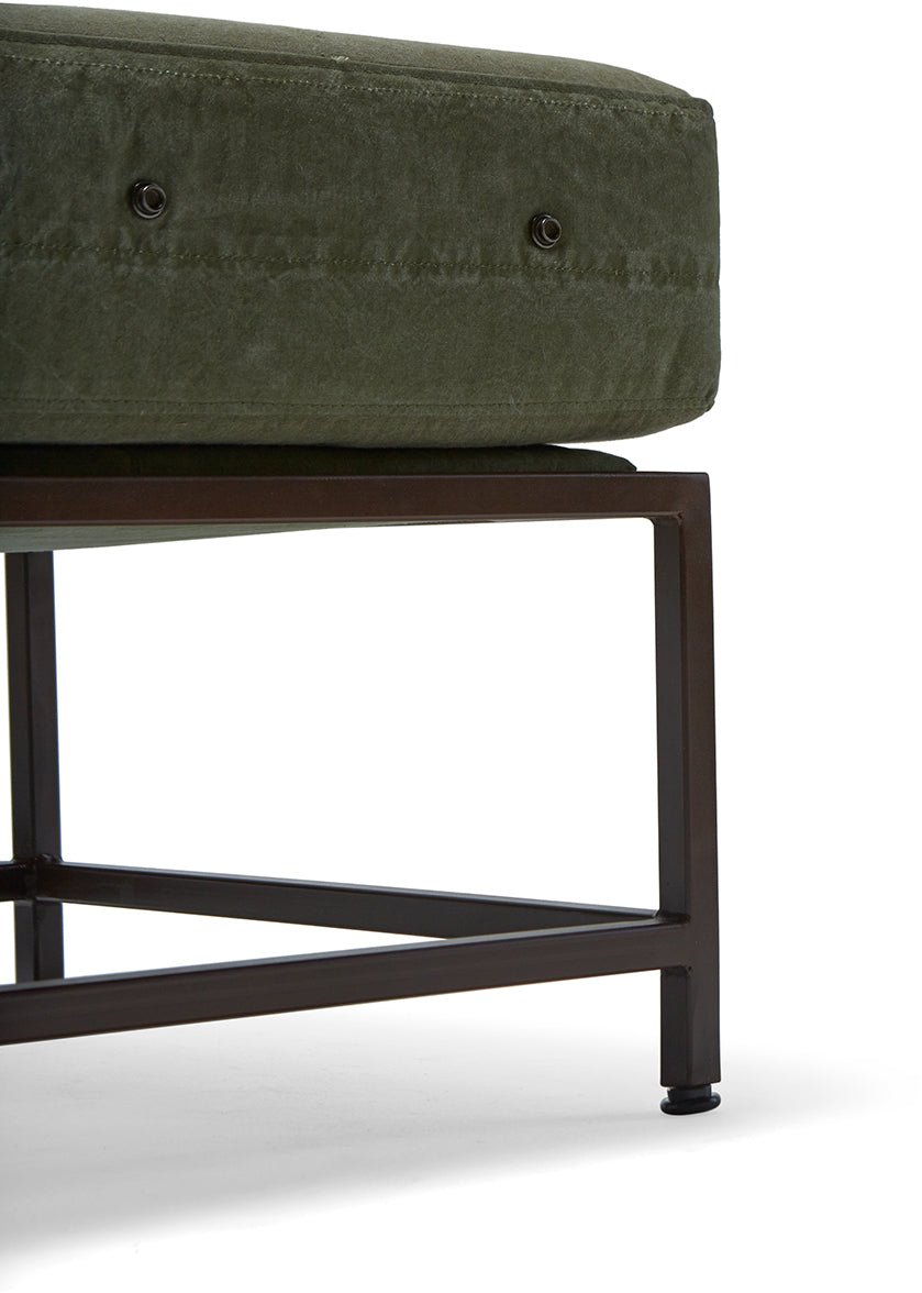 The Stephen Kenn Inheritance Ottoman - Military Canvas blends industrial design with authentic vintage materials. Handcrafted in Los Angeles, it features a sturdy metal frame wrapped in repurposed military canvas. Each ottoman shows unique texture and color variations that grow richer with time. Leather-reinforced straps add both durability and style. This ottoman pairs perfectly with modern furniture, lounge chairs, or living room furniture. Moreover, it complements a round coffee table or media console for a minimalist look.