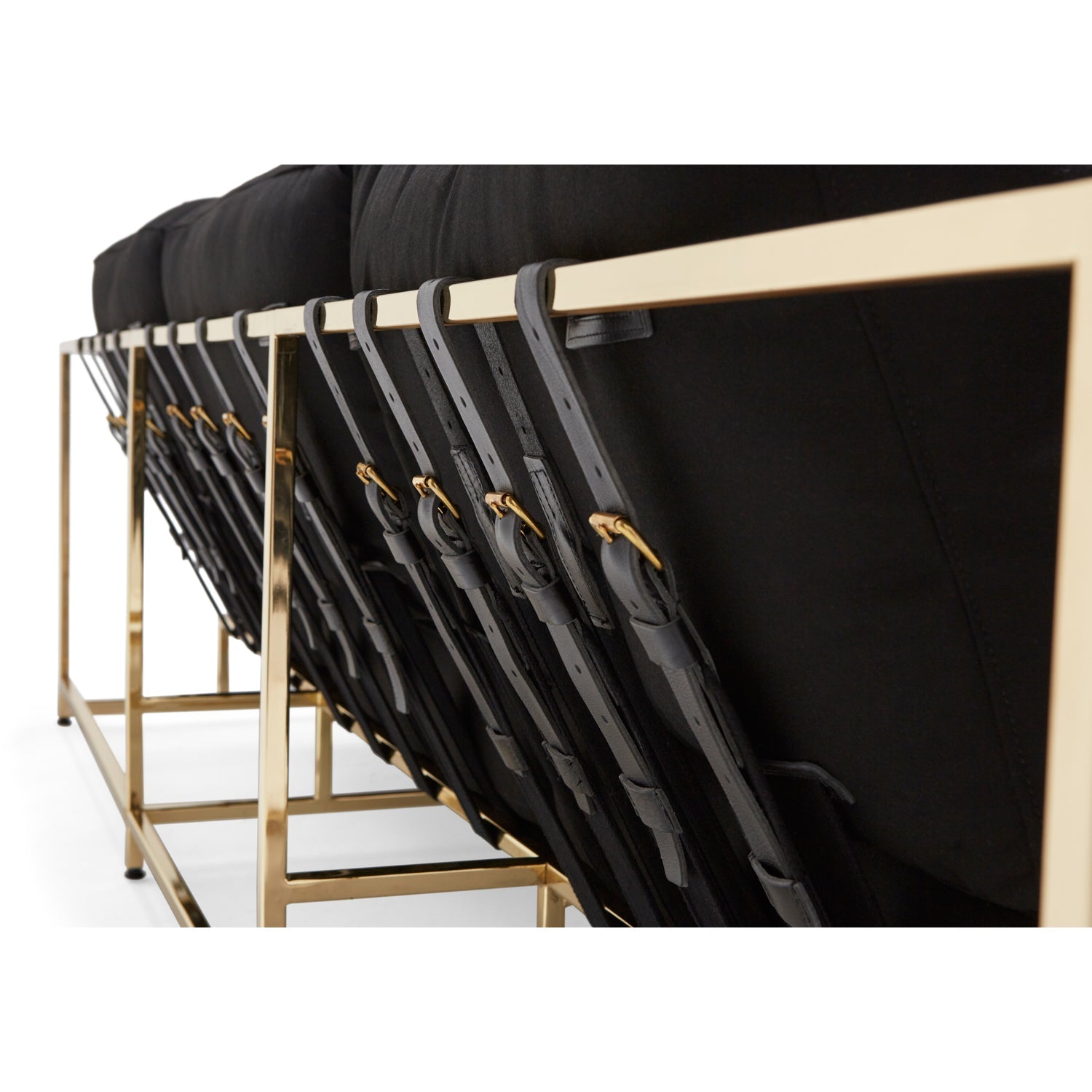 The Stephen Kenn Inheritance Sofa - Black Wool & Brass perfectly combines minimalist style with rugged durability. Featuring soft black wool cushions, black webbing, and leather belts, it adds rich texture to any space. Moreover, the polished brass frame brings a sleek, modern edge. Whether paired with a round coffee table or lounge chair, the Inheritance Sofa - Black Wool & Brass enhances your living room furniture with subtle Scandinavian design influences.