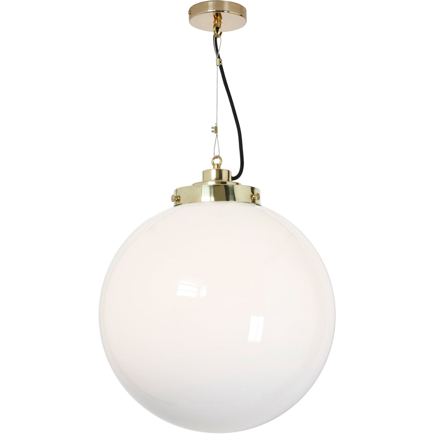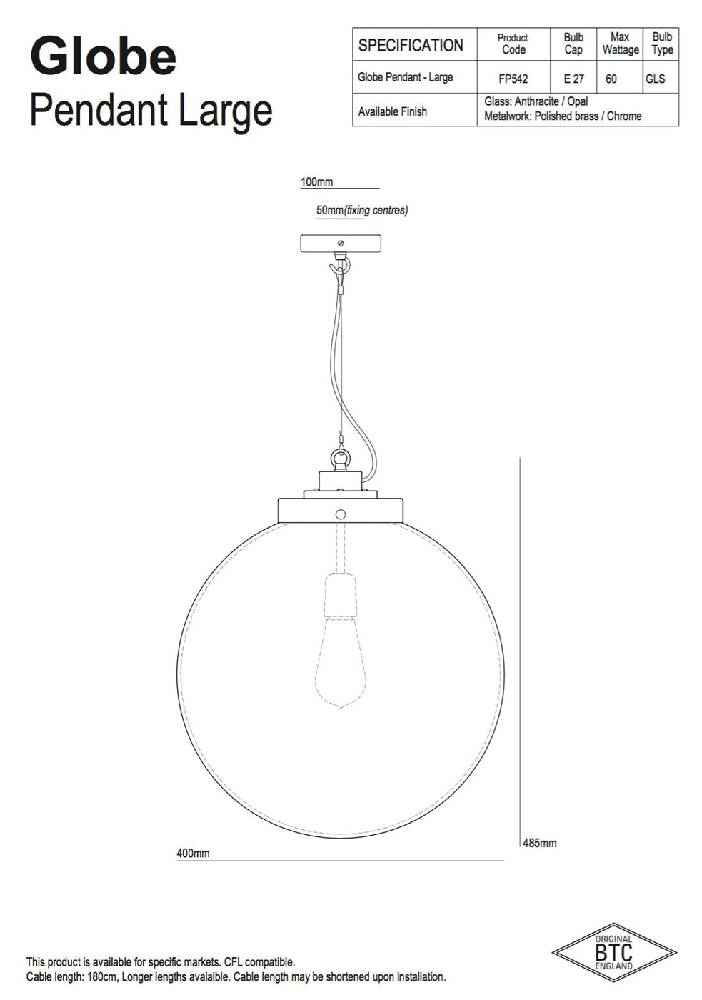 An elegant glass globe pendant light. Available in 3 different sizes and in various glass finishes and colors. Choose between an opal, anthracite, clear seedy or anthracite seedy glass shade, with polished chrome or brass metalwork. The exposed squirrel cage light bulb adds contemporary style and the black & white cotton braid cable complements the design.