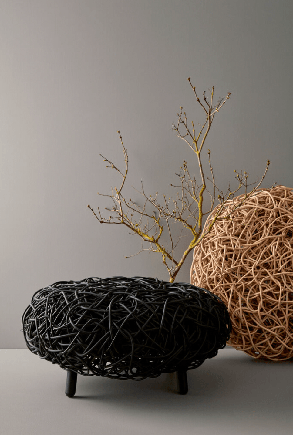 Loop is a modern and urban piece of furniture with a flexible use, either as a piece of art, a footstool, a coffee table or just for decoration. It is produced in rattan and comes in a black version and a natural version. Furniture produced in rattan can only be used indoors.